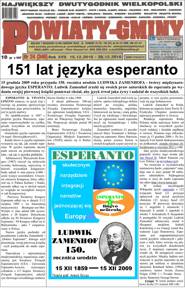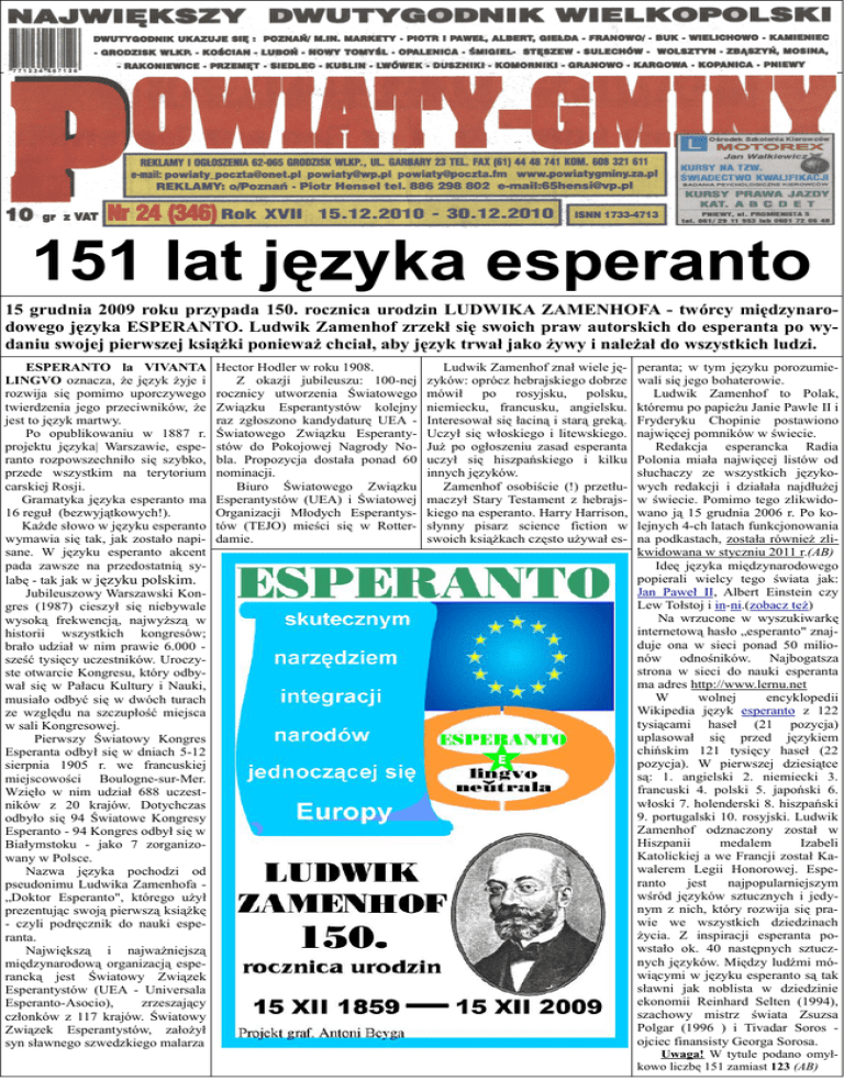 151 lat języka esperanto 15 grudnia 2009 roku przypada 150. rocznica urodzin LUDWIKA ZAMENHOFA - twórcy międzynarodowego języka ESPERANTO. Ludwik Zamenhof zrzekł się swoich praw autorskich do esperanta po wydaniu swojej pierwszej książki ponieważ chciał, aby język trwał jako żywy i należał do wszystkich ludzi. ESPERANTO la VIVANTA LINGVO oznacza, że język żyje i rozwija się pomimo uporczywego twierdzenia jego przeciwników, że jest to język martwy. Po opublikowaniu w 1887 r. projektu języka| Warszawie, esperanto rozpowszechniło się szybko, przede wszystkim na terytorium carskiej Rosji. Gramatyka języka esperanto ma 16 reguł (bezwyjątkowych!). Każde słowo w języku esperanto wymawia się tak, jak zostało napisane. W języku esperanto akcent pada zawsze na przedostatnią sylabę - tak jak w języku polskim. Jubileuszowy Warszawski Kongres (1987) cieszył się niebywale wysoką frekwencją, najwyższą w historii wszystkich kongresów; brało udział w nim prawie 6.000 sześć tysięcy uczestników. Uroczyste otwarcie Kongresu, który odbywał się w Pałacu Kultury i Nauki, musiało odbyć się w dwóch turach ze względu na szczupłość miejsca w sali Kongresowej. Pierwszy Światowy Kongres Esperanta odbył się w dniach 5-12 sierpnia 1905 r. we francuskiej miejscowości Boulogne-sur-Mer. Wzięło w nim udział 688 uczestników z 20 krajów. Dotychczas odbyło się 94 Światowe Kongresy Esperanto - 94 Kongres odbył się w Białymstoku - jako 7 zorganizowany w Polsce. Nazwa języka pochodzi od pseudonimu Ludwika Zamenhofa „Doktor Esperanto", którego użył prezentując swoją pierwszą książkę - czyli podręcznik do nauki esperanta. Największą i najważniejszą międzynarodową organizacją esperancką jest Światowy Związek Esperantystów (UEA - Universala Esperanto-Asocio), zrzeszający członków z 117 krajów. Światowy Związek Esperantystów, założył syn sławnego szwedzkiego malarza Hector Hodler w roku 1908. Z okazji jubileuszu: 100-nej rocznicy utworzenia Światowego Związku Esperantystów kolejny raz zgłoszono kandydaturę UEA Światowego Związku Esperantystów do Pokojowej Nagrody Nobla. Propozycja dostała ponad 60 nominacji. Biuro Światowego Związku Esperantystów (UEA) i Światowej Organizacji Młodych Esperantystów (TEJO) mieści się w Rotterdamie. Ludwik Zamenhof znał wiele języków: oprócz hebrajskiego dobrze mówił po rosyjsku, polsku, niemiecku, francusku, angielsku. Interesował się łaciną i starą greką. Uczył się włoskiego i litewskiego. Już po ogłoszeniu zasad esperanta uczył się hiszpańskiego i kilku innych języków. Zamenhof osobiście (!) przetłumaczył Stary Testament z hebrajskiego na esperanto. Harry Harrison, słynny pisarz science fiction w swoich książkach często używał es- peranta; w tym języku porozumiewali się jego bohaterowie. Ludwik Zamenhof to Polak, któremu po papieżu Janie Pawle II i Fryderyku Chopinie postawiono najwięcej pomników w świecie. Redakcja esperancka Radia Polonia miała najwięcej listów od słuchaczy ze wszystkich językowych redakcji i działała najdłużej w świecie. Pomimo tego zlikwidowano ją 15 grudnia 2006 r. Po kolejnych 4-ch latach funkcjonowania na podkastach, została również zlikwidowana w styczniu 2011 r.(AB) Ideę języka międzynarodowego popierali wielcy tego świata jak: Jan Paweł II, Albert Einstein czy Lew Tołstoj i in-ni.(zobacz też) Na wrzucone w wyszukiwarkę internetową hasło „esperanto" znajduje ona w sieci ponad 50 milionów odnośników. Najbogatsza strona w sieci do nauki esperanta ma adres http://www.lernu.net W wolnej encyklopedii Wikipedia język esperanto z 122 tysiącami haseł (21 pozycja) uplasował się przed językiem chińskim 121 tysięcy haseł (22 pozycja). W pierwszej dziesiątce są: 1. angielski 2. niemiecki 3. francuski 4. polski 5. japoński 6. włoski 7. holenderski 8. hiszpański 9. portugalski 10. rosyjski. Ludwik Zamenhof odznaczony został w Hiszpanii medalem Izabeli Katolickiej a we Francji został Kawalerem Legii Honorowej. Esperanto jest najpopularniejszym wśród języków sztucznych i jedynym z nich, który rozwija się prawie we wszystkich dziedzinach życia. Z inspiracji esperanta powstało ok. 40 następnych sztucznych języków. Między ludźmi mówiącymi w języku esperanto są tak sławni jak noblista w dziedzinie ekonomii Reinhard Selten (1994), szachowy mistrz świata Zsuzsa Polgar (1996 ) i Tivadar Soros ojciec finansisty Georga Sorosa. Uwaga! W tytule podano omyłkowo liczbę 151 zamiast 123 (AB)