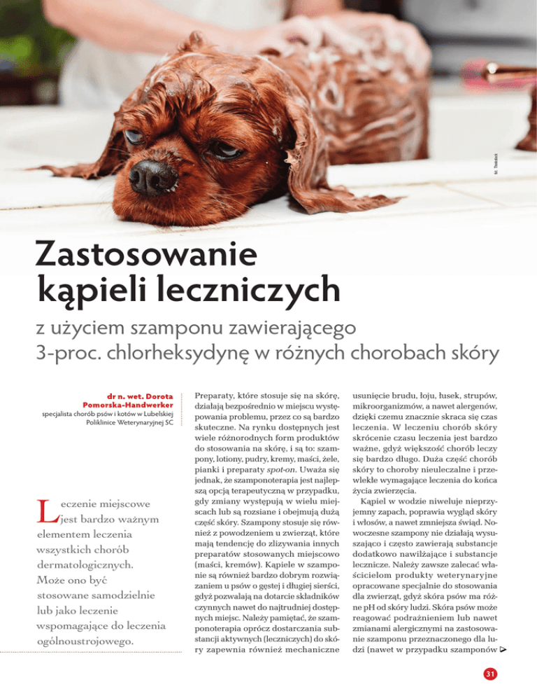 V e t- Pi el ęgn a cja fot. Thinkstock 2/2014 Zastosowanie kąpieli leczniczych z użyciem szamponu zawierającego 3-proc. chlorheksydynę w różnych chorobach skóry dr n. wet. Dorota Pomorska-Handwerker specjalista chorób psów i kotów w Lubelskiej Poliklinice Weterynaryjnej SC L eczenie miejscowe jest bardzo ważnym elementem leczenia wszystkich chorób dermatologicznych. Może ono być stosowane samodzielnie lub jako leczenie wspomagające do leczenia ogólnoustrojowego. Preparaty, które stosuje się na skórę, działają bezpośrednio w miejscu występowania problemu, przez co są bardzo skuteczne. Na rynku dostępnych jest wiele różnorodnych form produktów do stosowania na skórę, i są to: szampony, lotiony, pudry, kremy, maści, żele, pianki i preparaty spot-on. Uważa się jednak, że szamponoterapia jest najlepszą opcją terapeutyczną w przypadku, gdy zmiany występują w wielu miejscach lub są rozsiane i obejmują dużą część skóry. Szampony stosuje się również z powodzeniem u zwierząt, które mają tendencję do zlizywania innych preparatów stosowanych miejscowo (maści, kremów). Kąpiele w szamponie są również bardzo dobrym rozwiązaniem u psów o gęstej i długiej sierści, gdyż pozwalają na dotarcie składników czynnych nawet do najtrudniej dostępnych miejsc. Należy pamiętać, że szamponoterapia oprócz dostarczania substancji aktywnych (leczniczych) do skóry zapewnia również mechaniczne usunięcie brudu, łoju, łusek, strupów, mikroorganizmów, a nawet alergenów, dzięki czemu znacznie skraca się czas leczenia. W leczeniu chorób skóry skrócenie czasu leczenia jest bardzo ważne, gdyż większość chorób leczy się bardzo długo. Duża część chorób skóry to choroby nieuleczalne i przewlekłe wymagające leczenia do końca życia zwierzęcia. Kąpiel w wodzie niweluje nieprzyjemny zapach, poprawia wygląd skóry i włosów, a nawet zmniejsza świąd. Nowoczesne szampony nie działają wysuszająco i często zawierają substancje dodatkowo nawilżające i substancje lecznicze. Należy zawsze zalecać właścicielom produkty weterynaryjne opracowane specjalnie do stosowania dla zwierząt, gdyż skóra psów ma różne pH od skóry ludzi. Skóra psów może reagować podrażnieniem lub nawet zmianami alergicznymi na zastosowanie szamponu przeznaczonego dla ludzi (nawet w przypadku szamponów 31 V e t-Pi elęgnacja hipoalergicznych dla dzieci). Szamponoterapia jest w większości przypadków łatwa do przeprowadzenia, a przy prawidłowym doborze szamponu bardzo rzadko występują efekty uboczne w postaci podrażnień lub alergii kontaktowych. Kolejnym ważnym kryterium, które przemawia za zastosowaniem szamponu w przypadku np. ropnych zapaleń skóry, jest koszt leczenia. Leczenie takie będzie na pewno tańsze od leczenia antybiotykami w tabletkach, które trwa przeważnie kilka tygodni. Jaki szampon wybrać? Na rynku dostępnych jest obecnie wiele różnorodnych szamponów. Zarówno lekarze weterynarii, jak i technicy weterynarii oraz personel pomocniczy mogą mieć problem z doborem odpowiedniego szamponu do danego problemu dermatologicznego. Dlatego w przypadku wątpliwości należy skonsultować się z lekarzem specjalizującym się w dermatologii. Szampony lecznicze zawierają wiele substancji czynnych. Prawidłowo dobrane będą pomocne w leczeniu chorób skóry – dobrane nieprawidłowo mogą podrażnić skórę i nawet zaostrzyć objawy choroby. Dlatego przed kąpielą punktem kluczowym są poznanie składu szamponu leczniczego i znajomość najważniejszych substancji czynnych, które dobiera się w zależności od istniejącego problemu. Szampony lecznicze mogą zawierać przykładowo: nadtlenek benzoilu, mleczan etylu, wyciąg z owsa, pantenol, mentol, alantoinę, glicerynę, chlorheksydynę, siarkę, kwas salicylowy, triklosan, mikonazol, jodofory, selen, dziegieć czy biosiarkę. Szampony z nadtlenkiem benzoilu stosuje się w przypadku głębokich ropnych zapaleń skóry i nużycy, jednak po zastosowaniu ich na skórę atopową (alergiczną) można wywołać silne podrażnienie. W atopowym zapaleniu skóry stosuje się szampony o działaniu przeciwświądowym i nawilżającym, zawierające na przykład wyciąg z owsa, alantoinę i glicerynę. W przypadku łojotoków najskuteczniejsze są szampony zawierające siarkę i kwas salicylowy. Jednak substancją najczęściej stosowaną obecnie w szamponach weterynaryjnych jest chlorheksydyna. Jest ona zawarta w szamponach antyseptycznych, 32 VET Personel stosowanych w leczeniu powierzchniowych ropnych zapaleń skóry oraz zakażeń drożdżakami Malassezia. Co to jest chlorheksydyna? Chlorheksydyna jest organicznym związkiem chemicznym, syntetycznym antyseptykiem. Stosowana w postaci glukonianu lub octanu działa silnie na bakterie Gram-dodatnie, natomiast słabiej na Gram-ujemne. W medycynie ludzkiej jest używana głównie jako środek odkażający skórę, błony śluzowe, rany oraz narzędzia chirurgiczne. Jej działanie przeciwbakteryjne (bakteriostatyczne i bakteriobójcze) polega na uszkadzaniu błony komórkowej bakterii prowadzące do zwiększenia jej przepuszczalności. Chlorheksydyna 2-4% jest skuteczna przeciwko większości bakterii i drożdżaków (Malassezia) obecnych na skórze. Chlorheksydyna ma działanie synergistyczne z mikonazolem. Ma bardzo niewielką toksyczność i jest bardzo bezpieczna w stosowaniu. Kiedy zastosować szampon zawierający chlorheksydynę? Szampony zawierające chlorheksydynę mają bardzo wiele zastosowań. Kąpiele w szamponach z 3-proc. chlorheksydyną są zalecane w przypadku większości bakteryjnych chorób skóry. Można je stosować w powierzchownych, powierzchniowych i głębokich ropnych zapaleniach skóry. Są również bardzo skuteczne w leczeniu zakażeń drożdżakowych na tle Malassezia. Są bezpieczne w stosowaniu u psów cierpiących na choroby alergiczne, np. atopowe zapalenie skóry. Ropne zapalenia skóry 