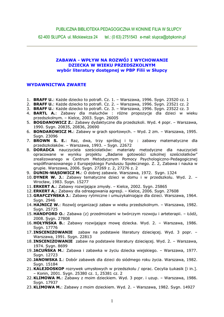 PUBLICZNA BIBLIOTEKA PEDAGOGICZNA W KONINIE FILIA W SŁUPCY 62-400 SŁUPCA ul. Mickiewicza 24 tel.: (0 63) 2751543 e-mail: [email protected] ZABAWA - WPŁYW NA ROZWÓJ I WYCHOWANIE DZIECKA W WIEKU PRZEDSZKOLNYM wybór literatury dostępnej w PBP Filii w Słupcy WYDAWNICTWA ZWARTE 1. 2. 3. 4. BRAFF U.: Każde dziecko to potrafi. Cz. 1. – Warszawa, 1996. Sygn. 23520 cz. 1 BRAFF U.: Każde dziecko to potrafi. Cz. 2. – Warszawa, 1996. Sygn. 23521 cz. 2 BRAFF U.: Każde dziecko to potrafi. Cz. 3. – Warszawa, 1996. Sygn. 23522 cz. 3 BARTL A.: Zabawy dla maluchów : różne propozycje dla dzieci w wieku przedszkolnym. – Kielce, 2003. Sygn. 26005 5. BOGDANOWICZ Z.: Zabawy dydaktyczne dla przedszkoli. Wyd. 4 popr. – Warszawa, 1990. Sygn. 20835, 20836, 20690 6. BONDAROWICZ M.: Zabawy w grach sportowych. – Wyd. 2 zm. – Warszawa, 1995. Sygn. 23096 7. BROWN S. E.: Raz, dwa, trzy spróbuj i ty : zabawy matematyczne dla przedszkolaków. – Warszawa, 1993. – Sygn. 22672 8. DORADCA nauczyciela sześciolatków: materiały metodyczne dla nauczycieli opracowane w wyniku projektu „Badanie gotowości szkolnej sześciolatków” zrealizowanego w Centrum Metodycznym Pomocy Psychologiczno-Pedagogicznej współfinansowanego z Europejskiego Funduszu Społecznego. Z. 2, Zabawa i nauka w grupie. Warszawa, 2006. Sygn. 27269 z. 2, 27276 z. 2 9. DUNIN-WĄSOWICZ M.: O dobrej zabawie. Warszawa, 1972. Sygn. 1324 10. DYNER W. J.: Zabawy tematyczne dzieci w domu i w przedszkolu. Wyd. 2. – Wrocław, 1983. Sygn. 15277 11. ERKERT A.: Zabawy rozwijające zmysły. – Kielce, 2002. Sygn. 25865 12. ERKERT A.: Zabawy dla odreagowania agresji. – Kielce, 2006. Sygn. 27608 13. GRAFCZYŃSKA J.: Zabawy rytmiczne i umuzykalniające dla dzieci. Warszawa, 1964. Sygn. 2946 14. HAJNICZ W.: Rozwój organizacji zabaw w wieku przedszkolnym. – Warszawa, 1982. Sygn. 25725 15. HANDFORD O.: Zabawa (z) przedmiotami w twórczym rozwoju i arteterapii. – Łódź, 2008. Sygn. 27808 16. HOŁYŃSKA B.: Zabawy rozwijające mowę dziecka. Wyd. 2. – Warszawa, 1986. Sygn. 17776 17. INSCENIZOWANIE zabaw na podstawie literatury dziecięcej. Wyd. 3 popr. – Warszawa, 1991. Sygn. 22813 18. INSCENIZOWANIE zabaw na podstawie literatury dziecięcej. Wyd. 2. – Warszawa, 1974. Sygn. 8699 19. JACUŃSKA M.: Zabawa i zabawka w życiu dziecka wiejskiego. – Warszawa, 1977. Sygn. 12723 20. JANOWSKA I.: Dobór zabawek dla dzieci do siódmego roku życia. Warszawa, 1982. Sygn. 15184 21. KALEJDOSKOP rozrywek umysłowych w przedszkolu / oprac. Cecylia Łukasik [i in.]. – Konin, 2001. Sygn. 25380 cz. 1, 25381 cz. 2 22. KLIMOWA M.: Zabawy z moim dzieckiem. Wyd. 3 popr. i uzup. – Warszawa, 1986. Sygn. 17937 23. KLIMOWA M.: Zabawy z moim dzieckiem. Wyd. 2. – Warszawa, 1982. Sygn. 14927 1 24. KRÓLICA M.: Drama i happening w edukacji przedszkolnej. Wyd. 2. – Kraków, 2009. Sygn. 28145 25. KRUK H.: Wybór literatury do zabaw i zajęć w przedszkolu z komentarzem metodycznym. Wyd. 3. – Warszawa, 1990. Sygn. 20643 26. KRZYSZTOSZEK Z.: Zabawa, praca i nauka w przedszkolu (z badań eksperymentalnych). – Warszawa, 1960. Sygn. 2034 27. LEHNERT G.: Zabawa w sport z maluchami. – Warszawa, 1978. Sygn. 12771 28. ŁUBKOWSKA K.: Zrobimy to sami: projekty i wzory do zabaw i zajęć konstrukcyjnoplastycznych wychowania przedszkolnego. Wyd. 3. – Warszawa, 1987. Sygn. 19061 29. MERŻAN I.: Zabawy, zabawki, dzieci. – Warszawa, 1967. Sygn. 4192 30. MOROZ H.: Nasza matematyka : zabawy i gry dydaktyczne. – Warszawa, 1991. Sygn. 21133 31. OKOŃ W.: Zabawa a rzeczywistość. Warszawa, 1987. Sygn. 18727, 18729 32. PORTMANN R.: Zabawy rozwijające inteligencję. – Kielce, 2003. Sygn. 25863 33. RYMKIEWICZ A.: Zabawa w teatr: widowisko dziecięce. – Warszawa, 1969. Sygn. 5353 34. SMOCZYŃSKA-NACHTAMAN U.: Podajmy sobie ręce! : piosenki dziecięce różnych narodów z zabawami. – Warszawa, 1989. Sygn. 21197 35. SMOCZYŃSKA-NACHTAMAN U.: Zabawy i ćwiczenia przy muzyce. – Warszawa, 1978. Sygn. 1999, 13000 36. SMOCZYŃSKA-NACHTAMAN U.: Rozśpiewane przedszkole. Wyd. 3. – Warszawa, 1992. Sygn. 21291 37. STANKIEWICZ B.: Zabawy twórcze i widowiska lalkowe w wychowaniu przedszkolnym. Wyd. 3 popr. – Warszawa, 1979. Sygn. 25722 38. STO pomysłów zabaw i zajęć z „Domowego Przedszkola” / aut. Irena Dudziński [i in.]. – Warszawa, 21300 39. TRZEŚNIOWAKI R.: Zabawa w życiu i rozwoju dziecka. – Warszawa, 1956. Sygn. 349 40. WIEMAN M.: A czy wy tak potraficie? : piosenki, zabawy i tańce dla dzieci w wieku 3-7 lat. Wyd. 2. – Warszawa, 20642 41. WOŹNIAK J.: Zabawy ruchowe ze śpiewem i muzyką dla przedszkoli i szkół podstawowych. – Warszawa, 1963. Sygn. 2720 42. ZABAWY badawcze w pracy z dziećmi 6-letnimi / oprac. Cecylia Łukasik. – Konin, 1994. Sygn. 22593 43. ZGRYCHOWA I.: Zabawy na słońce i deszcz. – Warszawa, 1985. Sygn. 16939 ARTYKUŁY Z CZASOPISM 1. ADAMIEC A.: Zabawa w słowa // Wychowanie w Przedszkolu. – 1997, nr 10, s. 637641 2. AFTANAS M.: Zabawa w teatr // Wychowanie w Przedszkolu. – 1996, nr 9, s. 537-539 3. ANTAS E., SUŁKOWSKA J.: Zajęcia i zabawy pięciolatków // Wychowanie w Przedszkolu. – 2002, nr 3, s. 166-168 4. AMBROŻUK J.: Zabawy badawcze pięciolatków // Wychowanie w Przedszkolu. – 2007, nr 5, s. 32-33 5. ARCISZEWSKA E.: Zabawa w muzeum // Wychowanie w Przedszkolu. – 1996, nr 4, s. 222-224 6. BARAN Z.: Filozoficzne spojrzenie na zabawę dziecka // Wychowanie w Przedszkolu. – 1997, nr 7, s. 387-391 7. BIELSKA B.: Zabawy rozwijające zmysły // Świetlica w Szkole. – 2009, nr 3, s. 27 8. BOCHEŃSKA E.: Przedszkolne zabawy przeciwko agresji // Edukacja i Dialog. – 2002, nr 3, s. 38-42 9. BOCHNO E.: Zabawy z elementami symulacji // Wychowanie w Przedszkolu. – 1997, nr 7, s. 431-434 2 10. BOCHNO E.: zabawy symulacyjne – jako propozycja zabaw dla dzieci w wieku przedszkolnym. Cz. 1-2 // Wychowanie na co Dzień. – 1998, nr 1/2, dod. s. VI-VIII 11. BOCHNO E.: zabawy symulacyjne – jako p