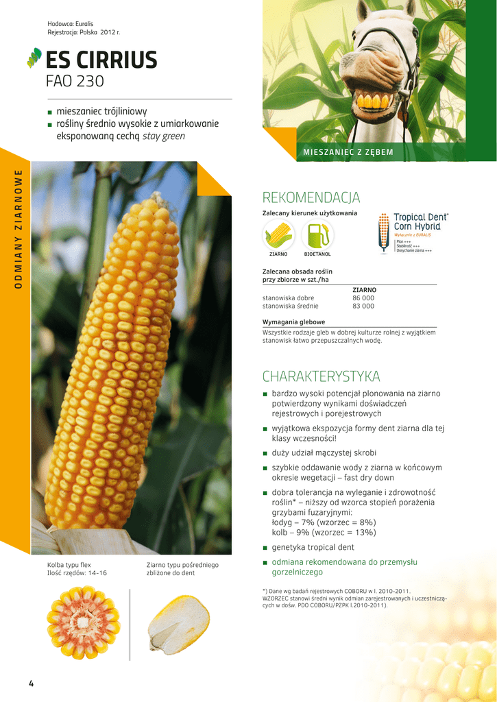 Hodowca: Euralis Rejestracja: Polska 2012 r. ES CIRRIUS FAO 230 ■ ■ mieszaniec trójliniowy rośliny średnio wysokie z umiarkowanie eksponowaną cechą stay green ODMIANY ZIARNOWE MIESZANIEC Z ZĘBEM REKOMENDACJA Zalecany kierunek użytkowania ZIARNO BIOETANOL Zalecana obsada roślin przy zbiorze w szt./ha stanowiska dobre stanowiska średnie ZIARNO 86 000 83 000 Wymagania glebowe Wszystkie rodzaje gleb w dobrej kulturze rolnej z wyjątkiem stanowisk łatwo przepuszczalnych wodę. CHARAKTERYSTYKA ■ bardzo wysoki potencjał plonowania na ziarno potwierdzony wynikami doświadczeń rejestrowych i porejestrowych ■ wyjątkowa ekspozycja formy dent ziarna dla tej klasy wczesności! ■ duży udział mączystej skrobi ■ szybkie oddawanie wody z ziarna w końcowym okresie wegetacji – fast dry down ■ dobra tolerancja na wyleganie i zdrowotność roślin* – niższy od wzorca stopień porażenia grzybami fuzaryjnymi: łodyg – 7% (wzorzec = 8%) kolb – 9% (wzorzec = 13%) ■ genetyka tropical dent Kolba typu flex Ilość rzędów: 14-16 Ziarno typu pośredniego zbliżone do dent ■ odmiana rekomendowana do przemysłu gorzelniczego *) Dane wg badań rejestrowych COBORU w l. 2010-2011. WZORZEC stanowi średni wynik odmian zarejestrowanych i uczestniczących w dośw. PDO COBORU/PZPK l.2010-2011). 4 ES CIRRIUS WYNIKI I OPINIE Rekomendacja hodowcy ES Cirrius to dla Euralis jeden z najważniejszych przedstawicieli grupy genetycznej Tropical Dent®. Odmianę zarejestrowano w Polsce w 2012 roku i od tej chwili cieszy się rosnącym z roku na rok zainteresowaniem rolników. Wczesność dojrzewania (FAO 230) umożliwia jego przydatność do uprawy na terenie całego kraju. Niepozorne rośliny o generatywnym pokroju, niosą ze sobą niespotykany potencjał plonowania. Wyjątkowość ES Cirrius polega także na bardzo szybkim dosychaniu ziarna w ostatnim okresie wegetacji – to cecha charakterystyczna dla odmian typu „dent”. Unikalność polega na tym, że dojrzewanie i dosychanie ziarna następuje znacznie wcześniej niż u późnych odmian typu „dent’’. Ta wła- ściwość umożliwia rozszerzenie uprawy ES Cirrius na ziarno w kierunku północnym kraju przy zapewnieniu relatywnie niższej wilgotności zbieranego plonu. Niskie koszty dosuszania ziarna w suszarni są niepodważalnym atutem tej odmiany. W minionym – trudnym dla kukurydzy sezonie – ES Cirrius w pełni potwierdził swą jakość! Przy plonie ziarna na poziomie determinowanym głównie przez długotrwałą suszę, ES Cirrius osiągał wilgotność ziarna w czasie zbioru na poziomie poniżej 25% a niejednokrotnie poniżej 20%. Wysoki plon, przydatność na słabsze stanowiska glebowe oraz doskonałe dosychanie ziarna sprawiają, że ES Cirrius jest wyróżniającą się propozycją odmianową. Błażej Springer - Product Manager Kukurydza, Euralis Rekomendacja rolników GR Mariusz Derlatka, powiat Świebodzin, woj. lubuskie, 260 ha kukurydzy Podobnie jak w latach ubiegłych w roku 2016 posiałem odmianę ES Cirrius. Odmiana ta stanowi u mnie bazę na ziarno na wczesny zbiór. Posiałem ją na glebie klasy IVa, IVb, ale z doświadczenia przez tyle lat uprawy tej odmiany wiem, że nawet w mniej sprzyjających latach radzi sobie na takich stanowiskach. Po tym roku jestem bardzo zadowolony a jednocześnie zaskoczony potencjałem ES Cirriusa. Jako pierwszy schodził z pola przy wilgotności 28% i plonie ziarna 14,2 t/ha. Bałem się o plon ze względu na upały i możliwe problemy w przepylaniu, jednak po raz kolejny obronił się w polu i na pewno nie zrezygnuję z niego w najbliższym czasie. Waldemar Świętoń W-ce Prezes Zarządu, Rolnicza Spółdzielnia Produkcyjna „Przyszłość” w Starych Bogaczowicach, pow. wałbrzyski, woj. dolnośląskie Kukurydzę uprawiamy na powierzchni 350ha z tego ponad 100ha obsiewamy odmianą ES Cirrus. Od trzech lat odmianę ES Cirrus uprawiamy na ziarno i przez ten czas nigdy nas nie zawiodła. Ostatnie dwa lata nie sprzyjały uprawie kukurydzy ze względu na trudne warunki klimatyczne. Pomimo to na naszych górzystych terenach ES Cirrus poradził sobie bez problemów. Wczesność dojrzewania (FAO 230) oraz średnio wysokie rośliny niosą za sobą niespotykany potencjał plonowania. W tym roku z pola zostało zebrane prawie 10t ziarna z hektara. Możemy ją polecić z czystym sumieniem. od odmiany ES Cirrius ok. 20-25 września. Bardzo ważną cechą jest szybkie oddawanie wody, co skutkuje niższymi kosztami suszenia ziarna. W tym roku uzyskałem plon na poziomie ponad 12 t kukurydzy przy zbiorze co przy tej klasie wczesności daje bardzo dobry wynik. Odmianę ES Cirrius polecam każdemu rolnikowi. Gospodarstwo Rolne Włodzimierz Fryder, powiat międzychodzki, woj. wielkopolskie, 200 ha kukurydzy GR Jarosław Łuszczki, Dziewoklucz k. Budzynia, powiat Chodzież, województwo wielkopolskie, 130 ha kukurydzy Odmianę ES Cirrius kupuję od kiedy tylko pojawiła się w ofercie dystrybutora czyli od roku 2013. Przez te 4 lata wypraktykowałem sobie uprawę tej odmiany i w nadchodzącym sezonie posieję ją ponownie. Kukurydzę uprawiam na areale 200 ha, z czego ES Cirrius zajmuje ok 60 ha. Dodam, że sieję ją na glebach klasy IVb-V. Głównym atutem tej odmiany jest to, że bardzo szybko,, schodzi” z pola, dając możliwość siewu w optymalnym terminie pszenicy lub pszenżyta. Wczesny zbiór gwarantuje bardzo dużą zdrowotność ziarna, więc nie mam problemów z mikotoksynami. Zwierzyna leśna, która na naszym terenie stanowi duży problem, nie zdąży wyrządzić dużych szkód. Zbiór kukurydzy zaczynam właśnie W minionym sezonie za namową przedstawiciela handlowego po raz pierwszy zasiałem kukurydzę odmiany ES Cirrius. Zaryzykowałem, większość areału obsiałem tą odmianą i nie żałuję. Średni plon na glebie klasy IVa i IV b jaki zebrałem z powierzchni 105 hektarów wynosił 12,7 ton. ES Cirrius jako odmiana z ziarnem zbliżonym do typu dent bardzo ładnie