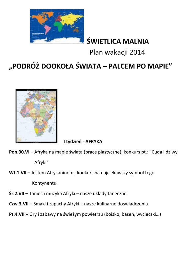 ŚWIETLICA MALNIA Plan wakacji 2014 „PODRÓŻ DOOKOŁA ŚWIATA – PALCEM PO MAPIE” I tydzień - AFRYKA Pon.30.VI – Afryka na mapie świata (prace plastyczne), konkurs pt.: ”Cuda i dziwy Afryki” Wt.1.VII – Jestem Afrykaninem , konkurs na najciekawszy symbol tego Kontynentu. Śr.2.VII – Taniec i muzyka Afryki – nasze układy taneczne Czw.3.VII – Smaki i zapachy Afryki – nasze kulinarne doświadczenia Pt.4.VII – Gry i zabawy na świeżym powietrzu (boisko, basen, wycieczki…) II tydzień AMERYKA PÓŁNOCNA Pon.7.VII – Ameryka Pł na mapie świata (prace plastyczne), konkurs pt.: ”Cuda I dziwy Ameryki Północnej” Wt.8.VII – Jestem Amerykaninem , konkurs na najciekawszy symbol tego kontynentu. Śr.9.VII – Taniec i muzyka Ameryki – nasze układy taneczne Czw.10.VII – Smaki i zapachy Ameryki – nasze kulinarne doświadczenia Pt.11.VII – Gry i zabawy na świeżym powietrzu (boisko, basen, wycieczki …) III tydzień – AMERYKA POŁUDNIOWA Pon.14.VII – Ameryka Południowa na mapie świata (prace plastyczne), konkurs pt.: Cuda i dziwy Ameryki Południowej” Wt.15.VII – Jestem Amerykaninem , konkurs na najciekawszy symbol tego kontynentu. Śr.16.VII – Taniec i muzyka Ameryki – nasze układy taneczne Czw.17.VII – Smaki i zapachy Ameryki – nasze kulinarne doświadczenia Pt.18.VII – Gry i zabawy na świeżym powietrzu (boisko, basen, wycieczki …) IV tydzień – AUSTRALIA Pon.21.VII – Australia na mapie świata (prace plastyczne), konkurs pt.: Cuda i dziwy Australii i Oceanii” Wt.22.VII – Jestem Australijczykiem , konkurs na najciekawszy symbol tego kontynentu. Śr.23.VII – Taniec i muzyka Australii – nasze układy taneczne Czw.24.VII – Smaki i zapachy Australii – nasze kulinarne doświadczenia Pt.25.VII – Gry i zabawy na świeżym powietrzu (boisko, basen, wycieczki …) V tydzień – AZJA Pon.28.VII – Azja na mapie świata (prace plastyczne), konkurs pt.: Cuda i dziwy Azji” Wt.29.VII – Jestem Azjatą , konkurs na najciekawszy symbol tego kontynentu. Śr.30.VII – Taniec i muzyka Azji – nasze układy taneczne Czw.31.VII – Smaki i zapachy Azji – nasze kulinarne doświadczenia Pt.1.VIII – Gry i zabawy na świeżym powietrzu (boisko, basen, wycieczki…) VI tydzień – EUROPA Pon.4.VIII – Europa na mapie świata (prace plastyczne), konkurs pt.: Cuda i dziwy Europy” Wt.5.VIII – Jestem Europejczykiem , konkurs na najciekawszy symbol naszego kontynentu. Śr.6.VIII – Taniec i muzyka Europy – nasze układy taneczne Czw.7.VIII – Smaki i zapachy Europy – nasze kulinarne doświadczenia Pt.8.VIII – Gry i zabawy na świeżym powietrzu (boisko, basen, wycieczki…) VII tydzień – POLSKA Pon.25.VIII – Nasze tradycje dożynkowe – mój projekt na koronę żniwną. Wt.26.VIII – Wykonywanie korony żniwnej i ozdób dożynkowych Śr.27.VIII - Wykonywanie korony żniwnej i ozdób dożynkowych c.d. Czw.28.VIII - „Jestem obywatelem Świata” Podsumowanie wakacji, wręczenie nagród dla najbardziej wszechstronnego uczestnika, gry i zabawy na boisku.