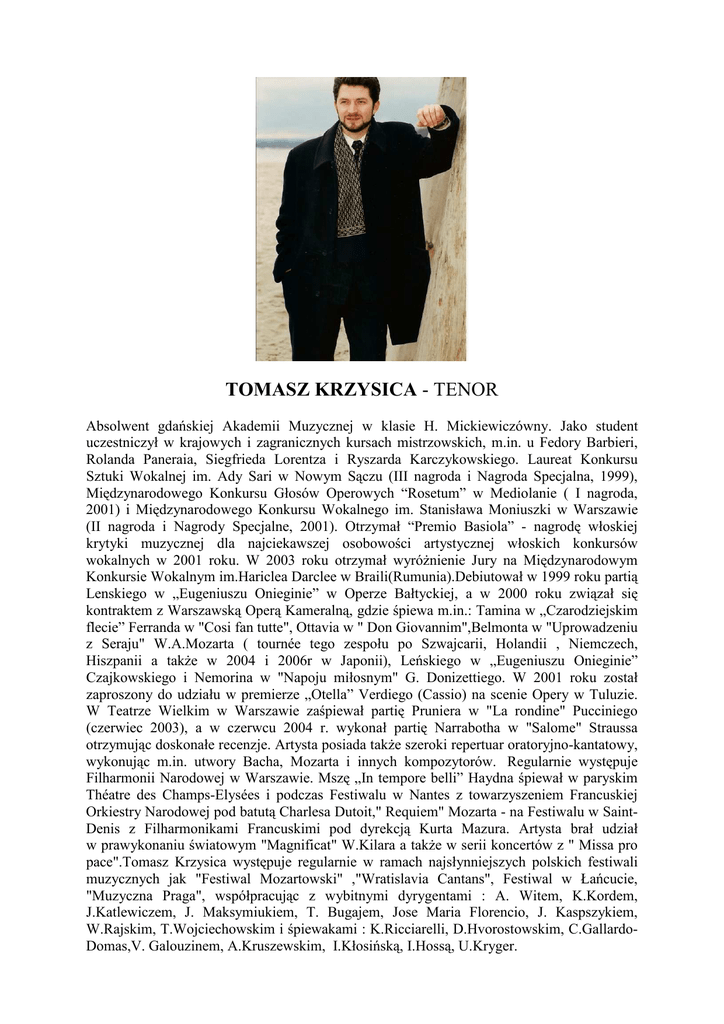 TOMASZ KRZYSICA - TENOR Absolwent gdańskiej Akademii Muzycznej w klasie H. Mickiewiczówny. Jako student uczestniczył w krajowych i zagranicznych kursach mistrzowskich, m.in. u Fedory Barbieri, Rolanda Paneraia, Siegfrieda Lorentza i Ryszarda Karczykowskiego. Laureat Konkursu Sztuki Wokalnej im. Ady Sari w Nowym Sączu (III nagroda i Nagroda Specjalna, 1999), Międzynarodowego Konkursu Głosów Operowych “Rosetum” w Mediolanie ( I nagroda, 2001) i Międzynarodowego Konkursu Wokalnego im. Stanisława Moniuszki w Warszawie (II nagroda i Nagrody Specjalne, 2001). Otrzymał “Premio Basiola” - nagrodę włoskiej krytyki muzycznej dla najciekawszej osobowości artystycznej włoskich konkursów wokalnych w 2001 roku. W 2003 roku otrzymał wyróżnienie Jury na Międzynarodowym Konkursie Wokalnym im.Hariclea Darclee w Braili(Rumunia).Debiutował w 1999 roku partią Lenskiego w „Eugeniuszu Onieginie” w Operze Bałtyckiej, a w 2000 roku związał się kontraktem z Warszawską Operą Kameralną, gdzie śpiewa m.in.: Tamina w „Czarodziejskim flecie” Ferranda w "Cosi fan tutte", Ottavia w " Don Giovannim",Belmonta w "Uprowadzeniu z Seraju" W.A.Mozarta ( tournée tego zespołu po Szwajcarii, Holandii , Niemczech, Hiszpanii a także w 2004 i 2006r w Japonii), Leńskiego w „Eugeniuszu Onieginie” Czajkowskiego i Nemorina w "Napoju miłosnym" G. Donizettiego. W 2001 roku został zaproszony do udziału w premierze „Otella” Verdiego (Cassio) na scenie Opery w Tuluzie. W Teatrze Wielkim w Warszawie zaśpiewał partię Pruniera w "La rondine" Pucciniego (czerwiec 2003), a w czerwcu 2004 r. wykonał partię Narrabotha w "Salome" Straussa otrzymując doskonałe recenzje. Artysta posiada także szeroki repertuar oratoryjno-kantatowy, wykonując m.in. utwory Bacha, Mozarta i innych kompozytorów. Regularnie występuje Filharmonii Narodowej w Warszawie. Mszę „In tempore belli” Haydna śpiewał w paryskim Théatre des Champs-Elysées i podczas Festiwalu w Nantes z towarzyszeniem Francuskiej Orkiestry Narodowej pod batutą Charlesa Dutoit," Requiem" Mozarta - na Festiwalu w SaintDenis z Filharmonikami Francuskimi pod dyrekcją Kurta Mazura. Artysta brał udział w prawykonaniu światowym "Magnificat" W.Kilara a także w serii koncertów z " Missa pro pace".Tomasz Krzysica występuje regularnie w ramach najsłynniejszych polskich festiwali muzycznych jak "Festiwal Mozartowski" ,"Wratislavia Cantans", Festiwal w Łańcucie, "Muzyczna Praga", współpracując z wybitnymi dyrygentami : A. Witem, K.Kordem, J.Katlewiczem, J. Maksymiukiem, T. Bugajem, Jose Maria Florencio, J. Kaspszykiem, W.Rajskim, T.Wojciechowskim i śpiewakami : K.Ricciarelli, D.Hvorostowskim, C.GallardoDomas,V. Galouzinem, A.Kruszewskim, I.Kłosińską, I.Hossą, U.Kryger.