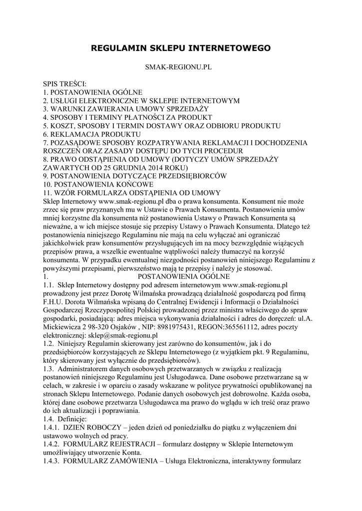 REGULAMIN SKLEPU INTERNETOWEGO SMAK-REGIONU.PL SPIS TREŚCI: 1. POSTANOWIENIA OGÓLNE 2. USŁUGI ELEKTRONICZNE W SKLEPIE INTERNETOWYM 3. WARUNKI ZAWIERANIA UMOWY SPRZEDAŻY 4. SPOSOBY I TERMINY PŁATNOŚCI ZA PRODUKT 5. KOSZT, SPOSOBY I TERMIN DOSTAWY ORAZ ODBIORU PRODUKTU 6. REKLAMACJA PRODUKTU 7. POZASĄDOWE SPOSOBY ROZPATRYWANIA REKLAMACJI I DOCHODZENIA ROSZCZEŃ ORAZ ZASADY DOSTĘPU DO TYCH PROCEDUR 8. PRAWO ODSTĄPIENIA OD UMOWY (DOTYCZY UMÓW SPRZEDAŻY ZAWARTYCH OD 25 GRUDNIA 2014 ROKU) 9. POSTANOWIENIA DOTYCZĄCE PRZEDSIĘBIORCÓW 10. POSTANOWIENIA KOŃCOWE 11. WZÓR FORMULARZA ODSTĄPIENIA OD UMOWY Sklep Internetowy www.smak-regionu.pl dba o prawa konsumenta. Konsument nie może zrzec się praw przyznanych mu w Ustawie o Prawach Konsumenta. Postanowienia umów mniej korzystne dla konsumenta niż postanowienia Ustawy o Prawach Konsumenta są nieważne, a w ich miejsce stosuje się przepisy Ustawy o Prawach Konsumenta. Dlatego też postanowienia niniejszego Regulaminu nie mają na celu wyłączać ani ograniczać jakichkolwiek praw konsumentów przysługujących im na mocy bezwzględnie wiążących przepisów prawa, a wszelkie ewentualne wątpliwości należy tłumaczyć na korzyść konsumenta. W przypadku ewentualnej niezgodności postanowień niniejszego Regulaminu z powyższymi przepisami, pierwszeństwo mają te przepisy i należy je stosować. 1. POSTANOWIENIA OGÓLNE 1.1. Sklep Internetowy dostępny pod adresem internetowym www.smak-regionu.pl prowadzony jest przez Dorotę Wilmańska prowadzącą działalność gospodarczą pod firmą F.H.U. Dorota Wilmańska wpisaną do Centralnej Ewidencji i Informacji o Działalności Gospodarczej Rzeczypospolitej Polskiej prowadzonej przez ministra właściwego do spraw gospodarki, posiadającą: adres miejsca wykonywania działalności i adres do doręczeń: ul.A. Mickiewicza 2 98-320 Osjaków , NIP: 8981975431, REGON:365561112, adres poczty elektronicznej: [email protected] 1.2. Niniejszy Regulamin skierowany jest zarówno do konsumentów, jak i do przedsiębiorców korzystających ze Sklepu Internetowego (z wyjątkiem pkt. 9 Regulaminu, który skierowany jest wyłącznie do przedsiębiorców). 1.3. Administratorem danych osobowych przetwarzanych w związku z realizacją postanowień niniejszego Regulaminu jest Usługodawca. Dane osobowe przetwarzane są w celach, w zakresie i w oparciu o zasady wskazane w polityce prywatności opublikowanej na stronach Sklepu Internetowego. Podanie danych osobowych jest dobrowolne. Każda osoba, której dane osobowe przetwarza Usługodawca ma prawo do wglądu w ich treść oraz prawo do ich aktualizacji i poprawiania. 1.4. Definicje: 1.4.1. DZIEŃ ROBOCZY – jeden dzień od poniedziałku do piątku z wyłączeniem dni ustawowo wolnych od pracy. 1.4.2. FORMULARZ REJESTRACJI – formularz dostępny w Sklepie Internetowym umożliwiający utworzenie Konta. 1.4.3. FORMULARZ ZAMÓWIENIA – Usługa Elektroniczna, interaktywny formularz dostępny w Sklepie Internetowym umożliwiający złożenie Zamówienia, w szczególności poprzez dodanie Produktów do elektronicznego koszyka oraz określenie warunków Umowy Sprzedaży, w tym sposobu dostawy i płatności. 1.4.4. KLIENT – (1) osoba fizyczna posiadająca pełną zdolność do czynności prawnych, a w wypadkach przewidzianych przez przepisy powszechnie obowiązujące także osoba fizyczna posiadająca ograniczoną zdolność do czynności prawnych; (2) osoba prawna; albo (3) jednostka organizacyjna nieposiadająca osobowości prawnej, której ustawa przyznaje zdolność prawną; - która zawarła lub zamierza zawrzeć Umowę Sprzedaży ze Sprzedawcą. 1.4.5. KODEKS CYWILNY – ustawa kodeks cywilny z dnia 23 kwietnia 1964 r. (Dz.U. 1964 nr 16, poz. 93 ze zm.). 1.4.6. KONTO – Usługa Elektroniczna, oznaczony indywidualną nazwą (loginem) i hasłem podanym przez Usługobiorcę zbiór zasobów w systemie teleinformatycznym Usługodawcy, w którym gromadzone są dane podane przez Usługobiorcę oraz informacje o złożonych przez niego Zamówieniach w Sklepie Internetowym. 1.4.7. NEWSLETTER – Usługa Elektroniczna, elektroniczna usługa dystrybucyjna świadczona przez Usługodawcę za pośrednictwem poczty elektronicznej e-mail, która umożliwia wszystkim korzystającym z niej Usługobiorcom automatyczne otrzymywanie od Usługodawcy cyklicznych treści kolejnych edycji newslettera zawierającego informacje o Produktach, nowościach i promocjach w Sklepie Internetowym. 1.4.8. PRODUKT – dostępna w Sklepie Internetowym rzecz ruchoma będąca przedmiotem Umowy Sprzedaży między Klientem a Sprzedawcą. 1.4.9. REGULAMIN – niniejszy regulamin Sklepu Internetowego. 1.4.10. SKLEP INTERNETOWY - sklep internetowy Usługodawcy dostępny pod adresem internetowym: www.smak-regionu.pl 1.4.11. SPRZEDAWCA; USŁUGODAWCA – Dorota Wilmańska prowadzącą działalność gospodarczą pod firmą F.H.U. Dorota Wilmańska wpisaną do Centralnej Ewidencji i Informacji o Działalności Gospodarczej Rzeczypospolitej Polskiej prowadzonej przez ministra właściwego do spraw gospodarki, posiadającą: adres miejsca wykonywania działalności i adres do doręczeń: ul.A. Mickiewicza 2 98-320 Osjaków , NIP: 8981975431, REGON:365561112, adres poczty elektronicznej: [email protected] 1.4.12. UMOWA SPRZEDAŻY – umowa sprzedaży Produktu zawierana albo zawarta między Klientem a Sprzedawcą za pośrednictwem Sklepu Internetowego. 1.4.13. USŁUGA ELEKTRONICZNA – usługa świadczona drogą elektroniczną przez Usługodawcę na rzecz Usługobiorcy za pośrednictwem Sklepu Internetowego. 1.4.14. USŁUGOBIORCA – (1) osoba fizyczna posiadająca pełną zdolność do czynności prawnych, a w wypadkach przewidzianych przez przepisy powszechnie obowiązujące także osoba fizyczna posiadająca ograniczoną zdolność do czynności prawnych; (2) osoba prawna; albo (3) jednostka organizacyjna nieposiadająca osobowości prawnej, której ustawa przyznaje zdolność prawną; - korzys