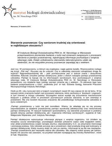 ul. Pasteura 3, 02-093 Warszawa http://www.nencki.gov.pl e-mail: [email protected] tel.: +48 22 5892000 (centrala) +48 22 5892491 (sekretariat) fax: +48 22 8225342 Warszawa, 27 kwietnia 2012 Starzenie poznawcze: Czy seniorom trudniej się orientować w najbliższym otoczeniu? W Instytucie Biologii Doświadczalnej PAN im. M. Nenckiego w Warszawie przeprowadzono pionierskie badania u ludzi nad zmianami związanymi z procesami starzenia w pamięci przestrzennej, rejestrującej informacje pochodzące z wnętrza własnego ciała. Dzięki unikatowemu stanowisku laboratoryjnemu udało się stwierdzić, że nie wszystkie procesy poznawcze zapadają się z wiekiem. Jest noc. W pomieszczeniu, w którym się znajdujesz, nagle gaśnie światło. Równocześnie rozlega się krzyk: „Pali się!”. Rzucasz się do ucieczki. Czy w całkowitej ciemności odnajdziesz drogę do wyjścia? Najprawdopodobniej tak – jeśli pomieszczenie jest ci dobrze znane i stosunkowo niewielkie. Ratunek umożliwi pamięć idiotetyczna, jeden z dwóch rodzajów pamięci przestrzennej człowieka. Pamięć ta bazuje nie na informacjach wzrokowych, lecz pochodzących z wnętrza własnego ciała. W Instytucie Biologii Doświadczalnej PAN im. M. Nenckiego w Warszawie sprawdzono, czy działanie tego rodzaju pamięci zmienia się z wiekiem. „To pierwsze tego typu badanie przeprowadzone u ludzi”, podkreśla prof. dr hab. Elżbieta Szeląg, kierownik Pracowni Neuropsychologii Instytutu Nenckiego. Osób po 65. roku życia jest dziś w krajach rozwiniętych nawet 20 razy więcej niż sto lat temu. W tej sytuacji rośnie znaczenie badań nad procesami starzenia, które zachodzą w tkankach i organach, w tym również w mózgu człowieka. Szczególne ważne wydaje się zrozumienie mechanizmów leżących u podłoża zmian w procesach poznawczych podczas starzenia, w tym orientacji w przestrzeni. Ma ona bowiem kluczowe znaczenie dla prawidłowego funkcjonowania człowieka w życiu codziennym. „Pamięć przestrzenna u ludzi nie jest monolitem. Wiemy, że składają się na nią procesy odpowiedzialne za działanie przestrzennej pamięci wzrokowej (allotetycznej) oraz niewzrokowej pamięci idiotetycznej. W naszych badaniach sprawdzaliśmy, czy starzenie poznawcze w podobny sposób dotyczy pamięci idiotetycznej, jak i kojarzenia informacji wzrokowych”, wyjaśnia dr hab. Małgorzata Węsierska, prof. Instytutu Nenckiego. Pamięć idiotetyczna wykorzystuje informacje płynące z wnętrza organizmu. Ich źródłem są receptory czucia wewnętrznego, pozwalające określać położenie części ciała względem siebie, oraz układ przedsionkowy (część narządu słuchu), odpowiedzialny m.in. za utrzymanie równowagi i pionizację postawy. Gdy człowiek porusza się w przestrzeni, ślad przebytej drogi jest kodowany w pamięci idiotetycznej. Kiedy musimy dojść do celu po ciemku, informacje te są dla nas niezbędne. „Pamięć przestrzenna jest niezwykle ważna dla człowieka. Nie zdajemy sobie sprawy jak bardzo, dopóki nie zacznie nas zawodzić, na przykład wskutek rozwijającej się choroby Alzheimera”, mówi dr hab. Węsierska. Powszechną metodą badania pamięci przestrzennej są testy komputerowe: badany siedzi przed monitorem i przesuwając myszką porusza się w wirtualnej przestrzeni. Osoba poddana takim testom nie przemieszcza się fizycznie. Z tego powodu w eksperymentach z użyciem wizualizacji komputerowej można badać jedynie przestrzenną pamięć wzrokową, a nie pamięć idiotetyczną. W Instytucie Nenckiego, w ramach Centrum Doskonałości MIND, zbudowano stanowisko do badania pamięci idiotetycznej u ludzi w warunkach naturalnego poruszania się w przestrzeni. Stanowisko – jedno z zaledwie dwóch na świecie – ma kształt kolistej areny średnicy kilku metrów, otoczonej ze wszystkich stron czarnymi, grubymi kotarami. Arena jest zaciemniona i izolowana akustycznie od otoczenia. Aby dodatkowo ograniczyć wpływ bodźców zewnętrznych, badanemu zasłania się specjalną opaską oczy, a na uszy nakłada słuchawki, które dodatkowo tłumią zewnętrzne bodźce akustyczne. „Zadanie jest proste: chodząc po arenie w całkowitych ciemnościach i ciszy należy wrócić do miejsca startu. Powrót rozpoczyna się z tego miejsca na arenie, w którym w słuchawkach pojawia się dźwięk”, opisuje dr Justyna Skolimowska z Instytutu Nenckiego. Aktualne położenie człowieka na arenie jest rejestrowane przez program komputerowy dzięki kamerze zainstalowanej na suficie nad areną. Oprogramowanie śledzi ruchy diody umieszczonej na wysięgniku tornistra umieszczonego na plecach badanej osoby. „Gdybyśmy mogli użyć wzroku, powrót do punktu startu byłby zadaniem banalnym. Ale tak nie jest, ponieważ badany jest odizolowany od wszelkich bodźców zewnętrznych. Nie ma wyboru, musi się zdać całkowicie na pamięć idiotetyczną”, mówi dr hab. Węsierska. Testom poddano 80 zdrowych ochotników, przydzielonych z uwagi na wiek do jednej z dwóch liczbowo równych grup: młodszych (20-29 lat) i starszych (64-77 lat). Każdy badany wykonywał najpierw wzrokowy test komputerowy, sprawdzający zdolność zapamiętywania położeń od jednego do sześciu losowo wybieranych wzorów, które były ukryte w różnych miejscach ekranu. Celem tego testu była ocena uczenia kojarzeniowego o charakterze wzrokowo-przestrzennym. W drugiej części badania na opisanym wyżej stanowisku przeprowadzano testy pamięci idiotetycznej. Zgodnie z oczekiwaniami badaczy, w teście komputerowym, opierającym się głównie na pamięci wzrokowej, osoby starsze uzyskały gorsze wyniki niż osoby młode, tj. odpowiadały wolniej i popełniały więcej błędów. Natomiast w obu grupach wiekowych nie było istotnych różnic w wykonaniu testu pamięci idiotetycznej, co dotyczyło zarówno kobiet, jak i mężczyzn. „Wnioski są optymistyczne. O ile u osób zdrowych, niezależnie od płci, sprawność wzrokowej pamięci przestrzennej m