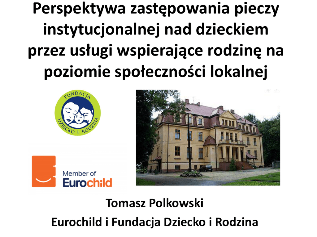 Perspektywa zastępowania pieczy instytucjonalnej nad dzieckiem przez usługi wspierające rodzinę na poziomie społeczności lokalnej Tomasz Polkowski Eurochild i Fundacja Dziecko i Rodzina Piecza instytucjonalna dla dzieci i młodzieży Zgodnie z Raportem Europejskiej Grupy Eksperckiej „Przejście od opieki instytucjonalnej do usług opartych na społecznościach lokalnych” (2009), instytucja opiekuńcza to miejsce, w którym występują jednocześnie: - Depersonalizacja - Rutynowy plan dnia - Grupowe metody wychowawcze - „Dystans” społeczny (oddzielenie dziecka od naturalnego środowiska rodzinnego) Dodatkowe kryterium: Brak indywidualnych relacji emocjonalnych i więzi Nauka o więzi i badania neurologiczne: Dzieci bez trwałych, pozytywnych, indywidualnych więzi z dorosłą osobą doświadczają poważnych zaburzeń emocjonalnych i neurologicznych, które mają bezpośredni wpływ na rozwój w każdej dziedzinie, w tym rozwój mózgu. (patrz Kevin Browne, Alan Schore, Daniel Siegel i inni) Jakie formy opieki nad dzieckiem powinny podlegać deinstytucjonalizacji? Deintytucjonalizacji podlegać powinny placówki opiekuńczowychowawcze – bez względu na wielkość, jak również rodziny zastępcze i placówki rodzinne, w których nie zapewnia się dzieciom odbudowy więzi z rodziną dziecka lub (gdy to pierwsze jest absolutnie niemożliwe) budowy trwałych relacji emocjonalnych w nowej rodzinie. Problemy ze statystykami Zgodnie ze statystykami tworzonymi przez Ministerstwo Rodziny, Pracy i Polityki Społecznej istnieją 1054 instytucje opiekuńcze. Przebywa w nich 19,517 dzieci. W 2008 placówek było około 460. Skąd ponad dwukrotny wzrost instytucji? Powodem jest „dzielenie” dużych instytucji na mniejsze oraz tworzenie nowych, 45-osobowych placówek regionalnych. Przykład: Kazimierza Wielka Zmniejszenie placówek zgodnie z ustawą o wspieraniu rodziny i systemie pieczy zastępczej (2012) • Ustawa wprowadziła ograniczenie liczby dzieci w jednej placówce do 14 dzieci, z jednoczesnym okresem przejściowym potrzebnym na przekształcenia placówek do 2020 roku. • Spowodowało to gwałtowny wzrost liczby placówek, przy czym wiele z nich nadal zorganizowanych jest pod „jednym dachem” • Tworzenie małych placówek może mieć charakter pozorny. „Dzielenie” placówek • Ponad sto byłych domów dziecka zostało podzielonych na mniejsze 14-osobowe struktury w jednym budynku. Czy to jest deinstytucjonalizacja? Dom Dziecka w Skopaniu – podzielony na placówkę 30 i 14 osobową Placówki podległe systemowi edukacji • 69 Młodzieżowych Ośr. Socjoterapii – 3585 miejsc • 93 Młodzieżowe Ośr. Wychowawcze – 5621 miejsc Razem 9206 miejsc. Ponadto dzieci przebywają również w internatach specjalnych ośrodków szkolnowychowawczych oraz domach pomocy społecznej. Brakuje tu dokładnej statystyki. Pełna statystyka? • Do statystyk dzieci żyjących większość czasu lub stale w instytucjach należałoby dodać dzieci mieszkające w specjalnych ośrodkach szkolno-wychowawczych, młodzieżowych ośrodkach socjoterapii, młodzieżowych ośrodkach wychowawczych, zakładach leczniczych, domach pomocy społecznej dla dzieci, domy dla samotnych matek itd. Czy rodzinne domy dziecka i placówki typu rodzinnego są instytucjami? • W placówkach tych przebywa od 6 nawet do 12 dzieci • Prowadzący często posługują się urzędniczą nomenklaturą • Placówki te zatrudniają „wychowawców” i „pomoce wychowawcze” • Są instytucjami, jeśli nie odbudowują więzi z rodzina i nie budują pozytywnych trwałych relacji z dziećmi Deinstytucjonalizacja to zmiana sposobu myślenia, nie mechaniczne zamykanie placówek • Szkolenia i spotkania z pracownikami domów dziecka ujawniają wiele uprzedzeń, uogólnień, etykietowania, ironizowania, dyskredytowania rodzin biologicznych. • Wychowawcom brakuje kompetencji związanych z pracą z rodziną, w tym technik komunikacyjnych, motywacyjnych, systemowego i wzmacniającego podejścia do rodziny, technik podejścia skupionego na rozwiązaniach, oraz kompetencji osobistych, związanych z przełamywaniem uprzedzeń i własnego oporu. Rodziny zastępcze mają podobne uprzedzenia i braki kompetencji Jeśli rodziny zastępcze miałyby nie „odcinać” dzieci od korzeni, współpracować z rodzinami biologicznymi i współdziałać na rzecz reintegracji rodzin – potrzebne byłoby: • Szkolenia i działania paraterapeutyczne dla rodzin zastępczych dotyczące motywacji, celu, środków, obrazu rodziny, potrzeb dziecka, współpracy z rodziną • Budowa lokalnych systemów wsparcia dla rodzin zastępczych • Zdefiniowanie celu rodzinnej pieczy zastępczej – rodziny służące reintegracji czy długoterminowe? Zdefiniowanie na nowo rodzin zastępczych • Rodziny spokrewnione – 31951 dzieci (tend. malejąca) • Rodziny zastępcze niezawodowe – 15486 (tend. malejąca) • Rodziny zastępcze zawodowe – 4064 • Rodzinne domy dziecka – 3178 (wzrost) Razem: 56986 (ok. 700 dzieci mniej niż w roku 2014) Jakie działania wobec placówek sprzyjają deinstytucjonalizacji? • Dzielenie placówek na funkcjonalne programy współpracy z rodzinami oraz służbami wspierania rodziny • Tworzenie procedur i technik współpracy z rodziną • Treningi redefiniujące obraz rodziny i potrzeby dzieci • Szkolenia motywujące do bycia „sojusznikami” rodzin • Techniki podejścia systemowego, opartego na zasobach i mocnych stronach rodzin • Zamiast podejścia skupionego na „deficytach”, podejście skupione na rozwiązaniach Przykład przekształcenia domu dziecka – Dębinki (placówka opiekuńczo-wychowawcza) Łbiska pod Warszawą Wnioski – co dalej z placówkami? Szkolenia dla kadr z zakresu - Indywidualnego podejścia do dziecka i nauki o więzi - Zasad pracy zespołowej w warunkach małej placówki ze służbami wspierającymi rodzinę - Tworzenia i realizacji procedur pracy z rodziną, w tym