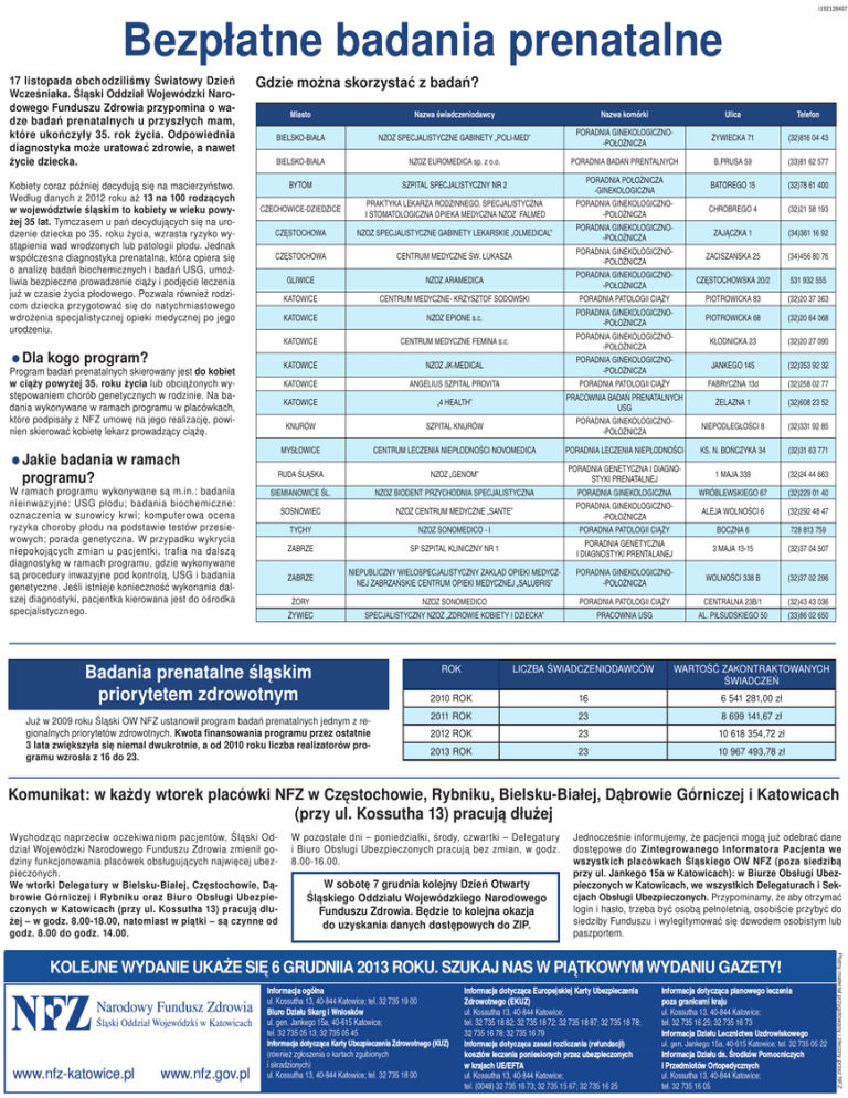 i192128407 Bezpłatne badania prenatalne 17 listopada obchodziliśmy Światowy Dzień Wcześniaka. Śląski Oddział Wojewódzki Narodowego Funduszu Zdrowia przypomina o wadze badań prenatalnych u przyszłych mam, które ukończyły 35. rok życia. Odpowiednia diagnostyka może uratować zdrowie, a nawet życie dziecka. Kobiety coraz później decydują się na macierzyństwo. Według danych z 2012 roku aż 13 na 100 rodzących w województwie śląskim to kobiety w wieku powyżej 35 lat. Tymczasem u pań decydujących się na urodzenie dziecka po 35. roku życia, wzrasta ryzyko wystąpienia wad wrodzonych lub patologii płodu. Jednak współczesna diagnostyka prenatalna, która opiera się o analizę badań biochemicznych i badań USG, umożliwia bezpieczne prowadzenie ciąży i podjęcie leczenia już w czasie życia płodowego. Pozwala również rodzicom dziecka przygotować się do natychmiastowego wdrożenia specjalistycznej opieki medycznej po jego urodzeniu. Gdzie można skorzystać z badań? Miasto Nazwa świadczeniodawcy Nazwa komórki Ulica Telefon BIELSKO-BIAŁA NZOZ SPECJALISTYCZNE GABINETY „POLI-MED” PORADNIA GINEKOLOGICZNO-POŁOŻNICZA ŻYWIECKA 71 (32)816 04 43 BIELSKO-BIAŁA NZOZ EUROMEDICA sp. z o.o. PORADNIA BADAŃ PRENTALNYCH B.PRUSA 59 (33)81 62 577 BYTOM SZPITAL SPECJALISTYCZNY NR 2 PORADNIA POŁOŻNICZA -GINEKOLOGICZNA BATOREGO 15 (32)78 61 400 CZECHOWICE-DZIEDZICE PRAKTYKA LEKARZA RODZINNEGO, SPECJALISTYCZNA I STOMATOLOGICZNA OPIEKA MEDYCZNA NZOZ FALMED PORADNIA GINEKOLOGICZNO-POŁOŻNICZA CHROBREGO 4 (32)21 58 193 CZĘSTOCHOWA NZOZ SPECJALISTYCZNE GABINETY LEKARSKIE „OLMEDICAL” PORADNIA GINEKOLOGICZNO-POŁOŻNICZA ZAJĄCZKA 1 (34)361 16 92 CZĘSTOCHOWA CENTRUM MEDYCZNE ŚW. ŁUKASZA PORADNIA GINEKOLOGICZNO-POŁOŻNICZA ZACISZAŃSKA 25 (34)456 80 76 GLIWICE NZOZ ARAMEDICA PORADNIA GINEKOLOGICZNO-POŁOŻNICZA CZĘSTOCHOWSKA 20/2 531 932 555 KATOWICE CENTRUM MEDYCZNE- KRZYSZTOF SODOWSKI PORADNIA PATOLOGII CIĄŻY PIOTROWICKA 83 (32)20 37 363 KATOWICE NZOZ EPIONE s.c. PORADNIA GINEKOLOGICZNO-POŁOŻNICZA PIOTROWICKA 68 (32)20 64 068 KATOWICE CENTRUM MEDYCZNE FEMINA s.c. PORADNIA GINEKOLOGICZNO-POŁOŻNICZA KŁODNICKA 23 (32)20 27 090 KATOWICE NZOZ JK-MEDICAL PORADNIA GINEKOLOGICZNO-POŁOŻNICZA JANKEGO 145 (32)353 92 32 KATOWICE ANGELIUS SZPITAL PROVITA PORADNIA PATOLOGII CIĄŻY FABRYCZNA 13d (32)258 02 77 KATOWICE „4 HEALTH” PRACOWNIA BADAŃ PRENATALNYCH USG ŻELAZNA 1 (32)608 23 52 KNURÓW SZPITAL KNURÓW PORADNIA GINEKOLOGICZNO-POŁOŻNICZA NIEPODLEGŁOŚCI 8 (32)331 92 85 MYSŁOWICE CENTRUM LECZENIA NIEPŁODNOŚCI NOVOMEDICA PORADNIA LECZENIA NIEPŁODNOŚCI KS. N. BOŃCZYKA 34 (32)31 63 771 RUDA ŚLĄSKA NZOZ „GENOM” PORADNIA GENETYCZNA I DIAGNOSTYKI PRENATALNEJ 1 MAJA 339 (32)24 44 663 SIEMIANOWICE ŚL. NZOZ BIODENT PRZYCHODNIA SPECJALISTYCZNA PORADNIA GINEKOLOGICZNA WRÓBLEWSKIEGO 67 (32)229 01 40 SOSNOWIEC NZOZ CENTRUM MEDYCZNE „SANTE” PORADNIA GINEKOLOGICZNO-POŁOŻNICZA ALEJA WOLNOŚCI 6 (32)292 48 47 TYCHY NZOZ SONOMEDICO - I PORADNIA PATOLOGII CIĄŻY BOCZNA 6 728 813 759 ZABRZE SP SZPITAL KLINICZNY NR 1 PORADNIA GENETYCZNA I DIAGNOSTYKI PRENTALANEJ 3 MAJA 13-15 (32)37 04 507 ZABRZE NIEPUBLICZNY WIELOSPECJALISTYCZNY ZAKLAD OPIEKI MEDYCZNEJ ZABRZAŃSKIE CENTRUM OPIEKI MEDYCZNEJ „SALUBRIS” PORADNIA GINEKOLOGICZNO-POŁOŻNICZA WOLNOŚCI 338 B (32)37 02 296 ŻORY NZOZ SONOMEDICO PORADNIA PATOLOGII CIĄŻY CENTRALNA 23B/1 (32)43 43 036 ŻYWIEC SPECJALISTYCZNY NZOZ „ZDROWIE KOBIETY I DZIECKA” PRACOWNIA USG AL. PIŁSUDSKIEGO 50 (33)86 02 650 Dla kogo program? Program badań prenatalnych skierowany jest do kobiet w ciąży powyżej 35. roku życia lub obciążonych występowaniem chorób genetycznych w rodzinie. Na badania wykonywane w ramach programu w placówkach, które podpisały z NFZ umowę na jego realizację, powinien skierować kobietę lekarz prowadzący ciążę. Jakie badania w ramach programu? W ramach programu wykonywane są m.in.: badania nieinwazyjne: USG płodu; badania biochemiczne: oznaczenia w surowicy krwi; komputerowa ocena ryzyka choroby płodu na podstawie testów przesiewowych; porada genetyczna. W przypadku wykrycia niepokojących zmian u pacjentki, trafia na dalszą diagnostykę w ramach programu, gdzie wykonywane są procedury inwazyjne pod kontrolą, USG i badania genetyczne. Jeśli istnieje konieczność wykonania dalszej diagnostyki, pacjentka kierowana jest do ośrodka specjalistycznego. Badania prenatalne śląskim priorytetem zdrowotnym Już w 2009 roku Śląski OW NFZ ustanowił program badań prenatalnych jednym z regionalnych priorytetów zdrowotnych. Kwota finansowania programu przez ostatnie 3 lata zwiększyła się niemal dwukrotnie, a od 2010 roku liczba realizatorów programu wzrosła z 16 do 23. ROK LICZBA ŚWIADCZENIODAWCÓW WARTOŚĆ ZAKONTRAKTOWANYCH ŚWIADCZEŃ 2010 ROK 16 6 541 281,00 zł 2011 ROK 23 8 699 141,67 zł 2012 ROK 23 10 618 354,72 zł 2013 ROK 23 10 967 493,78 zł Komunikat: w każdy wtorek placówki NFZ w Częstochowie, Rybniku, Bielsku-Białej, Dąbrowie Górniczej i Katowicach (przy ul. Kossutha 13) pracują dłużej Wychodząc naprzeciw oczekiwaniom pacjentów, Śląski Oddział Wojewódzki Narodowego Funduszu Zdrowia zmienił godziny funkcjonowania placówek obsługujących najwięcej ubezpieczonych. We wtorki Delegatury w Bielsku-Białej, Częstochowie, Dąbrowie Górniczej i Rybniku oraz Biuro Obsługi Ubezpieczonych w Katowicach (przy ul. Kossutha 13) pracują dłużej – w godz. 8.00-18.00, natomiast w piątki – są czynne od godz. 8.00 do godz. 14.00. W pozostałe dni – poniedziałki, środy, czwartki – Delegatury i Biuro Obsługi Ubezpieczonych pracują bez zmian, w godz. 8.00-16.00. W sobotę 7 grudnia kolejny Dzień Otwarty Poniedziałek 8.00-16.00 Wtorek 8.00-18.00 Śląskiego Oddziału Wojewódzkiego Narodowego Środa 8.00-16.00 Funduszu Zdrowia. Będzie to kolejna okazja 8.00-16.00 do Czwartek uzyskania danych dostępowych do ZIP. Piątek 8.00-14.00 Jedn