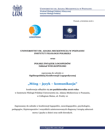 Poznań, 5 kwietnia 2016 r. UNIWERSYTET IM. ADAMA MICKIEWICZA W POZNANIU INSTYTUT FILOLOGII POLSKIEJ oraz POLSKI ZWIĄZEK LOGOPEDÓW Oddział WIELKOPOLSKI zapraszają do udziału w Ogólnopolskiej Konferencji Logopedycznej „Mózg – język – komunikacja” konferencja odbędzie się 20 października 2016 roku w Instytucie Filologii Polskiej Uniwersytetu im. Adama Mickiewicza w Poznaniu, w Collegium Maius, ul. Fredry 10 Zapraszamy do udziału w konferencji logopedów, neurologopedów, psychologów, pedagogów, fizjoterapeutów i wszystkich zainteresowanych diagnozą i terapią zaburzeń mowy i języka u dzieci oraz osób dorosłych. Celem konferencji jest konfrontacja wiedzy na temat specyfiki zaburzeń mózgu i wynikających z tego deficytów językowych z najnowszymi sposobami ich terapii. Podczas konferencji zostaną omówione problemy dotyczące roli mózgu w kształtowaniu się umiejętności komunikacyjnych oraz określonych funkcji poznawczych człowieka. Jednocześnie chcielibyśmy zwrócić uwagę na kwestie związane z patologią układu nerwowego na poziomie strukturalnym i funkcjonalnym oraz na aktualne, najnowsze rozwiązania terapeutyczne stosowane w zaburzeniach mowy i języka zarówno u dzieci, jak i osób dorosłych. KRĘGI TEMATYCZNE KONFERENCJI: 1. Diagnoza zaburzeń mowy i języka u dzieci i osób dorosłych. 2. Metody terapeutyczne w praktyce logopedycznej i neurologopedycznej. 3. Neurologia i neurologopedia. 4. Neurobiologia i neuropsychologia języka. 5. Wczesna interwencja terapeutyczna i wspomaganie rozwoju dziecka. Komitet Naukowy: prof. dr hab. Jagoda Cieszyńska Uniwersytet Pedagogiczny im. Komisji Edukacji Narodowej w Krakowie dr hab. prof. UG Stanisław Milewski Uniwersytet Gdański dr hab. prof. UP Marta Korendo Uniwersytet Pedagogiczny im. Komisji Edukacji Narodowej w Krakowie dr hab. prof. UAM Małgorzata Witaszek-Samborska Uniwersytet im. Adama Mickiewicza w Poznaniu dr hab. Małgorzata Rutkiewicz-Hanczewska Uniwersytet im. Adama Mickiewicza w Poznaniu dr Ewa Jeżewska-Krasnodębska Wyższa Szkoła Pedagogiczna im. Janusza Korczaka w Warszawie dr Katarzyna Kaczorowska-Bray Uniwersytet Gdański dr Anna Żebryk-Stopa Uniwersytet Medyczny im. Karola Marcinkowskiego w Poznaniu dr Ewa Kaptur Uniwersytet im. Adama Mickiewicza w Poznaniu dr Jolanta Sławek Uniwersytet im. Adama Mickiewicza w Poznaniu Komitet Organizacyjny Konferencji: dr hab. Małgorzata Rutkiewicz-Hanczewska (UAM) – przewodnicząca ([email protected]) mgr Milena Stasiak (PZL) – wiceprzewodnicząca ([email protected]) dr Ewa Kaptur (UAM) – sekretarz ([email protected]) dr Jolanta Sławek (UAM) – sekretarz ([email protected]) mgr Małgorzata Miławska (UAM) mgr Lidia Kulpińska (PZL) mgr Grażyna Wrzaszczak (PZL) – skarbnik ([email protected]) Patronat Honorowy: Rektor Uniwersytetu im. Adama Mickiewicza w Poznaniu prof. zw. dr hab. Bronisław Marciniak Dziekan Wydziału Filologii Polskiej i Klasycznej UAM prof. dr hab. Bogumiła Kaniewska Dyrektor Instytutu Filologii Polskiej UAM prof. dr hab. Krzysztof Trybuś Zarząd Główny Polskiego Związku Logopedów Patronat medialny INFORMACJE ORGANIZACYJNE JĘZYK KONFERENCJI: polski JĘZYK PUBLIKACJI: polski KOSZT UCZESTNICTWA W KONFERENCJI: • 150 złotych dla uczestników konferencji • 130 złotych dla członków PZL • 50 złotych dla doktorantów i słuchaczy studiów dziennych Wpisowe obejmuje przerwy kawowe oraz materiały konferencyjne. Uczestnicy otrzymają dyplom potwierdzający udział w konferencji. Termin nadsyłania zgłoszeń: zgłoszenia udziału w konferencji prosimy nadsyłać do 15 czerwca 2016 r. na adres: [email protected] lub [email protected] Sposób płatności: wpłaty prosimy dokonywać na konto: Bank PeKaO SA 07 1240 6524 1111 0000 5677 6485 W tytule przelewu prosimy podać imię i nazwisko osoby dokonującej wpłaty oraz nazwę konferencji. Termin dokonywania wpłat: do 30 czerwca 2016 roku Organizatorzy zastrzegają sobie prawo zmian w programie konferencji. Prelegenci prof. dr hab. Jagoda Cieszyńska (Uniwersytet Pedagogiczny im. Komisji Edukacji Narodowej w Krakowie) – Wybrane techniki Metody Krakowskiej dr hab. prof. UP Marta Korendo (Uniwersytet Pedagogiczny im. Komisji Edukacji Narodowej w Krakowie) – Zespół Aspergera w typologii odmian dr hab. prof. UG Stanisław Milewski, dr Katarzyna Kaczorowska-Bray (Uniwersytet Gdański) – Zaburzenia komunikacji u osób w wieku senioralnym dr hab. Małgorzata Rutkiewicz-Hanczewska (Uniwersytet im. Adama Mickiewicza w Poznaniu) – Prawopółkulowe zaburzenia nazywania u chorych po udarze dr Marzena Błasiak-Tytuła (Uniwersytet Pedagogiczny im. Komisji Edukacji Narodowej w Krakowie) – Terapia dziecka bilingwalnego dr Agnieszka Hamerlińska-Latecka (Uniwersytet Kazimierza Wielkiego w Bydgoszczy) – Onkologopedia – logopedia wobec chorób nowotworowych dr Olga Jauer-Niworowska (Akademia Pedagogiki Specjalnej im. Marii Grzegorzewskiej w Warszawie) – Ocena zaburzeń tempa mowy w dyzartrii dr Ewa Jeżewska-Krasnodębska (Wyższa Szkoła Pedagogiczna im. Janusza Korczaka w Warszawie) – Występowanie zaburzeń mowy u dzieci kończących edukację szkolną dr Sławka Orłowska-Popek (Uniwersytet Pedagogiczny im. Komisji Edukacji Narodowej w Krakowie) – Budowanie systemu języka dr Anna Siudak (Uniwersytet Pedagogiczny im. Komisji Edukacji Narodowej w Krakowie) – Problemy diagnostyczne afazji dr Ewa Kaptur, dr Jolanta Sławek (Uniwersytet im. Adama Mickiewicza w Poznaniu) – Opieka logopedyczna nad dzieckiem przedwcześnie urodzonym