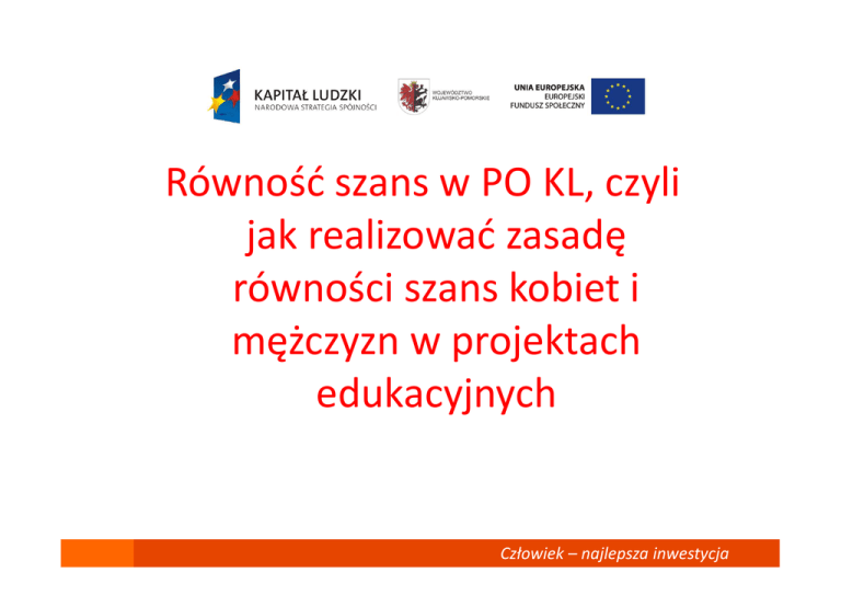 Równość szans w PO KL, czyli jak realizować zasadę równości szans kobiet i mężczyzn w projektach edukacyjnych Człowiek – najlepsza inwestycja STANDARD MINIMUM WNIOSKU PO KL 1. Czy projekt zawiera analizę sytuacji kobiet i mężczyzn dotyczącą obszaru interwencji i/lub zasięgu oddziaływania projektu, która wskazuje na nierówności ze względu na płeć? Tak □ Nie □ 2. Czy analiza sytuacji kobiet i mężczyzn zawiera dane ilościowe, które wskazują na brak istniejących nierówności w obszarze interwencji i/lub zasięgu oddziaływania projektu? Tak □ Nie □ 3. Czy użyte w analizie sytuacji kobiet i mężczyzn dane w podziale na płeć dotyczą obszaru interwencji i zasięgu oddziaływania projektu? Tak □ Nie □ Człowiek – najlepsza inwestycja Standard minimum - działania 4. Czy działania odpowiadają na nierówności ze względu na płeć istniejące w obszarze interwencji i/lub zasięgu oddziaływania projektu i/lub różnicują działania (formy wsparcia) dla kobiet i mężczyzn? Tak □ Nie □ Minimalnym wymogiem we wniosku o dofinansowanie powinno być podanie przynajmniej jednego przykładu działania jakie zostanie zrealizowane w projekcie na rzecz wyrównywania nierówności i barier zdiagnozowanych w analizie sytuacji kobiet i mężczyzn lub działania zróżnicowanego pod kątem odmiennych potrzeb kobiet i mężczyzn. 5. Czy rezultat(y) są podane w podziale na płeć i/lub wskazują jak projekt wpłynie na sytuację kobiet i mężczyzn w obszarze interwencji i/lub zasięgu oddziaływania projektu? Tak □ Nie □ 6. Czy projekt wskazuje w jaki sposób zostanie zapewnione równościowe zarządzanie projektem ? Tak □ Nie □ Człowiek – najlepsza inwestycja Standard minimum - działania Czym jest równościowe zarządzanie projektem? Planując równościowe zarządzanie projektem warto zastanowić się nad podjęciem jednego lub kilku z następujących działań: 1. Określenie obowiązków związanych z realizacją zasady równości szans kobiet i mężczyzn, które wynikają ze specyfiki projektu. Może to być zbieranie danych o uczestnikach/uczestniczkach, monitorowanie wskaźników osiągnięcia produktów/rezultatów i sprawozdawczość prowadzone w podziale na płeć, przygotowanie wszystkich materiałów promocyjnych z uwzględnieniem zasad równościowej komunikacji, Obowiązki te można zdefiniować jako zadanie projektowe połączone z konkretnymi działaniami i przypisać odpowiedzialność za ich wypełnianie do konkretnych stanowisk w zespole projektowym. 2. Wzmocnienie kompetencji zespołu projektowego w stosowaniu zasady równych szans kobiet i mężczyzn w obszarze problemowym poprzez zaplanowanie i organizację warsztatów uwrażliwiających, szkoleń tematycznych, konsultacji eksperckich dla zespołu projektowego itp. Warto pamiętać, że nie tylko personel kluczowy, ale także by ważni wykonwacy (trenerzy/trenerki, doradcy/doradczynie) byli świadomi tego, czym jest zasad równych sznas kobiet i mężczyzn. Człowiek – najlepsza inwestycja Standard minimum - działania Czym jest równościowe zarządzanie projektem? Planując równościowe zarządzanie projektem warto zastanowić się nad podjęciem jednego lub kilku z następujących działań: 3. Włączenie do projektu osób lub organizacji posiadających wiedzę i doświadczenie w prowadzeniu działań z zachowaniem zasady równości szans kobiet i mężczyzn. Warto pamiętać, że ekspertyza dotycząca równości płci od lat istnieje w organizacjach kobiecych i feministycznych, ale także w innych organizacjach, które realizowały projekty odnoszące się do promowania równości w poprzednim okresie programowania EFS. 4. Zapewnienie, że proces podejmowania decyzji w projekcie zaangażowani są zarówno mężczyźni, jak i kobiety. Struktura zarządzania powinna zagwarantować zrównoważony pod katem płci udział w procesach decyzyjnych, a także wspierać mężczyzn w działaniach na rzecz równość płci. Uwaga ! Kodeks pracy – kryterium płci przy rekrutacji. 5. Wprowadzenie rzeczywistych możliwości godzenia życia zawodowego i prywatnego przez kobiety i mężczyzn pracujących w zespole projektowym. Zróżnicowane formy m.in. Elastycznych form pracy. Człowiek – najlepsza inwestycja Standard minimum - wyjątki 7. Czy projekt należy do wyjątku, co do którego nie stosuje się standardu minimum? Tak □ Nie □ Niestosowanie standardu minimum wynika z: 1) Profilu działalności projektodawcy ze względu na ograniczenia statutowe (np. Stowarzyszenie Samotnych Ojców, teren zakładu karnego) – w treści wniosku beneficjent umieszcza zapis np. w formie oświadczenia, iż projekt należy do wyjątku z powodu ograniczeń statutowych. Uwaga!!! Brak niniejszej informacji we wniosku o dofinansowanie wyklucza możliwość zakwalifikowania tego wniosku do niniejszego wyjątku. Człowiek – najlepsza inwestycja 2) Realizacji działań pozytywnych (działania te pozwalają na wpłynięcie na niekorzystną sytuację danej płci w konkretnym obszarze interwencji projektu, a tym samym wyrównywanie jej szans społecznych i zawodowych) Z działaniami pozytywnymi mamy do czynienia wtedy, kiedy istnieje uzasadniona potrzeba (analiza sytuacji płci odnosząca się do obszaru i/lub zasięgu interwencji) skierowania działań do tylko i wyłącznie jednej płci. Uwaga!!! Jeśli projekt można zaliczyć do wyjątku z powodu realizacji działań pozytywnych, to beneficjent musi zawrzeć we wniosku analizę sytuacji kobiet i mężczyzn wskazującą na konieczność realizacji takich działań. Człowiek – najlepsza inwestycja 3) Zamkniętej rekrutacji Przez rekrutację zamkniętą należy rozumieć sytuację gdy projekt obejmuje – ze względu na swój zakres oddziaływaniawsparciem wszystkich pracowników/personel konkretnego podmiotu czy konkretnej grupy podmiotu. Beneficjent musi podać we wniosku informację, że jego projekt należy do wyjątku od standardu 