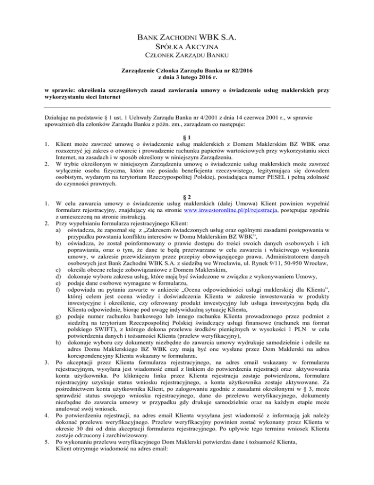 BANK ZACHODNI WBK S.A. SPÓŁKA AKCYJNA CZŁONEK ZARZĄDU BANKU Zarządzenie Członka Zarządu Banku nr 82/2016 z dnia 3 lutego 2016 r. w sprawie: określenia szczegółowych zasad zawierania umowy o świadczenie usług maklerskich przy wykorzystaniu sieci Internet Działając na podstawie § 1 ust. 1 Uchwały Zarządu Banku nr 4/2001 z dnia 14 czerwca 2001 r., w sprawie upoważnień dla członków Zarządu Banku z późn. zm., zarządzam co następuje: 1. 2. 1. 2. 3. 4. 5. §1 Klient może zawrzeć umowę o świadczenie usług maklerskich z Domem Maklerskim BZ WBK oraz rozszerzyć jej zakres o otwarcie i prowadzenie rachunku papierów wartościowych przy wykorzystaniu sieci Internet, na zasadach i w sposób określony w niniejszym Zarządzeniu. W trybie określonym w niniejszym Zarządzeniu umowę o świadczenie usług maklerskich może zawrzeć wyłącznie osoba fizyczna, która nie posiada beneficjenta rzeczywistego, legitymująca się dowodem osobistym, wydanym na terytorium Rzeczypospolitej Polskiej, posiadająca numer PESEL i pełną zdolność do czynności prawnych. §2 W celu zawarcia umowy o świadczenie usług maklerskich (dalej Umowa) Klient powinien wypełnić formularz rejestracyjny, znajdujący się na stronie www.inwestoronline.pl/pl/rejestracja, postępując zgodnie z umieszczoną na stronie instrukcją. Przy wypełnianiu formularza rejestracyjnego Klient: a) oświadcza, że zapoznał się z „Zakresem świadczonych usług oraz ogólnymi zasadami postępowania w przypadku powstania konfliktu interesów w Domu Maklerskim BZ WBK”, b) oświadcza, że został poinformowany o prawie dostępu do treści swoich danych osobowych i ich poprawiania, oraz o tym, że dane te będą przetwarzane w celu zawarcia i właściwego wykonania umowy, w zakresie przewidzianym przez przepisy obowiązującego prawa. Administratorem danych osobowych jest Bank Zachodni WBK S.A. z siedzibą we Wrocławiu, ul. Rynek 9/11, 50-950 Wrocław, c) określa obecne relacje zobowiązaniowe z Domem Maklerskim, d) dokonuje wyboru zakresu usług, które mają być świadczone w związku z wykonywaniem Umowy, e) podaje dane osobowe wymagane w formularzu, f) odpowiada na pytania zawarte w ankiecie „Ocena odpowiedniości usługi maklerskiej dla Klienta”, której celem jest ocena wiedzy i doświadczenia Klienta w zakresie inwestowania w produkty inwestycyjne i określenie, czy oferowany produkt inwestycyjny lub usługa inwestycyjna będą dla Klienta odpowiednie, biorąc pod uwagę indywidualną sytuację Klienta, g) podaje numer rachunku bankowego lub innego rachunku Klienta prowadzonego przez podmiot z siedzibą na terytorium Rzeczpospolitej Polskiej świadczący usługi finansowe (rachunek ma format polskiego SWIFT), z którego dokona przelewu środków pieniężnych w wysokości 1 PLN w celu potwierdzenia danych i tożsamości Klienta (przelew weryfikacyjny), h) dokonuje wyboru czy dokumenty niezbędne do zawarcia umowy wydrukuje samodzielnie i odeśle na adres Domu Maklerskiego BZ WBK czy mają być one wysłane przez Dom Maklerski na adres korespondencyjny Klienta wskazany w formularzu. Po akceptacji przez Klienta formularza rejestracyjnego, na adres email wskazany w formularzu rejestracyjnym, wysyłana jest wiadomość email z linkiem do potwierdzenia rejestracji oraz aktywowania konta użytkownika. Po kliknięciu linka przez Klienta rejestracja zostaje potwierdzona, formularz rejestracyjny uzyskuje status wniosku rejestracyjnego, a konta użytkownika zostaje aktywowane. Za pośrednictwem konta użytkownika Klient, po zalogowaniu zgodnie z zasadami określonymi w § 3, może sprawdzić status swojego wniosku rejestracyjnego, dane do przelewu weryfikacyjnego, dokumenty niezbędne do zawarcia umowy w przypadku gdy drukuje samodzielnie oraz na każdym etapie może anulować swój wniosek. Po potwierdzeniu rejestracji, na adres email Klienta wysyłana jest wiadomość z informacją jak należy dokonać przelewu weryfikacyjnego. Przelew weryfikacyjny powinien zostać wykonany przez Klienta w okresie 30 dni od dnia akceptacji formularza rejestracyjnego. Po upływie tego terminu wniosek Klienta zostaje odrzucony i zarchiwizowany. Po wykonaniu przelewu weryfikacyjnego Dom Maklerski potwierdza dane i tożsamość Klienta, Klient otrzymuje wiadomość na adres email: a) w przypadku wybrania samodzielnego wydrukowania dokumentów niezbędnych do zawarcia umowy – o możliwości wydrukowania przygotowanych dla Klienta dokumentów, które są dostępne po zalogowaniu na konto użytkownika, konieczności ich podpisania, parafowania każdej strony i odesłania na adres Domu Maklerskiego, b) w przypadku wybrania opcji drukowania dokumentów niezbędnych do zawarcia umowy przez Dom Maklerski na koncie użytkownika pojawia się informacja o wysłaniu dokumentów przez Dom Maklerski na adres korespondencyjny Klienta. 6. Po dokonaniu weryfikacji danych i tożsamości Klienta zgodnie z ust. 5, Dom Maklerski dokonuje zwrotnego przelewu kwoty 1 PLN na rachunek Klienta, z którego został dokonany przelew weryfikacyjny. 7. Do zawarcia Umowy niezbędne jest podpisanie przez Klienta: a. formularza Dane klienta, b. Oceny odpowiedniości usługi maklerskiej dla Klienta, c. Umowy o świadczenie usług maklerskich, d. Pełnomocnictwa do Umowy maklerskiej dla Domu Maklerskiego, e. Dyspozycji określającej szczegółowe warunki świadczenia usług maklerskich, f. dodatkowe Oświadczenia jeżeli są wymagane. 8. W przypadku rozszerzenia zakresu Umowy o usługę otwarcia i prowadzenia rachunku papierów wartościowych, oprócz dokumentów wskazanych w ust. 7, należy podpisać Dyspozycję otwarcia i prowadzenia rachunku inwestycyjnego oraz Dyspozycję określenia hasła identyfikacyjnego klienta do Umowy maklerskiej. 9. Dokumenty wskazane w ust. 7 oraz 8 nie mogą być przez Klienta zmieniane lub przerabiane. Dokumenty, które zostaną podrobione lub przerobione nie będą przez Dom Maklerski podpisywane. Obostrzenia wskazane w pop