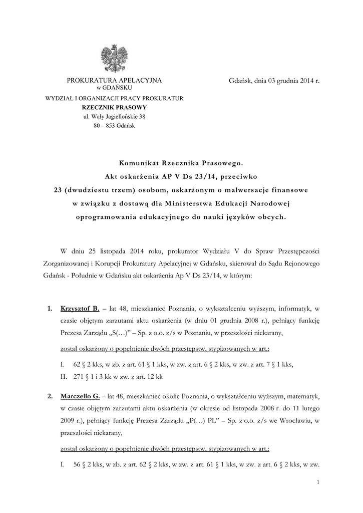 PROKURATURA APELACYJNA w GDAŃSKU Gdańsk, dnia 03 grudnia 2014 r. WYDZIAŁ I ORGANIZACJI PRACY PROKURATUR RZECZNIK PRASOWY ul. Wały Jagiellońskie 38 80 – 853 Gdańsk Komunikat Rzecznika Prasowego. Akt oskarżenia AP V Ds 23/14, przeciwko 23 (dwudziestu trzem) osobom, oskarżonym o malwersacje finansowe w związku z dostawą dla M inisterstwa Edukacji Narodowej oprogramowania edukacyjnego do nauki języków obcych . W dniu 25 listopada 2014 roku, prokurator Wydziału V do Spraw Przestępczości Zorganizowanej i Korupcji Prokuratury Apelacyjnej w Gdańsku, skierował do Sądu Rejonowego Gdańsk - Południe w Gdańsku akt oskarżenia Ap V Ds 23/14, w którym: 1. Krzysztof B. – lat 48, mieszkaniec Poznania, o wykształceniu wyższym, informatyk, w czasie objętym zarzutami aktu oskarżenia (w dniu 01 grudnia 2008 r.), pełniący funkcję Prezesa Zarządu „S(…)” – Sp. z o.o. z/s w Poznaniu, w przeszłości niekarany, został oskarżony o popełnienie dwóch przestępstw, stypizowanych w art.: I. 62 § 2 kks, w zb. z art. 61 § 1 kks, w zw. z art. 6 § 2 kks, w zw. z art. 7 § 1 kks, II. 271 § 1 i 3 kk w zw. z art. 12 kk 2. Marczello G. – lat 48, mieszkaniec okolic Poznania, o wykształceniu wyższym, matematyk, w czasie objętym zarzutami aktu oskarżenia (w okresie od listopada 2008 r. do 11 lutego 2009 r.), pełniący funkcję Prezesa Zarządu „P(…) PL” – Sp. z o.o. z/s we Wrocławiu, w przeszłości niekarany, został oskarżony o popełnienie dwóch przestępstw, stypizowanych w art.: I. 56 § 2 kks, w zb. z art. 62 § 2 kks, w zw. z art. 61 § 1 kks, w zw. z art. 6 § 2 kks, w zw. 1 z art. 7 § 1 kks, II. 273 kk i z art. 271 § 1 i 3 kk, w zb. z art. 273 kk, w zw. z art. 12 kk, w zw. z art. 11§ 2 kk 3. Maciej T. – lat 44, mieszkaniec okolic Poznania, o wykształceniu wyższym, ekonomista, w czasie objętym zarzutami aktu oskarżenia (w dniu 01 grudnia 2008 r.), pełniący funkcję Dyrektora Handlowego „P(…) PL” – Sp. z o.o. z/s we Wrocławiu, w przeszłości niekarany, został oskarżony o popełnienie dwóch przestępstw, stypizowanych w art.: I. 18 § 3 kk, w zw. z art. 20 § 2 kks, w zw. z art. 62 § 2 kks, w zb. z art. 61 § 1 kks, w zw. z art. 6 § 2 kks, w zw. z art. 7 § 1 kks, II. 18 § 3 kk, w zw. z art. 273 kk i z art. 18 § 3 kk, w zw. z art. 271 § 1 i 3 kk, w zb. z art. 273 kk, w zw. z art. 12 kk,w zw. z art. 11§ 2 kk, 4. Dorota T. – lat 40, mieszkanka okolic Warszawy, o wykształceniu wyższym, magister zarządzania, w czasie objętym zarzutami aktu oskarżenia (w okresie od 01 grudnia 2008 r. do 30 marca 2009 r.), pełniąca funkcję Dyrektora Zarządzającego „Y(…)” – SA, z/s w Gdańsku, w przeszłości niekarana, została oskarżona o popełnienie dwóch przestępstw, stypizowanych w art.: I. 21 § 2 kk, w zw. z art. 20 § 2 kks, w zw. z art. 9 § 3 kks, w zw. z art. 56 § 1 kks, w zb. z art. 62 § 2 kks, w zb. z art. 61 § 1 kks, w zw. z art. 6 § 2 kks i art. 7 § 1 kks, II. 273 kk i art. 271 § 1 i 3 kk, w zb. z art. 273 kk, w zw. z art. 12 kk, w zw. z art. 11§ 2 kk, 5. Elżbieta B. – lat 38, mieszkanka Gdyni, o wykształceniu wyższym, magister zarządzania, w czasie objętym zarzutami aktu oskarżenia (w okresie od 01 grudnia 2008 r. do 30 marca 2009 r.), pełniąca funkcję Dyrektora Linii Biznesowej „Y(…)” – SA, z/s w Gdańsku, w przeszłości niekarana, została oskarżona o popełnienie dwóch przestępstw, stypizowanych w art.: I. 18 § 3 kk, w zw. z art. 20 § 2 kks, w zw. z art. 9 § 3 kks, w zw. z art. 56 § 1 kks, w zb. z art. 62 § 2 kks, w zb. z art. 61 § 1 kks, w zw. z art. 6 § 2 kks i art. 7 § 1 kks, II. 18 § 3 kk, w zw. z art. 273 kk i art. 18 § 3 kk, w zw. z art. 271 § 1 i 3 kk, w zb. z art. 273 kk, w zw. z art. 12 kk, w zw. z art. 11§ 2 kk, 6. Waldemar K. – lat 49, mieszkaniec okolic Gdańska, o wykształceniu wyższym, inżynier elektronik, w czasie objętym zarzutami aktu oskarżenia (w okresie od 01 grudnia 2008 r. do 30 marca 2009 r.), pełniący funkcję Prezesa Zarządu i Dyrektora Finansowego „Y(…)” – 2 SA, z/s w Gdańsku, w przeszłości niekarany, został oskarżony o popełnienie dwóch przestępstw, stypizowanych w art.: I. 56 § 1 kks, w zb. z art. 62 § 2 kks, w zb. z art. 61 § 1 kks, w zw. z art. 6 § 2 kks i z art. 7 § 1 kks, II. 273 kk, w zw. z art. 12 kk, 7. Jacek K. – lat 48, mieszkaniec Gdańska, o wykształceniu wyższym, inżynier elektronik, w czasie objętym zarzutami aktu oskarżenia (w okresie od 01 grudnia 2008 r. do 30 marca 2009 r.), pełniący funkcję Członka Zarządu i Dyrektora ds. Produkcji „Y(…)” – SA, z/s w Gdańsku, w przeszłości niekarany, został oskarżony o popełnienie dwóch przestępstw, stypizowanych w art.: I. 56 § 1 kks, w zb. z art. 62 § 2 kks, w zb. z art. 61 § 1 kks, w zw. z art. 6 § 2 kks i z art. 7 § 1 kks, II. 273 kk w zw. z art. 12 kk, 8. Piotr N. – lat 42, mieszkaniec okolic Warszawy, o wykształceniu wyższym, mgr międzynarodowych stosunków gospodarczych i politycznych, w czasie objętym zarzutami aktu oskarżenia (w dniu 01 grudnia 2008 r.), pełniący funkcję Dyrektora d/s Sektora Publicznego w „B(…)” Polska – Sp. z o.o., z/s w Warszawie, w przeszłości niekarany, został oskarżony o popełnienie dwóch przestępstw, stypizowanych w art.: I. 9 § 3 kks, w zw. z art. 62 § 2 kks, w zb. z art. 61 § 1 kks, w zw. z art. 6 § 2 kks, w zw. z art. 7 § 1 kks, II. 273 kk i art. 271 § 1 i 3 kk, w zb. z art. 273 kk, w zw. z art. 12 kk, zw. z art. 11 § 2 kk, 9. Andrzej W. – lat 62, mieszkaniec Krakowa , o wykształceniu wyższym, matematyk, w czasie objętym zarzutami aktu oskarżenia (w dniu 01 grudnia 2008 r.), pełniący funkcję Prezesa Zarządu Biura Informatyczno-Wdrożeniowego „K(…)” – Sp. z o.o., z/s w Krakowie, w przeszłości niekarany, został oskarżony o popełnienie dwóch przestępstw, stypizowanych w art.: I. 62 § 2 kks, w zb. z art. 61 § 1 kks, w zw. z art. 7 § 1 