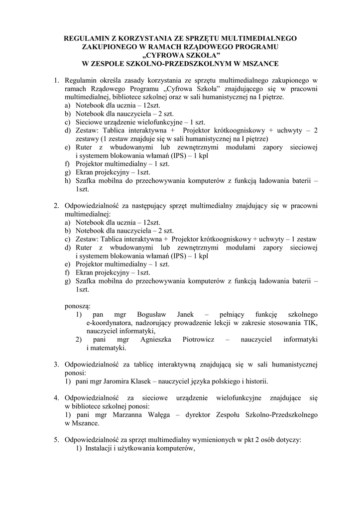 REGULAMIN Z KORZYSTANIA ZE SPRZĘTU MULTIMEDIALNEGO ZAKUPIONEGO W RAMACH RZĄDOWEGO PROGRAMU „CYFROWA SZKOŁA” W ZESPOLE SZKOLNO-PRZEDSZKOLNYM W MSZANCE 1. Regulamin określa zasady korzystania ze sprzętu multimedialnego zakupionego w ramach Rządowego Programu „Cyfrowa Szkoła” znajdującego się w pracowni multimedialnej, bibliotece szkolnej oraz w sali humanistycznej na I piętrze. a) Notebook dla ucznia – 12szt. b) Notebook dla nauczyciela – 2 szt. c) Sieciowe urządzenie wielofunkcyjne – 1 szt. d) Zestaw: Tablica interaktywna + Projektor krótkoogniskowy + uchwyty – 2 zestawy (1 zestaw znajduje się w sali humanistycznej na I piętrze) e) Ruter z wbudowanymi lub zewnętrznymi modułami zapory sieciowej i systemem blokowania włamań (IPS) – 1 kpl f) Projektor multimedialny – 1 szt. g) Ekran projekcyjny – 1szt. h) Szafka mobilna do przechowywania komputerów z funkcją ładowania baterii – 1szt. 2. Odpowiedzialność za następujący sprzęt multimedialny znajdujący się w pracowni multimedialnej: a) Notebook dla ucznia – 12szt. b) Notebook dla nauczyciela – 2 szt. c) Zestaw: Tablica interaktywna + Projektor krótkoogniskowy + uchwyty – 1 zestaw d) Ruter z wbudowanymi lub zewnętrznymi modułami zapory sieciowej i systemem blokowania włamań (IPS) – 1 kpl e) Projektor multimedialny – 1 szt. f) Ekran projekcyjny – 1szt. g) Szafka mobilna do przechowywania komputerów z funkcją ładowania baterii – 1szt. ponoszą: 1) pan mgr Bogusław Janek – pełniący funkcję szkolnego e-koordynatora, nadzorujący prowadzenie lekcji w zakresie stosowania TIK, nauczyciel informatyki, 2) pani mgr Agnieszka Piotrowicz – nauczyciel informatyki i matematyki. 3. Odpowiedzialność za tablicę interaktywną znajdującą się w sali humanistycznej ponosi: 1) pani mgr Jaromira Klasek – nauczyciel języka polskiego i historii. 4. Odpowiedzialność za sieciowe urządzenie wielofunkcyjne znajdujące się w bibliotece szkolnej ponosi: 1) pani mgr Marzanna Wałęga – dyrektor Zespołu Szkolno-Przedszkolnego w Mszance. 5. Odpowiedzialność za sprzęt multimedialny wymienionych w pkt 2 osób dotyczy: 1) Instalacji i użytkowania komputerów, 2) Prawidłowego korzystania z laptopów, sieciowego urządzenia wielofunkcyjnego, tablic interaktywnych, projektora multimedialnego, ekranu projekcyjnego, szafki mobilnej do przechowywania laptopów, 3) Decydowania o sposobie zapisu plików na komputerze przez nauczycieli klas IVI prowadzących zajęcia, 4) Ustalania harmonogramu zajęć z wykorzystaniem technologii TIK dla klas I-VI, 5) Dopilnowanie po zakończeniu zajęć lekcyjnych w pracowni multimedialnej w danym dniu, aby wszystkie laptopy znajdowały się w szafie mobilnej podłączone do ładowania baterii, pozostały sprzęt musi być odłączony od zasilania prądem, 6) Decydowanie wspólnie z dyrektorem o zabieraniu laptopów poza obiekt szkoły, zabieranie laptopów przez uczniów do domów na prośbę nauczyciela w celu odrobienia pracy domowej z wykorzystaniem laptopów lub dokończenia pracy rozpoczętej na lekcji. 6. Odpowiedzialność za tablicę interaktywną znajdującą się w sali humanistycznej wymienionej w pkt 3 osoby dotyczy: 1) prawidłowej obsługi tablicy interaktywnej, 2) nadzorowanie nad bezpiecznym korzystaniem z tablicy interaktywnej przez nauczycieli prowadzących zajęcia w sali humanistycznej i uczniów. 7. Odpowiedzialność za urządzenie wielofunkcyjne znajdujące się w bibliotece szkolnej wymienionej w pkt 4 osoby dotyczy: 1) prawidłowej obsługi urządzenia wielofunkcyjnego. 8. Odpowiedzialność nauczyciela, który wypożyczył komputer przenośny, projektor multimedialny, ekran projekcyjny na zajęcia lekcyjne dotyczy: 1) Prawidłowego korzystania z komputera, 2) Prawidłowego korzystania z projektora multimedialnego, 3)Przestrzegania zasad, które określili opiekunowie pracowni multimedialnej w tym w szczególności: konieczność logowania na wskazane konto z ograniczonymi uprawnieniami, ochrony wszystkich zasobów, zapewniających prawidłowa prace oprogramowania, przestrzegania zasad bezpiecznej pracy w sieci, 4) Przestrzegania uwag opiekunów dotyczących korzystania ze sprzętu wymienionego w pkt 1 niniejszego regulaminu. 9. Komputery przenośne zamknięte są w szafie mobilnej z funkcją ładowania baterii w sali multimedialnej na parterze. Klucz dostępny jest w bibliotece. 10. Komputery przenośne mogą być wyniesione poza teren szkoły za zgoda dyrektora Zespołu Szkolno-Przedszkolnego w Mszance oraz opiekunów sprzętu multimedialnego wymienionych w pkt 2. niniejszego regulaminu na okoliczności: wystąpienia nauczycieli lub uczniów odbywający się poza terenem placówki, konkursy, imprezy kulturalne, a także na prośbę nauczycieli nauczanych przedmiotów w celu odrobienia pracy domowej przez uczniów w domach. 11. Do wypożyczenia laptopa uprawnione są osoby pełnoletnie, będące prawnymi opiekunami ucznia Szkoły Podstawowej w Mszance. 12. Wypożyczenie sprzętu jest bezpłatne. 13. Komputery przenośne muszą być wykorzystywane wyłącznie do przygotowania zajęć bezpośrednio na zajęciach bądź wystąpieniach lub w celach komunikacji i tworzenia zasobów informacyjnych mających bezpośredni wpływ na jakość pracy szkoły. 14. Wszelkie uszkodzenia należy zgłaszać bezpośrednio po zaobserwowaniu zmian do opiekunów pracowni multimedialnej. 15. Opiekunowie pracowni multimedialnej zgłaszają dyrektorowi uszkodzenia, które nie da się usunąć w drodze podjętych działań zmierzających do usunięcia usterki bądź usprawnienia pracy komputerów lub innego sprzętu multimedialnego. 16. Wszelkie spory w zakresie wykorzystania sprzętu multimedialnego rozstrzyga Dyrektor Zespołu Szkolno-Przedszkolnego. 17. Integralną częścią regulaminu jest rejestr wypożyczania komputerów przenośnych poza obiekt szkoły, do domów – za zgodą dyrektora, opiekuna pracowni multimedialnej oraz nauczyciela prowadz