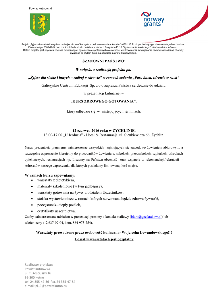 Powiat Kutnowski Projekt „Żyjesz dla siebie i innych – zadbaj o zdrowie” korzysta z dofinansowania w kwocie 3 465 115 PLN, pochodzącego z Norweskiego Mechanizmu Finansowego 2009-2014 oraz ze środków budżetu państwa w ramach Programu PL13 Ograniczanie społecznych nierówności w zdrowiu. Celem projektu jest poprawa zdrowia publicznego i ograniczenie społecznych nierówności w zdrowiu oraz zmniejszanie zachorowalności na choroby związane ze stylem życia na obszarze powiatu kutnowskiego. SZANOWNI PAŃSTWO! W związku z realizacją projektu pn. „Żyjesz dla siebie i innych – zadbaj o zdrowie” w ramach zadania „Para buch, zdrowie w ruch” Galicyjskie Centrum Edukacji Sp. z o o zaprasza Państwa serdecznie do udziału w prezentacji kulinarnej – „KURS ZDROWEGO GOTOWANIA”, który odbędzie się w następujących terminach: 12 czerwca 2016 roku w ŻYCHLINIE, 13.00-17.00 „U Jęrdusia” - Hotel & Restauracja, ul. Sienkiewicza 66, Żychlin. Naszą prezentacją pragniemy zainteresować wszystkich zajmujących się zawodowo żywieniem zbiorowym, a szczególne zaproszenie kierujemy do pracowników żywienia w szkołach, przedszkolach, szpitalach, ośrodkach opiekuńczych, restauracjach itp. Liczymy na Państwa obecność oraz wsparcie w rekomendacji/rekrutacji Adresatów naszego zaproszenia, dla których posiadamy limitowaną ilość miejsc. W ramach kursu zapewniamy: warsztaty z dietetykiem, materiały szkoleniowe (w tym jadłospisy), warsztaty gotowania na żywo z udziałem Uczestników, stoiska wystawiennicze w ramach których serwowana będzie zdrowa żywność, poczęstunek- ciepły posiłek, certyfikaty uczestnictwa. Osoby zainteresowane udziałem w prezentacji prosimy o kontakt mailowy ([email protected]) lub telefoniczny (12 637-09-04, kom. 884-975-754). Warsztaty prowadzone przez osobowość kulinarną- Wojciecha Lewandowskiego!!! Udział w warsztatach jest bezpłatny Realizator projektu: Powiat Kutnowski ul. T. Kościuszki 16 99-300 Kutno tel. 24 355-47-36 fax. 24 355-47-84 e-mail: [email protected]