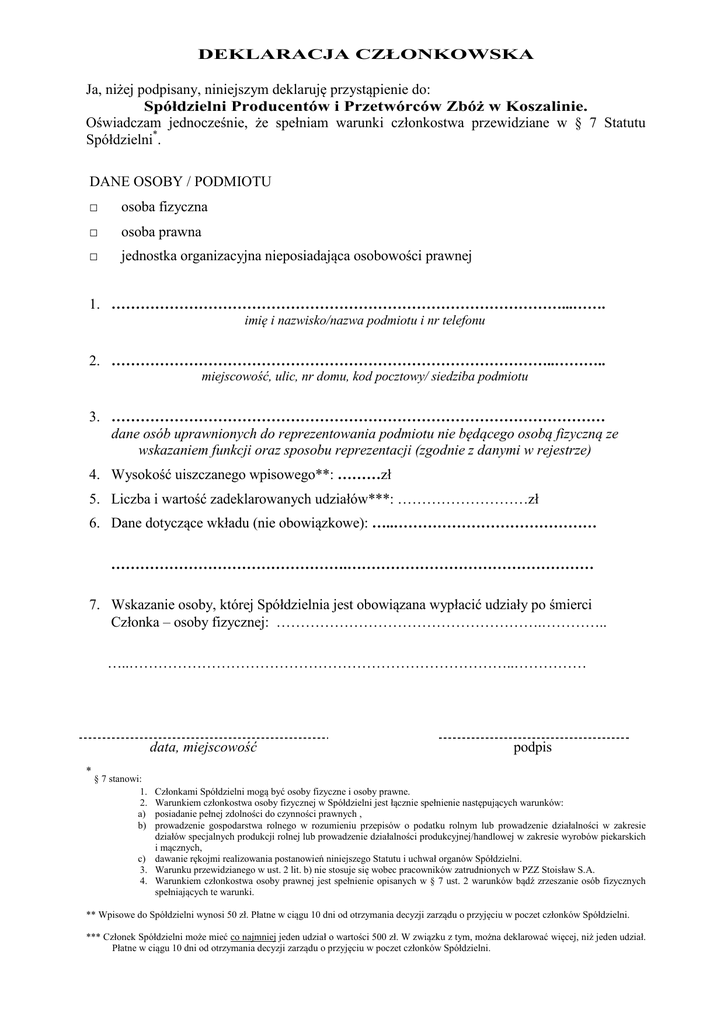 DEKLARACJA CZŁONKOWSKA Ja, niżej podpisany, niniejszym deklaruję przystąpienie do: Spółdzielni Producentów i Przetwórców Zbóż w Koszalinie. Oświadczam jednocześnie, że spełniam warunki członkostwa przewidziane w § 7 Statutu Spółdzielni*. DANE OSOBY / PODMIOTU □ osoba fizyczna □ osoba prawna □ jednostka organizacyjna nieposiadająca osobowości prawnej 1. …………………………………………………………………………………...……. imię i nazwisko/nazwa podmiotu i nr telefonu 2. ………………………………………………………………………………..……….. miejscowość, ulic, nr domu, kod pocztowy/ siedziba podmiotu 3. ………………………………………………………………………………………… dane osób uprawnionych do reprezentowania podmiotu nie będącego osobą fizyczną ze wskazaniem funkcji oraz sposobu reprezentacji (zgodnie z danymi w rejestrze) 4. Wysokość uiszczanego wpisowego**: ………zł 5. Liczba i wartość zadeklarowanych udziałów***: ………………………zł 6. Dane dotyczące wkładu (nie obowiązkowe): …..…………………………………… ………………………………………….…………………………………………… 7. Wskazanie osoby, której Spółdzielnia jest obowiązana wypłacić udziały po śmierci Członka – osoby fizycznej: ……………………………………………….………….. …..……………………………………………………………………..…………… data, miejscowość * podpis § 7 stanowi: 1. 2. a) b) Członkami Spółdzielni mogą być osoby fizyczne i osoby prawne. Warunkiem członkostwa osoby fizycznej w Spółdzielni jest łącznie spełnienie następujących warunków: posiadanie pełnej zdolności do czynności prawnych , prowadzenie gospodarstwa rolnego w rozumieniu przepisów o podatku rolnym lub prowadzenie działalności w zakresie działów specjalnych produkcji rolnej lub prowadzenie działalności produkcyjnej/handlowej w zakresie wyrobów piekarskich i mącznych, c) dawanie rękojmi realizowania postanowień niniejszego Statutu i uchwał organów Spółdzielni. 3. Warunku przewidzianego w ust. 2 lit. b) nie stosuje się wobec pracowników zatrudnionych w PZZ Stoisław S.A. 4. Warunkiem członkostwa osoby prawnej jest spełnienie opisanych w § 7 ust. 2 warunków bądź zrzeszanie osób fizycznych spełniających te warunki. ** Wpisowe do Spółdzielni wynosi 50 zł. Płatne w ciągu 10 dni od otrzymania decyzji zarządu o przyjęciu w poczet członków Spółdzielni. *** Członek Spółdzielni może mieć co najmniej jeden udział o wartości 500 zł. W związku z tym, można deklarować więcej, niż jeden udział. Płatne w ciągu 10 dni od otrzymania decyzji zarządu o przyjęciu w poczet członków Spółdzielni.