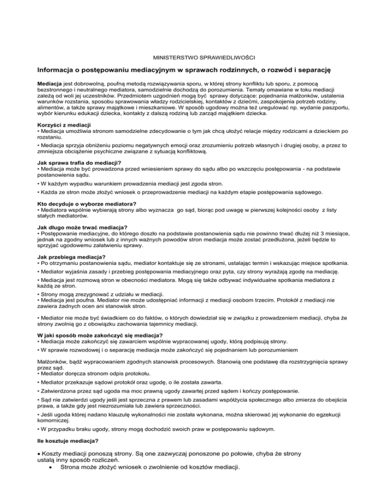 MINISTERSTWO SPRAWIEDLIWOŚCI Informacja o postępowaniu mediacyjnym w sprawach rodzinnych, o rozwód i separację Mediacja jest dobrowolną, poufną metodą rozwiązywania sporu, w której strony konfliktu lub sporu, z pomocą bezstronnego i neutralnego mediatora, samodzielnie dochodzą do porozumienia. Tematy omawiane w toku mediacji zależą od woli jej uczestników. Przedmiotem uzgodnień mogą być sprawy dotyczące: pojednania małżonków, ustalenia warunków rozstania, sposobu sprawowania władzy rodzicielskiej, kontaktów z dziećmi, zaspokojenia potrzeb rodziny, alimentów, a także sprawy majątkowe i mieszkaniowe. W sposób ugodowy można też uregulować np. wydanie paszportu, wybór kierunku edukacji dziecka, kontakty z dalszą rodziną lub zarząd majątkiem dziecka. Korzyści z mediacji • Mediacja umożliwia stronom samodzielne zdecydowanie o tym jak chcą ułożyć relacje między rodzicami a dzieckiem po rozstaniu. • Mediacja sprzyja obniżeniu poziomu negatywnych emocji oraz zrozumieniu potrzeb własnych i drugiej osoby, a przez to zmniejsza obciążenie psychiczne związane z sytuacją konfliktową. Jak sprawa trafia do mediacji? • Mediacja może być prowadzona przed wniesieniem sprawy do sądu albo po wszczęciu postępowania - na podstawie postanowienia sądu. • W każdym wypadku warunkiem prowadzenia mediacji jest zgoda stron. • Każda ze stron może złożyć wniosek o przeprowadzenie mediacji na każdym etapie postępowania sądowego. Kto decyduje o wyborze mediatora? • Mediatora wspólnie wybierają strony albo wyznacza go sąd, biorąc pod uwagę w pierwszej kolejności osoby z listy stałych mediatorów. Jak długo może trwać mediacja? • Postępowanie mediacyjne, do którego doszło na podstawie postanowienia sądu nie powinno trwać dłużej niż 3 miesiące, jednak na zgodny wniosek lub z innych ważnych powodów stron mediacja może zostać przedłużona, jeżeli będzie to sprzyjać ugodowemu załatwieniu sprawy. Jak przebiega mediacja? • Po otrzymaniu postanowienia sądu, mediator kontaktuje się ze stronami, ustalając termin i wskazując miejsce spotkania. • Mediator wyjaśnia zasady i przebieg postępowania mediacyjnego oraz pyta, czy strony wyrażają zgodę na mediację. • Mediacja jest rozmową stron w obecności mediatora. Mogą się także odbywać indywidualne spotkania mediatora z każdą ze stron. • Strony mogą zrezygnować z udziału w mediacji. • Mediacja jest poufna. Mediator nie może udostępniać informacji z mediacji osobom trzecim. Protokół z mediacji nie zawiera żadnych ocen ani stanowisk stron. • Mediator nie może być świadkiem co do faktów, o których dowiedział się w związku z prowadzeniem mediacji, chyba że strony zwolnią go z obowiązku zachowania tajemnicy mediacji. W jaki sposób może zakończyć się mediacja? • Mediacja może zakończyć się zawarciem wspólnie wypracowanej ugody, którą podpisują strony. • W sprawie rozwodowej i o separację mediacja może zakończyć się pojednaniem lub porozumieniem Małżonków, bądź wypracowaniem zgodnych stanowisk procesowych. Stanowią one podstawę dla rozstrzygnięcia sprawy przez sąd. • Mediator doręcza stronom odpis protokołu. • Mediator przekazuje sądowi protokół oraz ugodę, o ile została zawarta. • Zatwierdzona przez sąd ugoda ma moc prawną ugody zawartej przed sądem i kończy postępowanie. • Sąd nie zatwierdzi ugody jeśli jest sprzeczna z prawem lub zasadami współżycia społecznego albo zmierza do obejścia prawa, a także gdy jest niezrozumiała lub zawiera sprzeczności. • Jeśli ugoda której nadano klauzulę wykonalności nie została wykonana, można skierować jej wykonanie do egzekucji komorniczej. • W przypadku braku ugody, strony mogą dochodzić swoich praw w postępowaniu sądowym. Ile kosztuje mediacja? Koszty mediacji ponoszą strony. Są one zazwyczaj ponoszone po połowie, chyba że strony ustalą inny sposób rozliczeń. Strona może złożyć wniosek o zwolnienie od kosztów mediacji. W postępowaniu mediacyjnym ze skierowania sądu wysokość wynagrodzenia mediatora w sporach niemajątkowych wynosi 60 zł za pierwsze posiedzenie mediacyjne, a za każde następne posiedzenie- 25 zł. Jeśli postępowanie dotyczy praw majątkowych, wynagrodzenie mediatora wynosi 1% wartości przedmiotu sporu (nie mniej niż 30 zł i nie więcej niż 1.000 zł). Zwrotowi podlegają też wydatki mediatora poniesione w związku z przeprowadzeniem mediacji, w tym opłata za wynajem pomieszczenia do 50 zł za posiedzenie. Do kosztów mediacji dolicza się podatek VAT. Niezależnie od wyniku sprawy, sąd może nałożyć na stronę obowiązek zwrotu kosztów wywołanych oczywiście nieuzasadnioną odmową udziału w mediacji. Jeśli dojdzie do zawarcia ugody przed rozpoczęciem rozprawy, strona otrzyma zwrot 100% opłaty sądowej. Jeśli do zawarcia ugody przed mediatorem dojdzie na późniejszym etapie procesu (po rozpoczęciu rozprawy), strona otrzyma zwrot 75% opłaty sądowej. W sprawie o rozwód lub separację, jeżeli dojdzie do pojednania się stron przed sądem I instancji i cofnięcia pozwu, strona otrzymuje zwrot 100% opłaty sądowej, którą zapłaciła wnosząc sprawę do sądu. Jeżeli pojednanie się stron nastąpiło przed zakończeniem postępowania przed sądem II instancji, strona otrzymuje zwrot 50% uiszczonej opłaty od apelacji. . W przypadku mediacji pozasądowej wysokość wynagrodzenia mediatora wynika z cennika ośrodka mediacyjnego lub strony uzgadniają je razem z mediatorem przed rozpoczęciem mediacji.