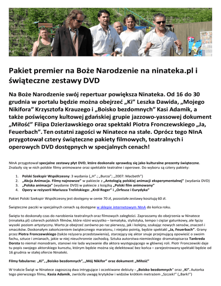 Pakiet premier na Boże Narodzenie na ninateka.pl i świąteczne zestawy DVD Na Boże Narodzenie swój repertuar powiększa Ninateka. Od 16 do 30 grudnia w portalu będzie można obejrzeć „Ki” Leszka Dawida, „Mojego Nikifora” Krzysztofa Krauzego i „Boisko bezdomnych” Kasi Adamik, a także poświęcony kultowej gdańskiej grupie jazzowo-yassowej dokument „Miłość” Filipa Dzierżawskiego oraz spektakl Piotra Fronczewskiego „Ja, Feuerbach”. Ten ostatni zagości w Ninatece na stałe. Oprócz tego NInA przygotował cztery świąteczne pakiety filmowych, teatralnych i operowych DVD dostępnych w specjalnych cenach! NInA przygotował specjalne zestawy płyt DVD, które doskonale sprawdzą się jako kulturalne prezenty świąteczne. Znalazły się w nich polskie filmy animowane oraz spektakle teatralne i operowe. Do wyboru są cztery pakiety: 1. 2. 3. 4. Polski Szekspir Współczesny: 3 wydania („H”.; „Burza”; „2007: Macbeth”) „Akcja Animacja. Filmy najnowsze” w pakiecie z „Antologią polskiej animacji eksperymentalnej” (wydania DVD) „Polska animacja” (wydanie DVD) w pakiecie z książką „Polski film animowany” Opery w reżyserii Mariusza Trelińskiego: „Król Roger” i „Orfeusz i Eurydyka” Pakiet Polski Szekspir Współczesny jest dostępny w cenie 70 zł, pozostałe zestawy kosztują 60 zł. Świąteczne paczki w specjalnych cenach są dostępne w sklepie internetowym NInA do końca roku. Święta to doskonały czas do narobienia teatralnych oraz filmowych zaległości. Zapraszamy do obejrzenia w Ninatece (ninateka.pl) czterech polskich filmów, które różni wszystko – tematyka, stylistyka, tempo i ciężar gatunkowy, ale łączy wysoki poziom artystyczny. Warto je obejrzeć zarówno po raz pierwszy, jak i kolejny, szukając nowych sensów, znaczeń i smaczków. Doskonałym zakończeniem świątecznego maratonu, i niejako pointą, będzie spektakl „Ja, Feuerbach”. Grany przez Piotra Fronczewskiego (także reżysera przedstawienia), starzejący się aktor snuje przejmującą opowieść o swoim fachu, sztuce i zmianach, jakie w niej nieuchronnie zachodzą. Sztuka autorstwa niemieckiego dramatopisarza Tankreda Dorsta to niemal monodram, stanowi nie lada wyzwanie dla aktora występującego w głównej roli. Piotr Fronczewski daje tu popis swojego aktorskiego kunsztu, którym będzie można się delektować bez końca – zarejestrowany spektakl będzie od 16 grudnia w stałej ofercie Ninateki. Filmy fabularne: „Ki”, „Boisko bezdomnych”, „Mój Nikifor” oraz dokument „Miłość” W trakcie Świąt w Ninatece zagoszczą dwa intrygujące i oczekiwane debiuty - „Boisko bezdomnych” oraz „Ki”. Autorka tego pierwszego filmu, Kasia Adamik, zwróciła uwagę krytyków i widzów krótkim metrażem „Szczek!” („Bark!”) pokazywanym w 2002 roku na festiwalu w Sundance. „Boisko bezdomnych” to ciepły komediodramat, którego bohaterowie, drużyna piłkarska złożona z tytułowych bezdomnych, gra nie tylko o zwycięstwo na murawie, ale też o godność. Kapitanem zespołu jest Jacek Mróz, dawniej świetnie zapowiadający się zawodnik, obecnie życiowy rozbitek, kapitalnie i z wyczuciem grany przez Marcina Dorocińskiego. Do aktorskiej „drużyny” Kasia Adamik zaprosiła też Jacka Poniedziałka, Bartłomieja Topę, Eryka Lubosa, Krzysztofa Kiersznowskiego i znanego krytyka kulinarnego i teatralnego Macieja Nowaka. U Adamik potyczki z życiem prowadzi grupa facetów, u Leszka Dawida, który przed fabularnym debiutem był wyróżniającym się talentem i wrażliwością dokumentalistą, o siebie walczy samotna matka dwuletniego synka. Mówi na niego „Pio”, a na siebie „Ki”, bo lubi zmieniać świat na mniej zwyczajny, bardziej własny. Ki (popisowa, nagrodzona na festiwalu w Gdyni rola Romy Gąsiorowskiej) chce żyć kolorowo, na przekór stereotypom; nie ma kłopotu z proszeniem o pomoc bliskich i dalszych znajomych, w tym dryfującego po codzienności Miko (Adam Woronowicz). Niech was nie zwiedzie hasło reklamujące film, „Ki – nie polubisz jej”, bo chcąc nie chcąc urokliwa bohaterka znajduje klucz do każdego serca i zostaje w nim na dłużej. „Mój Nikifor”to z kolei przejmująca, subtelna i przenikliwa opowieść o świadomej alienacji, ale i pokorze wobec własnego losu. Krzysztof Krauze opowiada tu o Nikiforze Krynickim (genialna rola „mistrzyni drugiego planu” Krystyny Feldman), malarzu-prymitywiście i jego niezwykłej relacji z malarzem Marianem Włosińskim, który dla niego poświęca własną karierę. Rozłożona na siedem lat (1960-1967) historia trudnej i pięknej przyjaźni dwóch artystów zdobyła trzy nagrody na festiwalu w Karlowych Warach: dla najlepszego filmu, najlepszego reżysera oraz dla najlepszej aktorki. Nie zawsze łatwe relacje między artystami to jeden z tematów wyśmienitego pełnometrażowego dokumentu Filipa Dzierżawskiego. „Miłość” to jazzowo-yassowa grupa założona w 1988 roku, w której skład weszli Tymon Tymański, Mikołaj Trzaska, Leszek Możdżer, Jacek Olter i Maciej Sikała. Eksplorujący granice jazzu i muzyki awangardowej zespół był jednym z najciekawszych zjawisk muzycznych lat 90. Przez piętnaście lat jego istnienia zmieniał się skład i estetyka, ale Miłość trwała. Zespół ostatecznie rozwiązano w 2002 roku, po śmierci Jacka Oltera. Dokument Filipa Dzierżawskiego powstał dekadę później; kierując kamerę na czterech muzyków z pierwszego składu zadaje nieuchronne pytanie o to, czy powrót do wspólnego grania jest jeszcze możliwy. W 2013 roku film „Miłość” wygrał Złotego Lajkonika, czyli Grand Prix Krakowskiego Festiwalu Filmowego, a rok później otrzymał prestiżową Gwarancję Kultury, przyznawaną przez TVP Kultura. Wszystkie cztery filmy będą dostępne w Ninatece od 16 do 30 grudnia 2016, natomiast spektakl „Ja, Feuerbach” zostanie włączony do portalu na stałe. Szczegóły kolejnyc