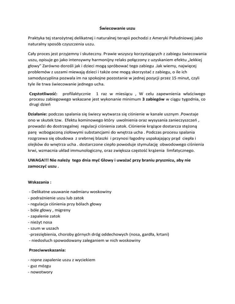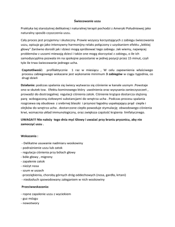 Świecowanie uszu Praktyka tej starożytnej delikatnej i naturalnej terapii pochodzi z Ameryki Południowej jako naturalny sposób czyszczenia uszu. Cały proces jest przyjemny i skuteczny. Prawie wszyscy korzystających z zabiegu świecowania uszu, opisuje go jako intensywny harmonijny relaks połączony z uzyskaniem efektu „lekkiej głowy” Zarówno dorośli jak i dzieci mogą spróbować tego zabiegu .Jak wiemy, najwięcej problemów z uszami miewają dzieci i także one mogą skorzystać z zabiegu, o ile ich samodyscyplina pozwala im na spokojne pozostanie w jednej pozycji przez 15 minut, czyli tyle ile trwa świecowanie jednego ucha. Częstotliwość: profilaktycznie 1 raz w miesiącu , W celu zapewnienia właściwego procesu zabiegowego wskazane jest wykonanie minimum 3 zabiegów w ciągu tygodnia, co drugi dzień Działanie: podczas spalania się świecy wytwarza się ciśnienie w kanale usznym .Powstaje ono w skutek tzw. Efektu kominowego który uwolnienia oraz wysysania zanieczyszczeń , prowadzi do dostrzegalnej regulacji ciśnienia zatok. Ciśnienie krążące dostarcza stężoną parę wzbogaconą ziołowymi substancjami do wnętrza ucha . Podczas procesu spalania rozgrzewa się obudowa z srebrnej blaszki i przynosi łagodny uspakajający prąd ciepła i olejków do wnętrza ucha . dostarczone ciepło powoduje stymulację obwodowego ciśnienia krwi, wzmacnia układ immunologiczny, oraz zwiększa częstość krążenia limfatycznego. UWAGA!!! Nie należy tego dnia myć Glowy i uważać przy braniu prysznicu, aby nie zamoczyć uszu . Wskazania : - Delikatne usuwanie nadmiaru woskowiny - podrażnienie uszu lub zatok - regulacja ciśnienia przy bólach głowy - bóle głowy , migreny - zapalenie zatok - nieżyt nosa - szum w uszach -przeziębienia, choroby górnych dróg oddechowych (nosa, gardła, krtani) - niedosłuch spowodowany zaleganiem w nich woskowiny Przeciwwskazania: - ropne zapalenie uszu z wyciekiem - guz mózgu - nowotwory