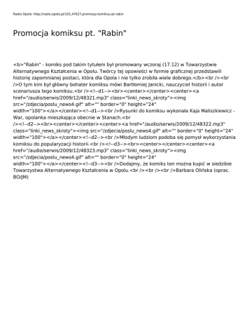 Radio Opole: http://radio.opole.pl/101,47627,promocja-komiksu-pt-rabin Promocja komiksu pt. "Rabin" <b>"Rabin" - komiks pod takim tytułem był promowany wczoraj (17.12) w Towarzystwie Alternatywnego Kształcenia w Opolu. Twórcy tej opowieści w formie graficznej przedstawili historię zapomnianej postaci, która dla Opola i nie tylko zrobiła wiele dobrego.</b><br /><br />O tym kim był główny bohater komiksu mówi Bartłomiej Janicki, nauczyciel historii i autor scenariusza tego komiksu.<br /><!--d1--><br><center></center><center><a href="/audio/serwis/2009/12/48321.mp3" class="linki_news_skroty"><img src="/zdjecia/poslu_news4.gif" alt="" border="0" height="24" width="100"></a></center><!--d1--><br />Rysunki do komiksu wykonała Kaja Maliszkiewicz War, opolanka mieszkająca obecnie w Stanach.<br /><!--d2--><br><center></center><center><a href="/audio/serwis/2009/12/48322.mp3" class="linki_news_skroty"><img src="/zdjecia/poslu_news4.gif" alt="" border="0" height="24" width="100"></a></center><!--d2--><br />Młodym ludziom podoba się pomysł wykorzystania komiksu do popularyzacji historii.<br /><!--d3--><br><center></center><center><a href="/audio/serwis/2009/12/48323.mp3" class="linki_news_skroty"><img src="/zdjecia/poslu_news4.gif" alt="" border="0" height="24" width="100"></a></center><!--d3--><br />Dodajmy, że komiks ten można kupić w siedzibie Towarzystwa Alternatywnego Kształcenia w Opolu.<br /><br /><br />Barbara Olińska (oprac. BO/JM)