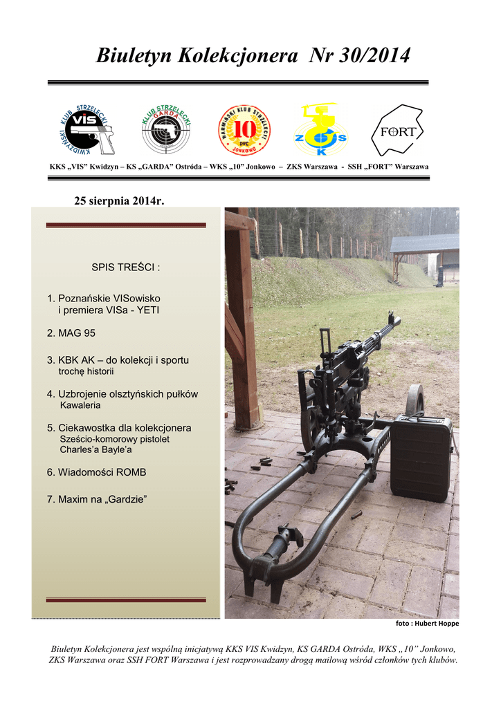 Biuletyn Kolekcjonera Nr 30/2014 KKS „VIS” Kwidzyn – KS „GARDA” Ostróda – WKS „10” Jonkowo – ZKS Warszawa - SSH „FORT” Warszawa 25 sierpnia 2014r. SPIS TREŚCI : 1. Poznańskie VISowisko i premiera VISa - YETI 2. MAG 95 3. KBK AK – do kolekcji i sportu trochę historii 4. Uzbrojenie olsztyńskich pułków Kawaleria 5. Ciekawostka dla kolekcjonera Sześcio-komorowy pistolet Charles’a Bayle’a 6. Wiadomości ROMB 7. Maxim na „Gardzie” foto : Hubert Hoppe Biuletyn Kolekcjonera jest wspólną inicjatywą KKS VIS Kwidzyn, KS GARDA Ostróda, WKS „10” Jonkowo, ZKS Warszawa oraz SSH FORT Warszawa i jest rozprowadzany drogą mailową wśród członków tych klubów. 1. POZNAŃSKIE VISOWISKO i PREMIERA PREMIERA VISAVISA-YETI W sobotę 19 lipca 2014 r. na strzelnicy Wielkopolskiego Towarzystwa Sportowego „Tarcza 96” w Poznaniu odbyła się impreza strzelecko–kolekcjonerska „VISowisko 2014”. Był to drugi ogólnopolski zlot posiadaczy i miłośników legendarnych polskich pistoletów Vis; pierwszy odbył się 25 maja 2013 r. na strzelnicy Związkowego Klubu Strzeleckiego w Warszawie (relacje: Łukasz Urbański, Wystawa kolekcjonersko–historyczna i Zawody strzeleckie „10 strzałów ku chwale Ojczyzny”. Klub ZKS w Warszawie, 25 maja 2013 r., „Biuletyn Kolekcjonera”, nr 16/2013, s. 12–15; Leszek Erenfeicht, 10 strzałów ku chwale Ojczyzny — z Visa!, „Strzał. Magazyn o Broni”, 2013, nr 7, s. 80–81). Początkowo planowano aby kolejny zlot odbył się ponownie w ZKS w Warszawie 15 czerwca b.r. (vide: „Biuletyn Kolekcjonera”, nr 28/2014, s. 2–3), ale z przyczyn filodoksyjnych okazało się to nierealne. Organizatorami imprezy była firma Rusznikarstwo i Ślusarstwo Precyzyjne Ryszarda Tobysa z Piotrowa Drugiego, Sekcja Kolekcjonersko–Historyczna Związkowego Klubu Strzeleckiego w Warszawie, Towarzystwo Strzelecko–Historyczne „Fort” w Warszawie oraz Klub Strzelecki „Garda” w Ostródzie. Patronat honorowy zechcieli przyjąć: p. Adam Gołembowski — Prezes Zjednoczenia Kurkowych Bractw Strzeleckich Rzeczypospolitej Polskiej, p. Tomasz Kwiecień — Prezes Polskiego Związku Strzelectwa Sportowego oraz p. Andrzej Turczyn — Prezes Ruchu Obywatelskiego Miłośników Broni. Patronat medialny objęły: „Strzał. Magazyn o Broni” z Warszawy, ośrodek regionalny w Poznaniu Telewizji Polskiej oraz dziennik „Głos Wielkopolski” z Poznania. Formalnym pretekstem do zlotu było ukończenie przez p. Ryszarda Tobysa prac nad prototypowymi Visami (nr 0001 i 0002) w kalibrze 0.45 ACP, co stanowiło jego osobiste zmierzenie się z legendarnymi, powszechnie uważanymi za zaginione, pistoletami skonstruowanymi w 1937 r. z przeznaczeniem na południowoamerykański pokaz przez zespół inż. Jerzego Podsędkowskiego z Biura Studiów Państwowej Fabryki Karabinów w Warszawie. Fotografia reklamowa firmy Rusznikarstwo i Ślusarstwo Precyzyjne p. Ryszarda Tobysa Oś imprezy stanowiła przeszklona gablota zawierająca barwny i zróżnicowany dorobek firmy Rusznikarstwo i Ślusarstwo Precyzyjne p. Ryszarda Tobysa, wielce zasłużonej dla zachowania i rekonstrukcji substancji zabytkowej dawnej polskiej broni, a zatem: przeskalowany do gigantycznych rozmiarów czarnoprochowy rewolwer Remington 1859 Model New Army z 2002 r. (wpisany do Księgi Rekordów Guinessa) wraz ze swoim pierwowzorem, monstrualny dwulufowy pistolet kapiszonowy typu Derringer oraz jego źródło wymiarów „ludzkich”, replika karabinu Józefa Maroszka kb.sp. wz. 38M, wytwarzany od niedawna zmodyfikowany kaburo–futerał ftk wz. 39 do pistoletu Vis wz. 35 oraz kilka elementów pistoletu Vis kal. 0.45 ACP na różnych etapach obróbki skrawaniem. „VISowisko 2014” — część stoiska warszawskiego. Fot. Wojciech Weiler „VISowisko 2014” — część stoiska wrocławskiego. Fot. Wojciech Weiler Z kolei na wystawie, której komisarzem był niżej podpisany, swoje zbiory prezentowali p. Ryszard Tobys oraz członkowie Sekcji Kolekcjonersko–Historycznej Związkowego Klubu Strzeleckiego z Warszawy, Towarzystwa Strzelecko–Historycznego „Fort” z Warszawy, Klubu Strzeleckiego „Garda” z Ostródy, Bractwa Kurkowego Miasta Wrocławia z Wrocławia oraz Kwidzyńskiego Stowarzyszenia Sportowo–Kolekcjonerskiego „Gward” z Kwidzyna (alfabetycznie: Andrzej Dobrowolski, Leszek Erenfeicht, Janusz Gałucki, Agata Grabowska, Adam Krzyżaniak, Ryszard Krynicki, Karina Nowicka, Piotr Nowicki, Krzysztof Pawela, Michał Pawela i Artur Wołosz). Znużeni dokuczliwym upałem zwiedzający mogli pokrzepić ciała wyrobami lokalnej masarni, natomiast nacieszyć dusze i dłonie kilkudzisięcioma sztukami polskiej broni palnej — od przedwojennych Nagantów Ng30, przedwojennych i okupacyjnych Visów, poprzez powojenne tzw. Radomki, TeTetki sportowe i bojowe, pistolet maszynowy P–63, pistolety P–64 i P–83, aż do bliższych mam Magów 95 i 98 oraz 2 pistoletów Vis z produkcji najnowszej. Co znamienne — zabrakło choćby jednego radomskiego „Kałacha”. Tradycyjnie — jak przystało na przedsięwzięcie przygotowane przez kolekcjonerskie środowisko mazowiecko–warmińskie — ekspozycji towarzyszył katalog zawierający spis eksponatów oraz kilka artykułów. Tym razem znalazły się w nim teksty Leszka Erenfeichta (str. 4–7 — Pistolet Vis wz. 35 oraz str. 10–16 — Vis–Yeti), Agaty Grabowskiej (str. 7–10 — Odznaka Strzelecka Związku Strzeleckiego i zawody „10 strzałów ku chwale Ojczyzny”) i Artura Wołosza (str. 1–3 — Wrogowie, których nie było… oraz str. 16–19 — Dzieci Józefa Maroszka). „VISowisko 2014” — Vis, plany Visa i dyplom okolicznościowy. Fot. Wojciech Weiler „VISowisko 2014” — strzelanie. Fot. Wojciech Weiler Dwa ostatnie teksty nawiązywały bezpośrednio do trzeciej części imprezy czyli turnieju strzeleckiego, w którym wzięło udział 42 uczestników. Strzelcy oddawali strzały z 2 Visów kal. 0.45 AC