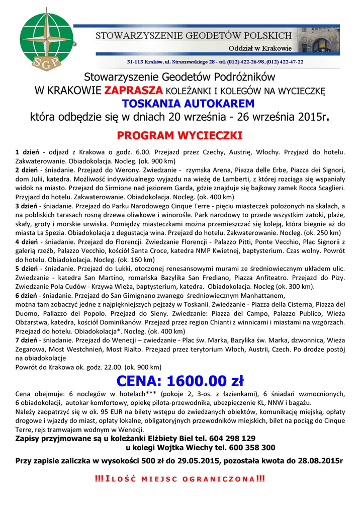 Stowarzyszenie Geodetów Podróżników W KRAKOWIE ZAPRASZA KOLEŻANKI I KOLEGÓW NA WYCIECZKĘ TOSKANIA AUTOKAREM która odbędzie się w dniach 20 września - 26 września 2015r. PROGRAM WYCIECZKI 1 dzień - odjazd z Krakowa o godz. 6.00. Przejazd przez Czechy, Austrię, Włochy. Przyjazd do hotelu. Zakwaterowanie. Obiadokolacja. Nocleg. (ok. 900 km) 2 dzień - śniadanie. Przejazd do Werony. Zwiedzanie - rzymska Arena, Piazza delle Erbe, Piazza dei Signori, dom Julii, katedra. Możliwość indywidualnego wyjazdu na wieżę de Lamberti, z której rozciąga się wspaniały widok na miasto. Przejazd do Sirmione nad jeziorem Garda, gdzie znajduje się bajkowy zamek Rocca Scaglieri. Przyjazd do hotelu. Zakwaterowanie. Obiadokolacja. Nocleg. (ok. 400 km) 3 dzień - śniadanie. Przejazd do Parku Narodowego Cinque Terre - pięciu miasteczek położonych na skałach, a na pobliskich tarasach rosną drzewa oliwkowe i winorośle. Park narodowy to przede wszystkim zatoki, plaże, skały, groty i morskie urwiska. Pomiędzy miasteczkami można przemieszczać się koleją, która biegnie aż do miasta La Spezia. Obiadokolacja z degustacja wina. Przejazd do hotelu. Zakwaterowanie. Nocleg. (ok. 250 km) 4 dzień - śniadanie. Przejazd do Florencji. Zwiedzanie Florencji - Palazzo Pitti, Ponte Vecchio, Plac Signorii z galerią rzeźb, Palazzo Vecchio, kościół Santa Croce, katedra NMP Kwietnej, baptysterium. Czas wolny. Powrót do hotelu. Obiadokolacja. Nocleg. (ok. 160 km) 5 dzień - śniadanie. Przejazd do Lukki, otoczonej renesansowymi murami ze średniowiecznym układem ulic. Zwiedzanie - katedra San Martino, romańska Bazylika San Frediano, Piazza Anfiteatro. Przejazd do Pizy. Zwiedzanie Pola Cudów - Krzywa Wieża, baptysterium, katedra. Obiadokolacja. Nocleg (ok. 300 km). 6 dzień - śniadanie. Przejazd do San Gimignano zwanego średniowiecznym Manhattanem, można tam zobaczyć jedne z najpiękniejszych pejzaży w Toskanii. Zwiedzanie - Piazza della Cisterna, Piazza del Duomo, Pallazzo dei Popolo. Przejazd do Sieny. Zwiedzanie: Piazza del Campo, Palazzo Publico, Wieża Obżarstwa, katedra, kościół Dominikanów. Przejazd przez region Chianti z winnicami i miastami na wzgórzach. Przejazd do hotelu. Obiadokolacja*. Nocleg. (ok. 400 km) 7 dzień - śniadanie. Przejazd do Wenecji – zwiedzanie - Plac św. Marka, Bazylika św. Marka, dzwonnica, Wieża Zegarowa, Most Westchnień, Most Rialto. Przejazd przez terytorium Włoch, Austrii, Czech. Po drodze postój na obiadokolacje Powrót do Krakowa ok. godz. 22.00. (ok. 900 km) CENA: 1600.00 zł Cena obejmuje: 6 noclegów w hotelach*** (pokoje 2, 3-os. z łazienkami), 6 śniadań wzmocnionych, 6 obiadokolacji, autokar komfortowy, opiekę pilota-przewodnika, ubezpieczenie KL, NNW i bagażu. Należy zaopatrzyć się w ok. 95 EUR na bilety wstępu do zwiedzanych obiektów, komunikację miejską, opłaty drogowe i wjazdy do miast, opłaty lokalne, obligatoryjnych przewodników miejskich, bilet na pociąg do Cinque Terre, rejs tramwajem wodnym w Wenecji. Zapisy przyjmowane są u koleżanki Elżbiety Biel tel. 604 298 129 u kolegi Wojtka Wiechy tel. 600 358 300 Przy zapisie zaliczka w wysokości 500 zł do 29.05.2015, pozostała kwota do 28.08.2015r !!! I L O Ś Ć MIEJSC OGRANICZONA !!!