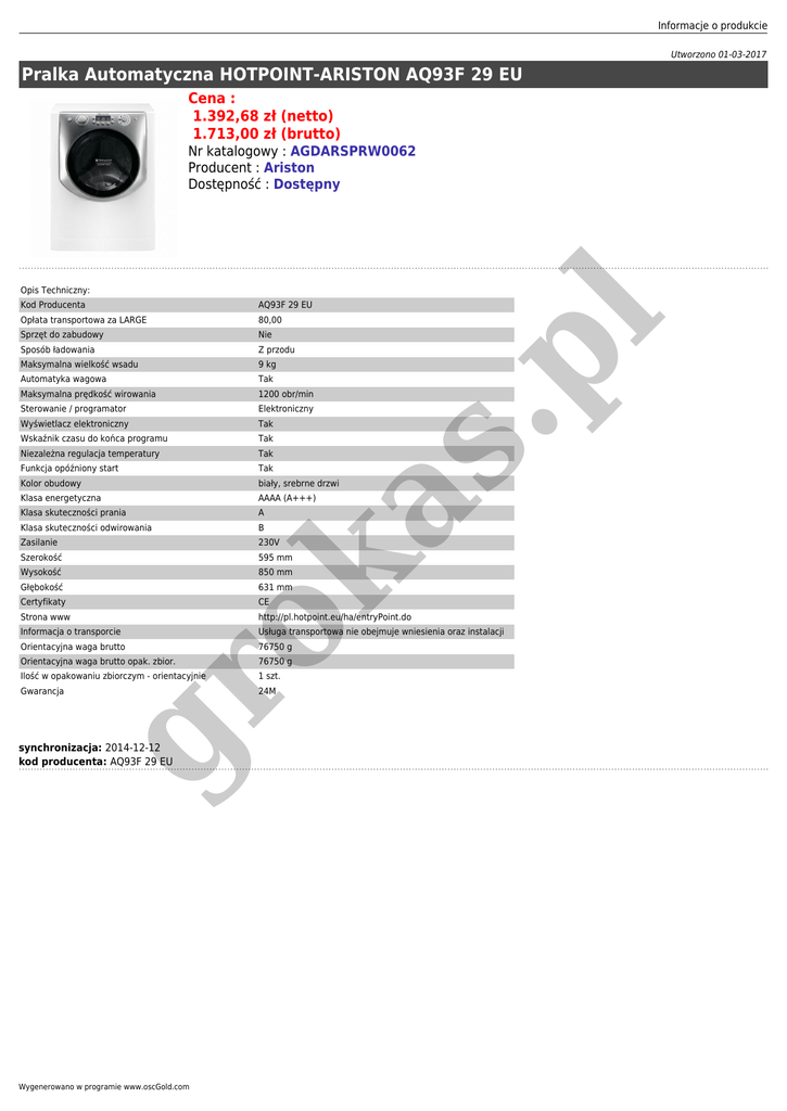 Informacje o produkcie Utworzono 01-03-2017 Pralka Automatyczna HOTPOINT-ARISTON AQ93F 29 EU Cena : 1.392,68 zł (netto) 1.713,00 zł (brutto) Nr katalogowy : AGDARSPRW0062 Producent : Ariston Dostępność : Dostępny AQ93F 29 EU Opłata transportowa za LARGE 80,00 Sprzęt do zabudowy Nie Sposób ładowania Z przodu Maksymalna wielkość wsadu 9 kg Automatyka wagowa Tak Maksymalna prędkość wirowania 1200 obr/min Sterowanie / programator Elektroniczny Wyświetlacz elektroniczny Tak Wskaźnik czasu do końca programu Tak Niezależna regulacja temperatury Tak Funkcja opóźniony start Tak Kolor obudowy biały, srebrne drzwi Klasa energetyczna AAAA (A+++) Klasa skuteczności prania A Klasa skuteczności odwirowania B Zasilanie 230V Szerokość 595 mm Głębokość Certyfikaty Strona www Informacja o transporcie Orientacyjna waga brutto ok Wysokość as Kod Producenta 850 mm 631 mm CE http://pl.hotpoint.eu/ha/entryPoint.do Usługa transportowa nie obejmuje wniesienia oraz instalacji 76750 g 76750 g Ilość w opakowaniu zbiorczym - orientacyjnie 1 szt. gr Orientacyjna waga brutto opak. zbior. Gwarancja synchronizacja: 2014-12-12 kod producenta: AQ93F 29 EU Wygenerowano w programie www.oscGold.com .p l Opis Techniczny: 24M