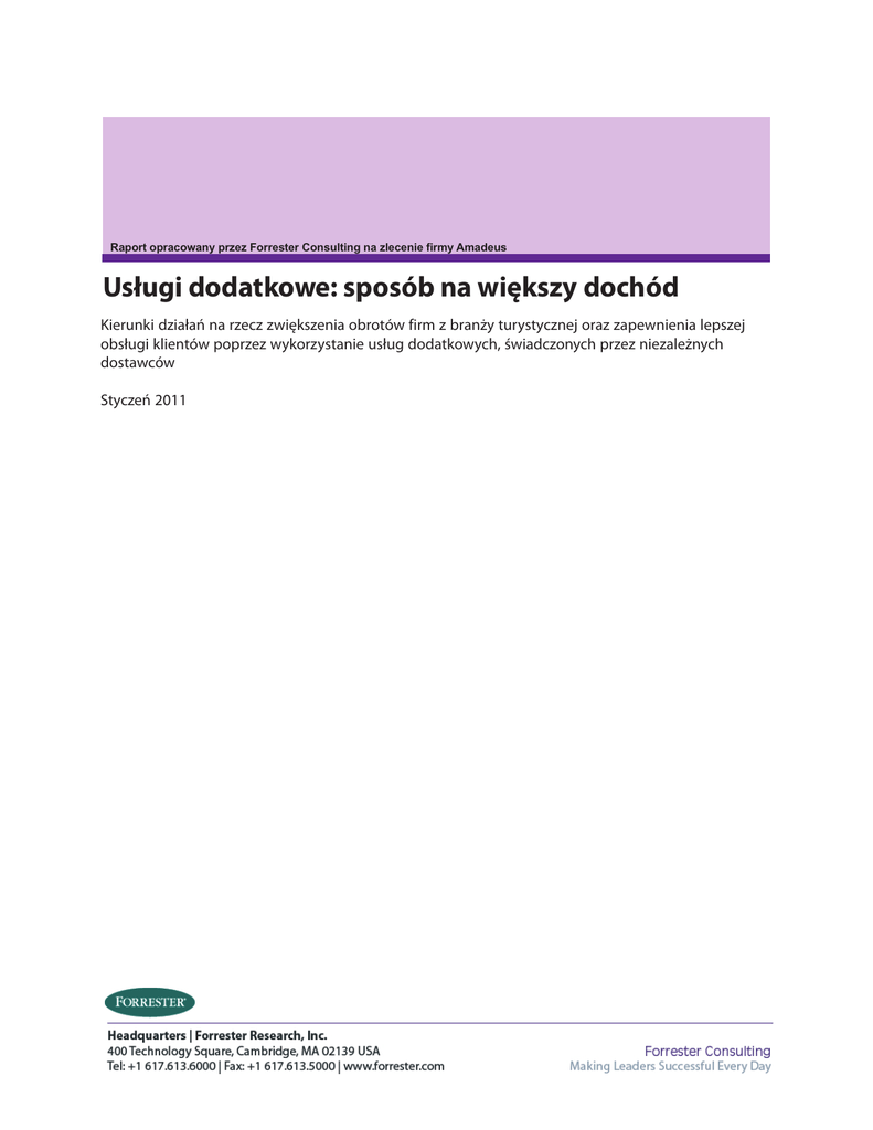 Raport opracowany przez Forrester Consulting na zlecenie firmy Amadeus Usługi dodatkowe: sposób na większy dochód Kierunki działań na rzecz zwiększenia obrotów firm z branży turystycznej oraz zapewnienia lepszej obsługi klientów poprzez wykorzystanie usług dodatkowych, świadczonych przez niezależnych dostawców Styczeń 2011 Forrester Consulting Usługi dodatkowe: sposób na większy dochód Spis treści Usługi dodatkowe świadczone przez niezależnych dostawców: kontekst 2 Podstawa przyszłego sukcesu handlowego branży turystycznej: przegląd 3 Możliwości: większa sprzedaż, wzmocnienie świadomości marki, zadowolenie klientów 5 Kolejne pięć lat: zostać prawdziwym sprzedawcą 11 Myślenie przyszłościowe: następna dekada pod znakiem technologii mobilnych i usług niestandardowych 16 Kluczowa rola właściwego czasu i miejsca dla sprzedaży usług niezależnych 19 Wnioski 24 Zalecenia 25 Dodatek A: Metodologia 27 Dodatek B: Uwagi końcowe 27 © 2011, Forrester Research, Inc. Wszelkie prawa zastrzeżone. Kopiowanie bez zgody autora zabronione. Informacje oparto na najlepszych dostępnych źródłach. Opinie zawarte w raporcie odzwierciedlają ocenę sytuacji w momencie publikacji i mogą ulec zmianie. Forrester®, Technographics®, Forrester Wave, RoleView, TechRadar i Total Economic Impact są znakami towarowymi firmy Forrester Research, Inc. Wszelkie inne znaki towarowe należą odpowiednio do ich właścicieli. Więcej informacji można znaleźć pod adresem www.forrester.com. [1-HCT1DC] Informacje o Forrester Consulting Forrester Consulting świadczy niezależne, obiektywne, oparte na badaniach usługi konsultingowe, pomagając kadrze kierowniczej przedsiębiorstw uzyskiwać lepsze wyniki. Usługi Forrester Consulting, od krótkich sesji strategicznych po projekty indywidualne, oferują klientom bezpośredni dostęp do wiedzy doświadczonych ekspertów, którzy analizują konkretne problemy biznesowe. Więcej informacji można znaleźć pod adresem www.forrester.com/consulting. Strona 1 Forrester Consulting Usługi dodatkowe: sposób na większy dochód Usługi dodatkowe świadczone przez niezależnych dostawców: kontekst Dwa słowa wywołują błysk w oku handlowców, zastanawiających się nad tym, jak przyciągnąć klientów. Dwa słowa przyspieszają puls dyrektorów finansowych firm turystycznych, którzy już wyobrażają sobie wyższe przychody i marże. Dwa słowa sprawiają, że analitycy uśmiechają się szerzej, myśląc o zasileniu baz danych dodatkowymi informacjami o klientach. Dwa słowa wywołują u szefów informatyki dreszcze na myśl o implikacjach swoich systemów i infrastruktury technicznej. Jakie to słowa? Usługi dodatkowe. Choć według prognoz dotyczących światowej gospodarki i branży turystycznej zapowiadających, że wychodzenie z kryzysu może rozpocząć się już w tym roku, najbliższa przyszłość jest wciąż trudna do przewidzenia. Chcąc zrównoważyć niestabilny popyt, zwiększyć obroty oraz marże w czasach, gdy trudno jest podnosić ceny, wielu dostawców usług turystycznych, takich jak linie lotnicze, hotele, tour-operatorzy czy linie kolejowe, coraz chętniej interesuje się grupą produktów opcjonalnych, niezwiązanych z ich podstawową działalnością. Ten segment to usługi dodatkowe. Usługi dodatkowe są dziś jednym z kluczowych zagadnień branży turystycznej, dążącej do trwałej poprawy swojej kondycji finansowej. Stanowią one także istotne czynniki pomagające dostawcom usług turystycznych lepiej zaspokajać potrzeby klientów, zainteresowanych nowymi usługami i udogodnieniami. W ciągu minionych dwóch lat o usługach dodatkowych napisano wiele, jednak informacje te dotyczyły w większości niezależnych świadczeń, oferowanych przez linie lotnicze (tzw. a la carte), realizowanych bezpośrednio przez operatora turystycznego. Przykładami usług dodatkowych a la carte jest np. odprawa bagażu czy hotelowa restauracja. Niniejszy raport koncentruje się na niewykorzystanym potencjale usług dodatkowych realizowanych przez firmy całkowicie niezależne lub działające w ramach umowy z dostawcami usług turystycznych, takich jak linie lotnicze, hotele, tour-operatorzy, wypożyczalnie samochodów oraz koleje dalekobieżne i operatorzy promowi. Definicja usług dodatkowych realizowanych przez firmy niezależne brzmi następująco: Usługi dodatkowe realizowane przez firmy niezależne to takie, w których zarobek dostawcy usług turystycznych pochodzi z prowizji płaconej przez niezależną firmę, realizującą usługę. Przykładami powyższych świadczeń mogą być ubezpieczenia podróżne, noclegi w hotelu udostępnione poprzez witrynę linii lotniczej czy wycieczki realizowane przez miejscowego operatora na rzecz operatora rejsu wycieczkowego. Wielu dostawców usług turystycznych opiera swą działalność na usługach dodatkowych realizowanych przez firmy niezależne. Uzyskane tą drogą dodatkowe dochody są znaczne – wysokość prowizji może wynosić od 5% do 10% w przypadku rezerwacji promowych, 10%-15% w przypadku wypożyczalni samochodów czy rezerwacji hotelowych, 10%-16% w przypadku rezerwacji rejsów wycieczkowych i 30%-50% dla ubezpieczeń podróżnych.1 Strona 2 Forrester Consulting Usługi dodatkowe: sposób na większy dochód Podstawa przyszłego sukcesu handlowego branży turystycznej: przegląd Niniejszy dokument analizuje potencjał realizowanych przez firmy niezależne usług dodatkowych z punktu widzenia wzrostu obrotów i rentowności w branży w krótkim i średnim Dostawcy usług turystycznych spodziewają się okresie, a także wskazuje portfolio niestandardowych usług, które w ciągu najbliższych pięciu lat wzrostu przychodów mogą kształtować przyszłość podróżowania w ciągu najbliższej na poziomie 30% z usług dodatkowych, realizowanych przez firmy niezależne. Ta estymacja dekady. Przez usługi „niestandardowe” rozumiemy usługi oznacza, ż