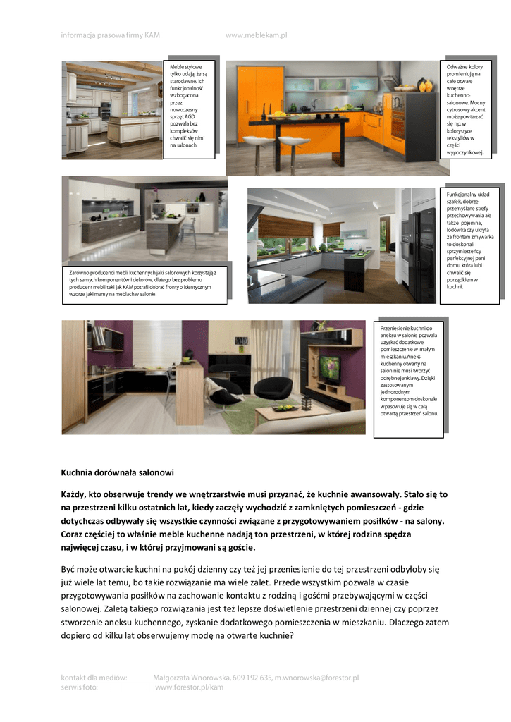 Kuchnia dorównała salonowi Każdy, kto obserwuje trendy we wnętrzarstwie musi przyznać, że kuchnie awansowały. Stało się to na przestrzeni kilku ostatnich lat, kiedy zaczęły wychodzić z zamkniętych pomieszczeń - gdzie dotychczas odbywały się wszystkie czynności związane z przygotowywaniem posiłków - na salony. Coraz częściej to właśnie meble kuchenne nadają ton przestrzeni, w której rodzina spędza najwięcej czasu, i w której przyjmowani są goście. Być może otwarcie kuchni na pokój dzienny czy też jej przeniesienie do tej przestrzeni odbyłoby się już wiele lat temu, bo takie rozwiązanie ma wiele zalet. Przede wszystkim pozwala w czasie przygotowywania posiłków na zachowanie kontaktu z rodziną i gośćmi przebywającymi w części salonowej. Zaletą takiego rozwiązania jest też lepsze doświetlenie przestrzeni dziennej czy poprzez stworzenie aneksu kuchennego, zyskanie dodatkowego pomieszczenia w mieszkaniu. Dlaczego zatem dopiero od kilku lat obserwujemy modę na otwarte kuchnie? - Bo ich świetny design, o który za czasów naszych babć nikt się nie martwił, sprawia, że nie musimy już ich ukrywać za szczelnymi drzwiami kuchennymi - podpowiada Alicja Gajewska ze spółki meblowej KAM. Ale jest też drugi powód . Urządzenia kuchenne, takie jak płyta grzewcza, piekarnik, zmywarka czy okap, stały się nie tylko ładne, ale także znacznie podwyższyły nasz komfort życia. Weźmy za przykład okap. Przez długi czas uznawane za zbędne - dziś współczesne okapy są nieodłącznym elementem projektowanych mebli kuchennych. Potrafią szybko wymienić powietrze w pomieszczeniu podczas gotowania, dzięki czemu zapachy nie rozchodzą się po całym mieszkaniu. Płyty do gotowania są łatwe do utrzymania w czystości. Piekarnik czy kuchenka mikrofalowa pięknie komponują się z zabudową, a o istnieniu zmywarki trudno domyślić się, gdy chowa się za frontem szafki pilnie strzegąc tajemnicy o tym, że na uruchomienie zmywania czeka cała plejada kubków i talerzy. Kiedyś wypełniłyby one cały zlewozmywak wywołując zakłopotanie pani domu, która ze wstydem zamykała przed gośćmi nieuprzątniętą kuchnię. Obecnie dzięki nowym technologiom i nowoczesnemu wzornictwu przemysłowemu okazało się, że urządzenia AGD nie tylko ułatwiają użytkownikom pracę, ale także świetnie wpasowują się w przestrzeń salonów. To samo można powiedzieć o współczesnych meblach kuchennych. Aby kuchenny kopciuszek mógł jednak wyjść na salony musiał najpierw przyodziać odpowiednią suknię. Meblami kuchennymi zajęli się więc projektanci wnętrz i najlepsi designerzy. Meble kuchenne musiały estetycznie dorównać sprzętom, które dotychczas kojarzyły się z salonem. W sukurs tym potrzebom przyszli producenci frontów czy blatów meblowych a nawet uchwytów. - Dziś mamy do dyspozycji te same dekory frontów kuchennych i blatów, z których producenci mebli salonowych robią komody czy szafki RTV - mówi Andrzej Wołosz ze Spółki Meblowej KAM. - Dzięki temu możemy wyposażyć otwarte przestrzenie w meble o podobnym stylu. - W naszej ofercie znajdzie coś dla siebie zarówno osoba ceniąca we wnętrzu nowoczesny minimalizm czy wręcz ultranowoczesność, jak i entuzjaści stylu rustykalnego – dodaje Alicja Gajewska, spec. ds. sprzedaży i marketingu spółki meblowej KAM. - Meble kuchenne bez problemu można dopasować do całej otwartej przestrzeni. Przyglądając się bliżej ofercie producenta mebli kuchennych z Milejewa, zobaczymy fronty meblowe imitujące różne gatunki drewna w najróżniejszych odcieniach beżu, brązu, kremu, ze wzorem ułożonym pionowo bądź poziomo. Są także błyszczące kolorowe fronty z płyty MDF akrylowanej w kolorach od bieli do czerni poprzez kilka odważnych, soczystych barw. To zupełnie inne meble niż te, które pamiętamy sprzed kilkunastu lat, chowające się za szczelnymi drzwiami kuchennymi. Dziś ich design, kolorystyka i jakość wykonania są iście salonowe. Takie meble chce się pokazywać. Na takie chce się patrzeć z perspektywy wygodnej salonowej kanapy. - Decydując się na wybór z bogatej kolorystyki frontów kuchennych warto pomyśleć o kolorach, które chcielibyśmy znaleźć także w pokoju dziennym - radzi Alicja Gajewska. - Modne soczyste akcenty mogę powtarzać się na wybranych frontach szafek oraz na dodatkach we wnętrzu, takich jak naczynia, poduszki, zasłony, dywany. Jeśli w mieszkaniu kuchnia ma być otwarta na salon warto także dopasować odpowiednio uchwyty meblowe. Te same gałki czy relingi można dziś stosować zarówno do frontów szafek kuchennych jak i salonowych komód. Ale można też zauważyć, że to kuchnia zaczyna nadawać ton rozwiązaniom salonowym. Przykładem jest przechodzący z branży kuchennej do produkcji mebli pokojowych trend produkcji frontów bezuchwytowych, otwieranych przez dotyk. Znakiem naszych czasów jest przenikanie się różnych dziedzin życia, mieszanie kultur i zwyczajów. Ale nawet w takich dziedzinach jak meble kuchenne wciąż możemy czuć się zaskakiwani przez producentów, którzy będąc otwarci na nowatorskie rozwiązania i potrzeby nowej generacji, są w stanie kreować pozytywne zmiany w naszym otoczeniu.