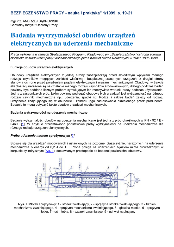 BEZPIECZEŃSTWO PRACY - nauka i praktyka" 1/1999, s. 19-21 mgr inż. ANDRZEJ DĄBROWSKI Centralny Instytut Ochrony Pracy Badania wytrzymałości obudów urządzeń elektrycznych na uderzenia mechaniczne Praca wykonana w ramach Strategicznego Programu Rządowego pn. „Bezpieczeństwo i ochrona zdrowia człowieka w środowisku pracy” dofinansowanego przez Komitet Badań Naukowych w latach 1995-1998 Funkcje obudów urządzeń elektrycznych Obudowy urządzeń elektrycznych z jednej strony zabezpieczają przed szkodliwym wpływem różnego rodzaju czynników mogących zakłócić właściwą i bezpieczną pracę tych urządzeń, z drugiej strony stanowią ochronę przed porażeniem prądem elektrycznym i urazami mechanicznymi. Obudowy, w trakcie eksploatacji narażone są na działanie różnego rodzaju czynników środowiskowych, dlatego podczas badań powinny być poddane licznym próbom symulującym ich rzeczywiste warunki pracy podczas użytkowania. Jedną z zasadniczych prób, jakim powinny podlegać obudowy tych urządzeń jest wytrzymałość na różnego rodzaju czynniki mechaniczne np.: uderzenia, spadki itd. Rodzaj i zakres badań zależy od rodzaju urządzenia znajdującego się w obudowie i zakresu jego zastosowania określonego przez producenta. Badania te mogą dotyczyć także obudów urządzeń mechanicznych. Badania wytrzymałości na uderzenia mechaniczne Badanie wytrzymałości obudów na uderzenia mechaniczne jest jedną z prób określonych w PN - 92 / E 04600 [1], W artykule przedstawiono podstawowe próby wytrzymałości na uderzenia mechaniczne dla różnego rodzaju urządzeń elektrycznych. Próba uderzenia młotem sprężynowym [3] Stosuje się dla urządzeń mocowanych i ustawionych na poziomej płaszczyźnie, narażonych na uderzenia mechaniczne o energii od 0,2 J do 1 J. Próba polega na uderzeniach bijakiem młota prowadzonym w korpusie cylindrycznym (rys. 1), dostawianym prostopadle do badanej powierzchni obudowy. Rys. l. Młotek sprężynowy: 1 - stożek zwalniający, 2 - sprężyna stożka zwalniającego, 3 - trzpień mechanizmu zwalniającego, 4 - sprężyna mechanizmu zwalniającego, 5 - głowica młotka, 6 - sprężyna młotka, 7 - oś młotka, 8 - szczeki zwalniające, 9 - uchwyt napinający Badanie wytrzymałości na uderzenia mechaniczne młotem wahadłowym [2]. Badanie to stosuje się dla urządzeń do zamocowania na pionowej płaszczyźnie, narażonych na uderzenia mechaniczne o energii od 0,15 J do 20 J. Próba polega na wykonaniu uderzeń bijakiem zamocowanym na ramieniu wahadła o długości 1 m (rysunek 2). Rys. 2. Młot wahadłowy do badań wytrzymałości urządzeń na uderzenia mechaniczne Badanie wytrzymałości na uderzenia mechaniczne bijakiem probierczym [4] Próbę przeprowadza się dla urządzeń o kształtach umożliwiających dowolne położenie podczas ich instalowania (mocowania), np. rur instalacyjnych narażonych na uderzenia mechaniczne o energii od 0,2 J do 20 J. Próba polega na uderzeniu z góry w obudowę urządzenia, przedstawionym na rysunku 3, bijakiem z prowadzeniem pionowym. Rys. 3. Bijak probierczy do badań wytrzymałości urządzeń na uderzenia mechaniczne: l - podstawa stalowa o masie 10+1 kg, 2 - bijak, 3 - cześć stalowa pośrednicząca o masie l00g, 4 - próbka (w mm) Próby upuszczenia i przewrócenia [7] Urządzenia zostają upuszczane i przewracane na twarde podłoże z betonu lub stali. Próba ta odwzorowuje uderzenia i wstrząsy, jakie mogą wystąpić w czasie czynności naprawczych oraz niedbałego manipulowania urządzeniem na stole lub warsztacie. Próba zawiera trzy testy. • • • Upuszczanie na podstawę (rys. 4). Próba polega na podniesieniu na określoną wysokość kolejno każdej z czterech krawędzi podstawy urządzenia w stosunku do podłoża i upuszczeniu go. Upuszczanie na naroża (rys. 5). Próba polega na podniesieniu obudowy urządzenia na określoną wysokość w stosunku do podłoża i upuszczeniu kolejno na każde cztery naroża. Przewracanie (rys. 6). Próba polega na przewracaniu po podłożu urządzenia wokół każdej z czterech krawędzi podstawy na przylegającą ściankę, zaczynając od wychylenia w położeniu niestabilnym. Rys. 4. Schemat próby upuszczenia na podstawę Rys. 5. Schemat próby upuszczenia na naroża Rys. 6. Schemat próby przewrócenia Próba Ed - spadki swobodne [8] Badanie to jest wykonywane dla urządzeń, które mogą ulec spadkom w czasie ich przewożenia, użytkowania lub czynności naprawczych. Nie należy wykonywać badania dla wyrobów bardzo ciężkich. Próba ta służy do odwzorowywania dwóch rodzajów spadków przewidywanych dla urządzeń. • • Spadki pojedyncze. Próba polega na dwukrotnym swobodnym spadku urządzenia z każdej zalecanej wysokości (wysokość spadku, stosownie do zaleceń norm, dobiera się z wartości 25, 50, 250, 500 i 1000 mm). Spadki wielokrotne. Typowym urządzeniem do prób spadków wielokrotnych jest bęben probierczy przedstawiony na rysunku 7 (liczbę spadków, stosownie do zaleceń norm, dobiera się z szeregu liczb: 50, 100, 200, 500 i 1000). Rys. 7. Bęben probierczy do próby wielokrotnych spadków swobodnych (mm) Próby dotyczące badania skutków wielokrotnych uderzeń podczas transportu Próby dotyczące badania skutków wielokrotnych uderzeń, jakim podlegają wyroby głównie podczas transportu, przeprowadzane są na wyrobach zamocowanych na wstrząsarce. • • Próba Ea udary pojedyncze [5]. Podczas tych badań odwzorowuje się skutki nie powtarzających się uderzeń, jakim podlegają urządzenia lub podzespoły w czasie przewożenia albo eksploatacji. Próba Eb udary wielokrotne [6]. Podczas tych badań odwzorowuje się skutki powtarzających się uderzeń, jakim podlegają urządzenia w czasie przewożenia lub po zainstalowaniu w pojazdach. Przykłady zastosowania metod badania wytrzymałości urządzeń elektrycznych na uderzenia mechaniczne Powszechnie stosowanymi metodami badania wytrzymałośc