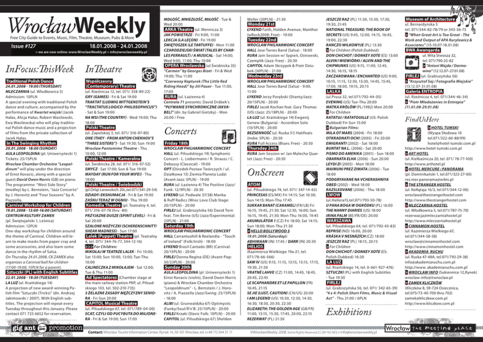 WrocławWeekly Free City Guide to Events, Music, Film, Theatre, Museum, Pubs & More Issue #127 18.01.2008 - 24.01.2008 > we are now online: www.WroclawWeekly.pl > [email protected] InFocus:ThisWeek Traditional Polish Dance 24.01.2008 - 19:00 (Thursday) MLECZARNIA (ul. Włodkowica 5) Admission: 10PLN A special evening with traditional Polish dance and culture, accompanied by the performance of Kwartet wiejski (Jacek Hałas, Alicja Hałas, Robert Wasilewski, Ewa Wasilewska) who will play traditional Polish dance music and a projection of films from the private collection of Jacek Hałas. In The Swinging Rhythm 20.01.2008 - 18:00 (Sunday) AULA LEOPOLDINA (pl. Uniwersytecki 1) Tickets: 25/15PLN Wrocław Chamber Orchestra “Leopoldinum” will play under the direction of Ernst Kovacic, along with a special guest David Owen Norris (GB) on piano. The programme: “West Side Story” (medley) by L. Bernstein, “Jazz Concerto” by J. Horovitz and “Four Seasons” by A. Piazzolla. Carnival Workshop for Children 19.01.2008 - 13:00-16:00 (Saturday) Centrum Kultury ZAMEK (pl. Świętojański 1, Leśnica) Admission: 12PLN One-day workshop for children around the theme of Carnival. Children will learn to make masks from paper-cray and some accessories, and also learn some dance in the rhythm of Salsa. On Thursday 24.01.2008, CK ZAMEK also organizes a Carnival ball for children (17:00-19:00; 15PLN for a parent). Sztuczki (PL) with English Subtitles 22.01.2008 - 19:30 (Tuesday) LA LUZ (ul. Kraińskiego 14) A projection of new award-winning Polish film “Sztuczki (Tricks)” (dir. Andrzej Jakimowski / 2007). With English subtitles. The projection will repeat every Tuesday throughout this January. Please contact 071 725 6652 for reservation. InTheatre Współczesny (Contemporary) Theatre (ul. Rzeźnicza 12, tel. 071/ 358-89-22) Gry (Games) - Fri & Sat 19:00 Traktat (Ludwig Wittgenstein’s “Tractatus logico-philosophicus”) - Sat & Sun 19:00 Na wsi (The Country) - Wed 19:00; Thu 18:00 Polski Theatre (ul. Zapolskiej 3, tel. 071/ 316-07-80) One (They - from Anton Chekhov’s “Three Sisters”) - Sat 19:30; Sun 19:00 Wrocław Pantomime Theatre - Thu 10:00, 12:00 Polski Theatre / Kameralna (ul. Świdnicka 28, tel. 071/ 316-07-52) Smycz - Sat 17:00; Sun & Tue 19:00 Mayday (Run for Your Wife!) - Thu 19:00 Polski Theatre / Świebodzki (pl.Orląt Lwowskich 20c,tel.071/341-29-54) Dziady: Ekshumacja - Fri & Sat 19:00 Zaśnij teraz w ogniu - Thu 19:00 Komedia Theatre (pl. Teatralny 4, tel. 071/ 316-07-78 thru -80) Przyjazne Dusze (Spirit Level) - Fri & Sat 20:00 Szalone Nożyczki (Scherenschnitt/ Shear Madness) - Sun 17:00 Lalek (Puppet) Theatre (pl. Teatralny 4, tel. 071/ 344-76-77, 344-12-16) >>> For Children: Mikołaj w Teatrze Lalek - Fri 10:00; Sat 15:00; Sun 10:00, 13:00; Tue-Thu 10:00 Calineczka z Mikołajem - Sat 12:00; Tue & Thu 11:00 Ad Spectatores (Chamber stage at the main railway station PKP, ul. Piłsudskiego 103, tel. 502-210-735) 3 żelazne zasady mężczyzny seniora - Fri-Sun 20:00 CAPITOL Musical Theatre (ul. Piłsudskiego 67, tel. 071/789-04-00) Scat, czyli od pucybuta do milionera - Fri & Sat 19:00; Sun 17:00 Mdłość, Mniezłość, Miłość - Tue & Wed 20:00 ARKA Theatre (ul. Mennicza 3) Jak powietrze - Fri 9:00, 11:00 Lekcja (La leçon) - Fri 19:00 Świętoszek (Le Tartuffe) - Mon 11:00 Czarodziejski świat (Tales by Charles Perrault) / A Musical - Sat 14:00; Wed 9:00, 11:00; Thu 10:00 OPERA Wrocławska (ul.Świdnicka 35) “Carmen” by Georges Bizet - Fri & Wed 19:00; Thu 11:00 “Czerwony Kapturek (The Little Red Riding Hood)” by Jiří Pauer - Tue 11:00, 17:00 RURA (ul. Łazienna 4) Centrala 71 presents: David Drábek’s “Pływanie synchroniczne (Akvabel)” (dir. by Gabriel Gietzky) - Mon 20:00 / Free Concerts Friday 18th WROCŁAW PHILHARMONIC CONCERT HALL (ul. Piłsudskiego 19) Symphonic Concert - L. Liebermann / R. Strauss / C. Debussy (Classical) - 19:00 OPT (Ośrodek Postaw Twórczych / ul. Działkowa 15) Ziemia Planeta Ludzi (Avant-Jazz: 5PLN) - 19:00 RURA (ul. Łazienna 4) The Positive (Jazz/ Funk: 12/9PLN) - 20:30 ŁYKEND (ul. Podwale 37/38) Marika & Ruff Radics (Wroc Love Club Stage: 20/15PLN) - 20:00 FIRLEJ (ul. Grabiszyńska 56) David Torn feat. Tim Berne (US) (Jazz/Experimental: 25PLN) - 21:00 Saturday 19th WROCŁAW PHILHARMONIC CONCERT HALL Carrantuohill & Reelandia - “Touch of Ireland” (Folk/Irish) - 18:00 ŁYKEND Brasil Cantado (BR) (Carnival: 20/15PLN) - 20:00 FIRLEJ Donna Regina (DE) (Avant-Pop: 30/23PLN) - 20:00 Sunday 20th AULA LEOPOLDINA (pl. Uniwersytecki 1) Ernst Kovacic (violin), David Owen Norris (piano) & Wrocław Chamber Orchestra “Leopoldinum” - L. Bernstein / J. Horovitz / A. Piazzolla (Jazz/Swing: 25/15PLN) - 18:00 ALIBI (ul. Grunwaldzka 67) Optimystic (Funky/Soul/R’n’B: 25/15PLN) - 20:00 FIRLEJ Krzaki (Slavic Folk: 10PLN) - 20:00 CAPITOL (ul. Piłsudskiego 67) Sheldon Contact: Wrocław Tourist Information Center, Rynek 14, 50-101 Wrocław, tel. (+48 71) 344 31 11 Weller (20PLN) - 21:30 Monday 21st ŁYKEND Faith, Holden Avenue, Manthor (wRock2008: Free) - 19:00 Tuesday 22nd WROCŁAW PHILHARMONIC CONCERT HALL Jose Torres Band (Salsa) - 18:00 RURA Jam Session w/ Sypień, Ostrowski, Czemplik (Jazz: Free) - 20:30 CAPITOL Adam Skrzypek & Piotr Dziubek (30PLN) - 21:00 Wednesday 23rd WROCŁAW PHILHARMONIC CONCERT HALL Jose Torres Band (Salsa) - 9:00, 11:00 ŁYKEND Jerzy Porębski (Shanty/Jazz: 20/15PLN) - 20:00 FIRLEJ Jacek Kochan feat. Gary Thomas (US) (Jazz: 25/18PLN) - 20:00 LA LUZ (ul. Kraińskiego 14) Ewgenij Genew (Bulgaria) - Accordion Solo (10/5PLN) - 20:00 BEZSENNOŚĆ (ul. Ruska 51) Hatifnats (Indie: 5PLN) - 20:30 RURA Full Access (Blues: Free) - 20:30 Thursday 24th RURA Jam Session w/ Jan Malecha Quartet (Jazz: Free) - 20:30 OnScreen ATOM (ul. Piłsudskiego 74, tel. 071/ 347-14-65) Princesas (ES/MX) Fri 14:15; Sat 10:30; Sun 14:15; Mon-Thu 17:45 Sukkar banat (Caramel) (FR/LB) Fri 16:15, 19:45, 21:30; Sat 12:30, 16:00; Sun 16:15, 