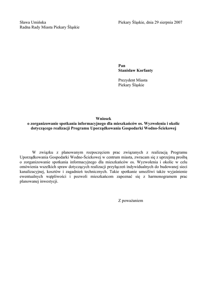 Sława Umińska Radna Rady Miasta Piekary Śląskie Piekary Śląskie, dnia 29 sierpnia 2007 Pan Stanisław Korfanty Prezydent Miasta Piekary Śląskie Wniosek o zorganizowanie spotkania informacyjnego dla mieszkańców os. Wyzwolenia i okolic dotyczącego realizacji Programu Uporządkowania Gospodarki Wodno-Ściekowej W związku z planowanym rozpoczęciem prac związanych z realizacją Programu Uporządkowania Gospodarki Wodno-Ściekowej w centrum miasta, zwracam się z uprzejmą prośbą o zorganizowanie spotkania informacyjnego dla mieszkańców os. Wyzwolenia i okolic w celu omówienia wszelkich spraw dotyczących realizacji przyłączeń indywidualnych do budowanej sieci kanalizacyjnej, kosztów i zagadnień technicznych. Takie spotkanie umożliwi także wyjaśnienie ewentualnych wątpliwości i pozwoli mieszkańcom zapoznać się z harmonogramem prac planowanej inwestycji. Z poważaniem Sława Umińska Radna Rady Miasta Piekary Śląskie Piekary Śląskie, dnia 29 sierpnia 2007 Pan Stanisław Korfanty Prezydent Miasta Piekary Śląskie Wniosek o cząstkowy remont chodników w dolnych odcinkach ulic Londnera i Wojska Polskiego Chodniki przy ulicach Londnera i Wojska Polskiego są w złym stanie szczególnie w części dolnej w okolicach skrzyżowania z ulicą Bytomską. Płyty chodnikowe są popękane i nierówne, na co uskarżają się zwłaszcza osoby starsze, mające problemy z poruszaniem się. Mając na uwadze szczupłość środków finansowych i ujęte już w programie remontów na 2007 r. inne odcinki dróg i chodników, uprzejmie proszę o wykonanie przynajmniej naprawy najbardziej zniszczonych fragmentów ww. chodników. Z poważaniem Sława Umińska Radna Rady Miasta Piekary Śląskie Piekary Śląskie, dnia 29 sierpnia 2007 Pan Stanisław Korfanty Prezydent Miasta Piekary Śląskie Wniosek o uporządkowanie terenu w rejonie ulic Jasionowskiego i Wyzwolenia Na terenie rozciągającym się od ulicy Wyzwolenia do ulicy Jasionowskiego prowadzone były prace związane z usuwaniem krzewów, zarośli i koszeniem trawy. Roślinność została wycięta ale nie usunięta z ww. terenu. Uprzejmie proszę o doprowadzenie tego obszaru do porządku i objęcie go kontrolą ze względu na jego nieustanne i uporczywe zaśmiecanie. Z poważaniem Sława Umińska Radna Rady Miasta Piekary Śląskie Piekary Śląskie, dnia 29 sierpnia 2007 Pan Stanisław Korfanty Prezydent Miasta Piekary Śląskie Wniosek o zagospodarowanie terenu znajdującego się przy ul. Spółdzielczej W rozwidleniu ulicy Spółdzielczej na os. Wyzwolenia znajduje się niewielki obszar obecnie opuszczony, a kiedyś zagospodarowany i przeznaczony do celów rekreacyjnych. Wiele lat temu mieszkańcy osiedla pracowali społecznie m.in. przy budowie boiska. Obecnie jest tam tylko jedna huśtawka, której stan techniczny budzi spore wątpliwości. Na terenie os. Wyzwolenia nie ma parku ani placu zabaw; w tej sytuacji można jedynie wyrazić żal, że taki teren się marnuje. Zdaję sobie sprawę z ograniczeń tegorocznego budżetu. Niemniej zwracam się z uprzejmą prośbą o udzielenie informacji czy istnieją plany i/lub pomysły na zagospodarowanie tego obszaru i doprowadzenie go do dawnego stanu. Z poważaniem Sława Umińska Radna Rady Miasta Piekary Śląskie Piekary Śląskie, dnia 30 sierpnia 2007 Pan Stanisław Korfanty Prezydent Miasta Piekary Śląskie Interpelacja w sprawie modernizacji strony internetowej www.piekary.pl Od kilku miesięcy trwają prace nad modernizacją internetowej strony o adresie www.piekary.pl. Uprzejmie proszę o udzielenie informacji jaki jest stan przygotowań i realizacji tego przedsięwzięcia oraz o podanie daty zakończenia prac. Z poważaniem