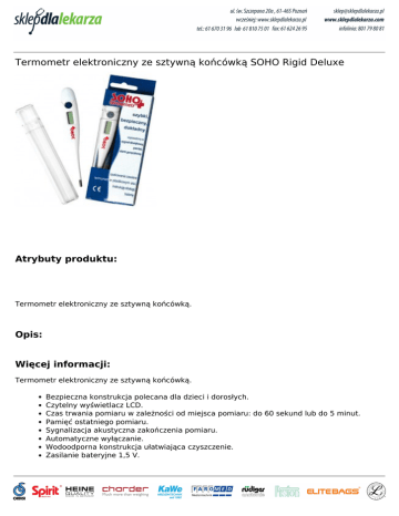 Termometr elektroniczny ze sztywną końcówką SOHO Rigid Deluxe Atrybuty produktu: Termometr elektroniczny ze sztywną końcówką. Opis: Więcej informacji: Termometr elektroniczny ze sztywną końcówką. Bezpieczna konstrukcja polecana dla dzieci i dorosłych. Czytelny wyświetlacz LCD. Czas trwania pomiaru w zależności od miejsca pomiaru: do 60 sekund lub do 5 minut. Pamięć ostatniego pomiaru. Sygnalizacja akustyczna zakończenia pomiaru. Automatyczne wyłączanie. Wodoodporna konstrukcja ułatwiająca czyszczenie. Zasilanie bateryjne 1,5 V. Powered by TCPDF (www.tcpdf.org)