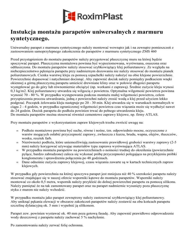 Instukcja montażu parapetów uniwersalnych z marmuru syntetycznego. Uniwersalny parapet z marmuru syntetycznego należy montować wewnątrz jak i na zewnątrz pomieszczeń z zastosowaniem samoprzylepnego zakończenia do parapetów z marmuru syntetycznego ZMS 460 Przed przystąpieniem do montażu parapetów należy przygotować płaszczyznę muru na której będzie spoczywać parapet. Płaszczyzna montażowa powinna być wypoziomowana, wyrównana, osuszona oraz odtłuszczona. Do montażu parapetów należy stosować szybkowiążący klej poliuretanowy. Ze względu na niebezpieczeństwo pęknięcia parapetu przy nadmiernym dozowaniu nie należy stosować do montażu pianek poliuretanowych. Cienka warstwę kleju za pomocą szpachelki należy nałożyć na obie klejone powierzchnie. Powierzchnie dopasować i natychmiast docisnąć. Aby zapewnić docisk należy pomiędzy podkuciem wnęki okiennej a górną płaszczyzną parapetu umieścić drewniane kliny oraz w połowie długości parapetu występlować go do góry lub równomiernie obciążyć (np. workami z zaprawą). Średnie zużycie kleju wynosi 0,3 kg/m2. Klej poliuretanowy utwardza się wilgocią z powietrza. Optymalna wilgotność powietrza powinna wynosić 70 - 80 %. W przypadku występowania podczas montażu małej wilgotności powietrza, celem przyspieszenia procesu utwardzania, jedną z powierzchni należy zrosić wodą a klej przed użyciem lekko podgrzać. Początek żelowania kleju następuje po 20 - 30 min. Klej utwardza się w warunkach normalnych w ciągu 2 - 4 godzin, w przypadku ograniczonej wilgotności powietrza czas wiązania może się wydłużyć nawet do 24 godzin. Docisk parapetu do podłoża powinien trwać do pełnego utwardzenia kleju. Do montażu parapetów można stosować również cementowe zaprawy klejowe, np. firmy ATLAS. Przy montażu parapetów z wykorzystaniem zapraw klejowych trzeba zwrócić uwagę na: • • • • Podłoże montażowe powinna być suche, równe i nośne, tzn. odpowiednio mocne, oczyszczone z warstw mogących osłabić przyczepność zaprawy, zwłaszcza z kurzu, brudu, wapna, olejów, tłuszczów, wosku, resztek farb. Nierówności podłoża, które uniemożliwiają zastosowanie prawidłowej grubości warstwy zaprawy (2-5 mm) należy korygować używając materiałów typu zaprawa wyrównująca ATLAS. W przypadku montażu parapetów na powierzchniach o nośności trudnej do określenia (powierzchnie pylące, bardzo zabrudzone) zaleca się wykonać próbę przyczepności polegająca na przyklejeniu próbki konglomeratu i sprawdzeniu połączenia po 48 godzinach. Dane odnośnie zużycia zaprawy klejowej, czasu wiązania zawarte są w kartach technicznych zapraw klejowych. W przypadku gdy powierzchnia na której spoczywa parapet jest mniejsza niż 40 % szerokości parapetu należy stosować znajdujące się w naszej ofercie wsporniki kątowe do montażu parapetów. Wsporniki należy montować co około 0,5 metra, wspornik należy przykleić do dolnej powierzchni parapetu za pomocą silikonu. Należy pamiętać że na tak zamontowany parapet oraz na parapet nadmiernie wysunięty poza płaszczyznę styku z murem nie należy wchodzić. W przypadku montażu jako parapet zewnętrzny należy zastosować szybkowiążący klej poliuretanowy. Aby uniknąć pękania elewacji w obszarze zakończeń parapetów należy zostawić na obu końcach parapetu szczelinę dylatacyjną ok. 5 mm i wypełnić ją silikonem. Parapet zew. powinien wystawać ok. 40 mm poza gotową fasadę. Aby zapewnić prawidłowe odprowadzenie wody deszczowej z parapetu należy zachować 5 % nachylenie. Po zamontowaniu należy zerwać folię ochronna.