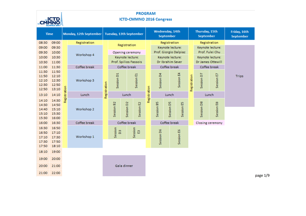 page 1/9 PROGRAM OF THE CONGRESS 12-16 SEPTEMBER 2016 Place of the Congress: Education and Congress Centre of the Silesian University of Technology Address: Konarskiego 18B Street 44-100 Gliwice Halls: B,C,D,E,F Place of the Gala Dinner: Palmiarnia Miejska (Municipal Palm House) Address: Fredry 6 Street, 44-100 Gliwice Monday, 12th September WORKSHOPS (Monday 12.09.) hall F 09:00 – 11:00 11:30 – 13:00 14:00 – 16:00 16:30 – 18:30 Workshop 4: Łukasz Kaczmarczyk, Szymon Kosiński: “Process of modern engines control” Workshop 3: Marek Fidali: “Evaluation of conditions of technical object using infrared thermography” Workshop 2: Gueorgui Mihaylov: “Multivariate analysis applied to safety and efficiency monitoring processes” Workshop 1: Ali Hajnayeb: “Static and dynamic rotor balancing” 2/9 PROGRAM OF THE CONGRESS 12-16 SEPTEMBER 2016 Tuesday, 13th September KEYNOTE LECTURE (13.09.) hall B 10:00 – 11:00 Prof. Spilios D. Fassois: “Advanced Parametric Methods for Non-Stationary Vibration Modeling and Structural Health Monitoring” SESSION D1 (Tuesday 13.09.) hall D Chairman: Prof. Michał Bartyś 11:30 – 11:50 11:50 – 12:10 12:10 – 12:30 12:30 – 12:50 12:50 – 13:10 Adam Gałęzia, Roman Barczewski, Bartosz Jakubek: “Possibilities of faults detection of rolling bearings using energetic descriptors of vibrations signals” Jacek Dybała, Jakub Komoda: “Empirical signal decomposition methods as a tool of early detection of bearing fault” Oscar Cardona-Morales, German Castellanos-Dominguez: “Machine diagnostic under variable speed operating conditions using order tracking and novelty detection” Mourad Kedadouche, Zhaoheng Liu, Marc Thomas: “Feature extraction and selection using autoregressive coefficient and linear discriminant analysis” Oscar Cardona-Morales, Edgar Sierra-Alonso, German Castellanos-Dominguez: "Bearing fault identification based on blind extraction of cyclostationary signals using order tracking" SESSION E1 (Tuesday 13.09.) hall E Chairman: Prof. Rafał Burdzik 11:30 – 11:50 11:50 – 12:10 12:10 – 12:30 12:30 – 12:50 12:50 – 13:10 Pavle Boškoski, Boštjan Dolenc, Bojan Musizza, Đani Juričić: "Entropy indices for estimation of the remaining useful life" Marcin Jasiński: “Use of bispectral measures in machines faults diagnostics – examples” Aleksandra Grzesiek, Grzegorz Żak, Agnieszka Wyłomańska, Radosław Zimroz: “A new techniques of local damage detection based on statistical properties of vibration signal” Leonardo Barbini, Mario Eltabach, Jonathan du Bois: “Application of cepstrum prewhitening on non-stationary signals” Amadou Assoumane, Julien Roussel, Edgard Sekko, Cécile Capdessus: "A new approach to tune Vold Kalman filter for order tracking" SESSION B2 (Tuesday 13.09.) hall B Chairman: Prof. Spilios D. Fassois 14:10 – 14:30 14:30 – 14:50 14:50 – 15:10 15:10 – 15:30 15:30 – 15:50 Andrzej Puchalski, Iwona Komorska: "Stable distributions and fractal diagnostic models of vibration signals of rotating systems" Michal Zeglen, Wojciech Staszewski, Adam Jabłoński, Tomasz Barszcz: "How to build a vibration monitoring system on your own" Cezary Worek, Łukasz Krzak, Tomasz Barszcz: “Comparison of wireless technologies for rotating machinery diagnostics” Roman Wyżgolik, Sebastian Budzan, Dariusz Buchczik, Marek Pawełczyk: “Rotating machinery diagnostics based on fusion of infrared and vibration measurements” Adam Jabłoński, Kajetan Dziedziech, Ziemowit Dworakowski, Piotr Kijanka: "Selection of suitable method for speed recovery from vibration signal" 3/9 PROGRAM OF THE CONGRESS 12-16 SEPTEMBER 2016 SESSION D2 (Tuesday 13.09.) hall D Chairman: Prof. Marc Thomas 14:10 – 14:30 14:30 – 14:50 14:50 – 15:10 15:10 – 15:30 15:30 – 15:50 Adam Gałęzia, Robert Gumiński, Marcin Jasiński, Stanisław Radkowski: "Using of entropy method in failure diagnostics" Michał Trojgo, Łukasz Zieliński, Krzysztof Szczurowski: “Proposal of reconfigurable drive system with CVT” Krzysztof Szczurowski, Stanisław Radkowski, Łukasz Zieliński, Damian Walczak: “Using vibroacoustic signals in evaluation of knocking combustion in a dual fuel engine” Łukasz Zieliński, Krzysztof Szczurowski, Stanisław Radkowski, Damian Walczak: “Assessment of control dual fuel diesel engine affecting the tendency to knock” Krzysztof Więcławski, Krzysztof Szczurowski, Łukasz Zieliński, Damian Walczak: “Analysis of operation gas injectors used in dual-fuel diesel engines” SESSION E2 (Tuesday 13.09.) hall E Chairman: Prof. Đani Juričić Rafał Burdzik, Jan Warczek, Łukasz Konieczny: “The concept of education in scope technical diagnostics of motor vehicles” Jairo A Grajales, Hector F Quintero, Carlos A Romero, Edison Henao: “Engine diagnosis 14:30 – 14:50 based on vibration analysis using different fuel blends” Iwona Komorska, Zbigniew Wołczyński: "Fault diagnostics in air intake system of the 14:50 – 15:10 internal combustion engine" Igor Maciejewski, Tomasz Krzyżyński: "Computational method for evaluating the vibro15:10 – 15:30 isolation properties of suspension systems used in working machines" 14:10 – 14:30 SESSION D3 (Tuesday 13.09.) hall D Chairman: Prof. Stanisław Radkowski 16:30 – 16:50 Piotr Jan Bielawski, Paweł Białek: "Fault Analysis of Hydrogen Piston Compressors" Przemysław Szulim, Szymon Gontarz, Stanisław Radkowski: “Model based analysis of the 16:50 – 17:10 vibrations of the BLDC motor with mechanical faults” 17:10 – 17:30 Andrzej Mielewczyk: "Control for the binary control valve" SESSION E3 (Tuesday 13.09.) hall E Chairman: Prof. Andrzej Puchalski Ji-Chul Kim, Joon-Yong Lee, Jung-Hyung Lee, Hwa-Suk Oh: "Disturbance Detection of Control Moment Gyros and Identification of Gimbal Fault" Dariusz Buchczik, Marek Pawełczyk: “Calibration of accelerometers using multisinusoidal 16:50 – 17:10 excitation” Tadeusz Glinka, Andrzej Sikora, Jaku