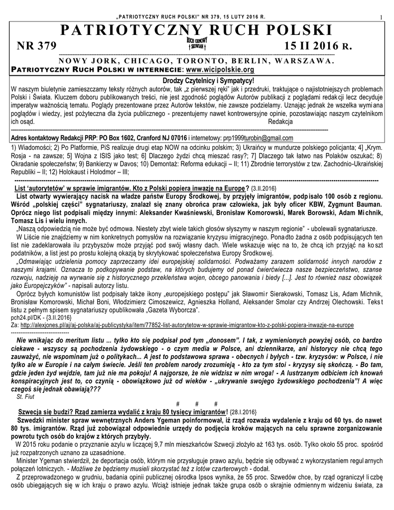 „PATRIOTYCZNY RUCH POLSKI” NR 379, 15 LUTY 2016 R. 1 P A T R I O T Y C ZN Y R U C H PO L S K I NR 379 15 II 2016 R . ----------------------------------------------------------------------------------------------------------------------------------------------------------------- NOWY JORK, CHICAGO, TORONTO, BERLIN, WARSZAWA. P ATRIOTYCZNY R UCH P OLSKI W INTERNECIE : www.wicipolskie.org Drodzy Czytelnicy i Sympatycy! W naszym biuletynie zamieszczamy teksty różnych autorów, tak „z pierwszej ręki” jak i przedruki, traktujące o najistotniejszy ch problemach Polski i Świata. Kluczem doboru publikowanych treści, nie jest zgodność poglądów Autorów publikacji z poglądami redak cji lecz decyduje imperatyw ważnością tematu. Poglądy prezentowane przez Autorów tekstów, nie zawsze podzielamy. Uznając jednak że wszelka wymi ana poglądów i wiedzy, jest pożyteczna dla życia publicznego - prezentujemy nawet kontrowersyjne opinie, pozostawiając naszym czytelnikom ich osąd. Redakcja -------------------------------------------------------------------------------------------------------------------------------------------------------------------------------Adres kontaktowy Redakcji PRP: PO Box 1602, Cranford NJ 07016 i internetowy: [email protected] 1) Wiadomości; 2) Po Platformie, PiS realizuje drugi etap NOW na odcinku polskim; 3) Ukraińcy w mundurze polskiego policjanta; 4] „Krym. Rosja - na zawsze; 5] Wojna z ISIS jako test; 6] Dlaczego żydzi chcą mieszać rasy?; 7] Dlaczego tak łatwo nas Polaków oszukać; 8) Okradanie społeczeństw; 9) Bankierzy w Davos; 10) Demontaż: Reforma edukacji – II; 11) Zbrodnie terrorystów z tzw. Zachodnio-Ukraińskiej Republiki – II; 12) Holokaust i Holodmor – III; -------------------------------------------------------------------------------------------------------------- ------------------------------------------------------------------List ‘autorytetów’ w sprawie imigrantów. Kto z Polski popiera inwazję na Europę ? {3.II.2016} List otwarty wywierający nacisk na władze państw Europy Środkowej, by przyjęły imigrantów, podp isało 100 osób z regionu. Wśród „polskiej części” sygnatariuszy, znalazł się znany obrońca praw człowieka, jak były oficer KBW, Zygmunt Bauman. Oprócz niego list podpisali między innymi: Aleksander Kwaśniewski, Bronisław Komorowski, Marek Borowski, Adam Mi chnik, Tomasz Lis i wielu innych. „Naszą odpowiedzią nie może być odmowa. Niestety zbyt wiele takich głosów słyszymy w naszym regionie” - ubolewali sygnatariusze. W Liście nie znajdziemy w nim konkretnych pomysłów na rozwiązanie kryzysu imigracyjnego. Pona dto żadna z osób podpisujących ten list nie zadeklarowała ilu przybyszów może przyjąć pod swój własny dach. Wiele wskazuje więc na to, że chcą ich przyjąć na ko szt podatników, a list jest po prostu kolejną okazją by skrytykować społeczeństwa Europy Środkow ej. „Odmawiając udzielenia pomocy zaprzeczamy idei europejskiej solidarności. Podważamy zarazem solidarność innych narodów z naszymi krajami. Oznacza to podkopywanie podstaw, na których budujemy od ponad ćwierćwiecza nasze bezpieczeństwo, szanse rozwoju, nadzieję na wyrwanie się z historycznego przekleństwa wojen, obcego panowania i biedy [...]. Jest to również nasz obowiązek jako Europejczyków” - napisali autorzy listu. Oprócz byłych komunistów list podpisały także ikony „europejskiego postępu” jak Sławomi r Sierakowski, Tomasz Lis, Adam Michnik, Bronisław Komorowski, Michał Boni, Włodzimierz Cimoszewicz, Agnieszka Holland, Aleksander Smolar czy Andrzej Olechowski. Teks t listu z pełnym spisem sygnatariuszy opublikowała „Gazeta Wyborcza”. pch24.pl/DK - {3.II.2016} Za: http://alexjones.pl/aj/aj-polska/aj-publicystyka/item/77852-list-autorytetow-w-sprawie-imigrantow-kto-z-polski-popiera-inwazje-na-europe ------------------------------- Nie wnikając do meritum listu ... tylko kto się podpisał pod tym „donosem”. I tak, z wymienionych powyżej osób, co bardzo ciekawe - wszyscy są pochodzenia żydowskiego - o czym media w Polsce, ani dziennikarze, ani historycy nie chcą tego zauważyć, nie wspominam już o politykach... A jest to podstawowa sprawa - obecnych i byłych - tzw. kryzysów: w Polsce, i nie tylko ale w Europie i na całym świecie. Jeśli ten problem narody zrozumieją - kto za tym stoi - kryzysy się skończą. - Bo tam, gdzie jeden żyd wejdzie, tam już nie ma pokoju! A najgorsze, że nie widzisz w nim wroga! - A lustrzanym odbiciem ich knowań konspiracyjnych jest to, co czynią - obowiązkowo już od wieków - „ukrywanie swojego żydowskiego pochodzenia”! A więc czegoś się jednak obawiają??? St. Fiut # # # Szwecja się budzi? Rząd zamierza wydalić z kraju 80 tysięcy imigrantów ! {28.I.2016} Szwedzki minister spraw wewnętrznych Anders Ygeman poinformował, iż rząd rozważa wydalenie z kraju od 60 tys. do nawet 80 tys. imigrantów. Rząd już zobowiązał odpowiednie urzędy do podjęcia kroków mających na celu sprawne zorganizowanie powrotu tych osób do krajów z których przybyły. W 2015 roku podanie o przyznanie azylu w liczącej 9,7 mln mieszkańców Szwecji złożyło aż 163 tys. osób. Tylko około 55 proc. spośród już rozpatrzonych uznano za uzasadnione. Minister Ygeman stwierdził, że deportacja osób, którym nie przysługuje prawo azylu, będzie się odbywać z wykorzystaniem regul arnych połączeń lotniczych. - Możliwe że będziemy musieli skorzystać też z lotów czarterowych - dodał. Z przeprowadzonego w grudniu, badania opinii publicznej ośrodka Ipsos wynika, że 55 proc. Szwedów chce, by rząd ograniczył li czbę osób ubiegających się w ich kraju o prawo azylu. Wciąż istnieje jednak także grupa osób o skrajnie odmienny m widzeniu świata, za 2 „PATRIOTYCZNY RUCH POLSKI” NR 379, 15 LUTY 2016 R. przyjęciem dodatkowych uchodźców opowiada się bowiem co piąty S