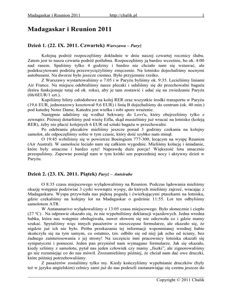 Madagaskar i Reunion 2011 http://chalik.pl 1 Madagaskar i Reunion 2011 Dzień 1. (22. IX. 2011. Czwartek) Warszawa – Paryż Kolejną podróż rozpoczęliśmy dokładnie w dniu naszej czwartej rocznicy ślubu. Zatem jest to nasza czwarta podróż poślubna. Rozpoczęliśmy ją bardzo wcześnie, bo ok. 4:00 nad ranem. Spaliśmy tylko 4 godziny i bardzo nie chciało nam się wstawać, ale podekscytowani podróżą przezwyciężyliśmy zmęczenie. Na lotnisko dojechaliśmy nocnymi autobusami. Na dworze było jeszcze ciemno. Było przyjemnie rześko. Z Warszawy wystartowaliśmy o 7:05 i w Paryżu byliśmy ok. 9:35. Lecieliśmy liniami Air France. Na miejscu odebraliśmy nasze plecaki i udaliśmy się do przechowalni bagażu (która funkcjonuje tutaj od ok. roku), aby je tam zostawić i udać się na zwiedzanie Paryża (6h/6EUR/1 szt.). Kupiliśmy bilety całodobowe na kolej RER oraz wszystkie środki transportu w Paryżu (19,6 EUR, jednorazowy kosztował 9,6 EUR) i linią B dojechaliśmy do centrum (ok. 40 min.) pod katedrę Notre Dame. Katedra jest wielka i robi spore wrażenie. Następnie udaliśmy się wzdłuż Sekwany do Lovr'u, który obejrzeliśmy tylko z zewnątrz. Później dotarliśmy pod wieżę Eifla, skąd musieliśmy już wracać na lotnisko (koleją RER), żeby nie płacić kolejnych 6 EUR od sztuki bagażu w przechowalni. Po odebraniu plecaków mieliśmy jeszcze ponad 3 godziny czekania na kolejny samolot, ale odpoczęliśmy sobie w tym czasie, który dość szybko nam minął. O 19:45 wzbiliśmy się w powietrze Boeingiem 777-300, lecącym na wyspę Reunion (Air Austral). W samolocie leciało nam się całkiem wygodnie. Mieliśmy kolację i śniadanie, które były smaczne i bardzo syte! Naprawdę duże porcje! Większość lotu smacznie przespaliśmy. Zapewne pomógł nam w tym krótki sen poprzedniej nocy i aktywny dzień w Paryżu. Dzień 2. (23. IX. 2011. Piątek) Paryż – Antsirabe O 8:35 czasu miejscowego wylądowaliśmy na Reunion. Podczas lądowania mieliśmy okazję wstępnie podziwiać 3 cyrki wewnątrz wyspy, do których mieliśmy zajrzeć, wracając z Madagaskaru. Wyspa przywitała nas piękną pogodą i ćwierkającymi ptaszkami na lotnisku, gdzie czekaliśmy na kolejny lot na Madagaskar o godzinie 11:55. Lot ten odbyliśmy samolotem ATR. W Antananarivo wylądowaliśmy o 13:05 czasu miejscowego. Było słonecznie i ciepło (27 ºC) . Na odprawie okazało się, że nie wypełniliśmy deklaracji wjazdowych. Jedna wredna babka, która nas wstępnie obsługiwała, nawet słowem się nie odezwała co i gdzie mamy szukać. Spytaliśmy więc innych pasażerów o nieszczęsne formularze, ale okazało się, że nigdzie już ich nie było. Próba przekazania tej informacji wspomnianej wrednej babie skończyła się na tym samym, co ostatnio, tzn. odbiło się od niej jak echo od ściany, bez żadnego zainteresowania z jej strony! Na szczęście inni pracownicy lotniska okazali się sympatyczni i pomocni. Jeden pan przyniósł nam wymagane formularze. Jak się okazało, kiedy szliśmy z samolotu, pytał nas jeden człowiek czy mamy „fiszki”, ale zignorowaliśmy go nie rozumiejąc co do nas mówił. Zrozumieliśmy później, że chciał nam dać owe druczki, które później potrzebowaliśmy. Z pasażerów zostaliśmy tylko my. Kiedy kończyliśmy wypełnianie druczków (były też w języku angielskim) celnicy sami już do nas podeszli zastanawiając się czemu jeszcze do Copyright © 2011 Chalik Madagaskar i Reunion 2011 http://chalik.pl 2 nich nie dotarliśmy. Dostaliśmy pieczątki darmowego wjazdu do Madagaskaru, a nasze plecaki ktoś już zdjął z taśmy i przyniósł do nas. Wredna baba okazała się wyjątkiem wśród sympatycznego personelu lotniska! Wymieniliśmy trochę pieniędzy (1 EUR = 2700 MGA) i poszliśmy się dowiedzieć o loty z Morondavy do Tulear. Przed wyjazdem sprawdzałem, że był bezpośredni (czyli tańszy) lot 30 września, ale do tej pory rozkład zdążył się zmienić! Zmienił się 28 września. Okazało się, że ani lot z Morondavy do Tulear, ani ten w przeciwną stronę nam nie pasował! Mówi się trudno! Tym razem jednak, ze względu na niepewny transport wewnętrzny, byliśmy przygotowani na zmiany planów. Ważna informacja to taka, że na miejscu bilety w Air Madagascar okazały się być tańsze o nawet 46 EUR w porównaniu do cen na ich stronie internetowej! Zdecydowaliśmy się wstępnie pojechać lądem do Morondavy i być może stamtąd wrócić samolotem do Tany. Na lotnisku wytargowaliśmy u jednego z tutejszych taksówkarzy przejazd na południowy dworzec taxi-brousse za 23.000 MGA. Jadąc na dworzec mijaliśmy dużo pól ryżowych, w których co raz ktoś pracował po uda w błocie, albo po prostu bawiły się tam dzieci w błocie. Widzieliśmy również wiele miejsc, gdzie ludzie domowymi sposobami wytwarzali cegły z czerwonego błota, które potem wypalali i suszyli na słońcu. Na ulicach był spory ruch. Wzdłuż ulic kręciło się mnóstwo ludzi, były rozstawione różne sklepiki, kramiki, warzywniaki, wulkanizacje, itp. Wszystko można było tam zaleźć. Sprzedaż surowego mięsa wiszącego przy ulicy to była normalka! Wokół było sporo śmieci i panował brud. Kraj trzeciego świata. Zapyziały, brudny, miejscami śmierdzący i biedny, ale za to tętniący życiem i tworzący interesujący koloryt, dla którego m. in. tutaj przyjechaliśmy! Po wcześniejszych naszych podróżach czuliśmy się już tutaj całkiem swojsko! Myślę, że gdyby to była nasza pierwsza podróż w taką rzeczywistość, to czulibyśmy się tutaj niepewnie i lękliwie (pewnie podobnie jak kiedyś w pierwszych dniach w Jemenie). Jednak do puki ludzie są przyjaźnie nastawieni, nie ma się czego obawiać. Tak właśnie jest na Madagaskarze! Na dworcu taksówek od razu zostaliśmy „sprzedani” jakiemuś kierowcy busa, ale to nawet dobrze, bo nie musieliśmy sami odnajdować transportu w tym wielkim rozgardiaszu nie znając j