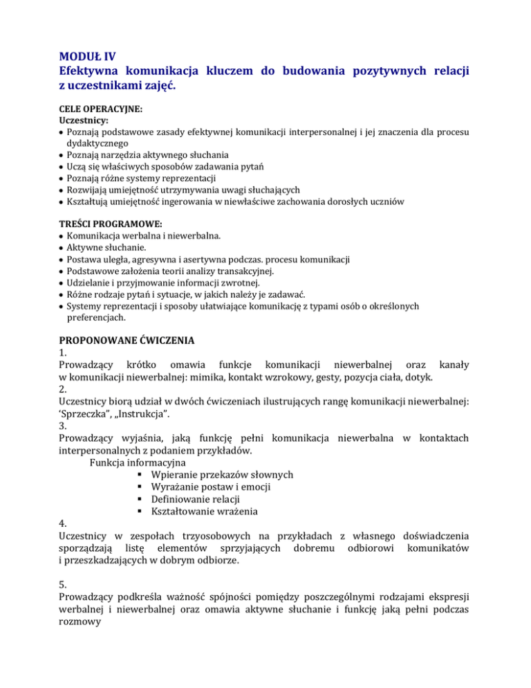MODUŁ IV Efektywna komunikacja kluczem do budowania pozytywnych relacji z uczestnikami zajęć. CELE OPERACYJNE: Uczestnicy: Poznają podstawowe zasady efektywnej komunikacji interpersonalnej i jej znaczenia dla procesu dydaktycznego Poznają narzędzia aktywnego słuchania Uczą się właściwych sposobów zadawania pytań Poznają różne systemy reprezentacji Rozwijają umiejętność utrzymywania uwagi słuchających Kształtują umiejętność ingerowania w niewłaściwe zachowania dorosłych uczniów TREŚCI PROGRAMOWE: Komunikacja werbalna i niewerbalna. Aktywne słuchanie. Postawa uległa, agresywna i asertywna podczas. procesu komunikacji Podstawowe założenia teorii analizy transakcyjnej. Udzielanie i przyjmowanie informacji zwrotnej. Różne rodzaje pytań i sytuacje, w jakich należy je zadawać. Systemy reprezentacji i sposoby ułatwiające komunikację z typami osób o określonych preferencjach. PROPONOWANE ĆWICZENIA 1. Prowadzący krótko omawia funkcje komunikacji niewerbalnej oraz kanały w komunikacji niewerbalnej: mimika, kontakt wzrokowy, gesty, pozycja ciała, dotyk. 2. Uczestnicy biorą udział w dwóch ćwiczeniach ilustrujących rangę komunikacji niewerbalnej: ‘Sprzeczka”, „Instrukcja”. 3. Prowadzący wyjaśnia, jaką funkcję pełni komunikacja niewerbalna w kontaktach interpersonalnych z podaniem przykładów. Funkcja informacyjna Wpieranie przekazów słownych Wyrażanie postaw i emocji Definiowanie relacji Kształtowanie wrażenia 4. Uczestnicy w zespołach trzyosobowych na przykładach z własnego doświadczenia sporządzają listę elementów sprzyjających dobremu odbiorowi komunikatów i przeszkadzających w dobrym odbiorze. 5. Prowadzący podkreśla ważność spójności pomiędzy poszczególnymi rodzajami ekspresji werbalnej i niewerbalnej oraz omawia aktywne słuchanie i funkcję jaką pełni podczas rozmowy 6. Uczestnicy biorą udział w ćwiczeniach pozwalających na doskonalenie użycia narzędzi aktywnego słuchania: komunikat „ja”, komunikaty otwierające, parafraza, klaryfikacja, odzwierciedlanie, dowartościowanie, podsumowywanie 7. Prowadzący omawia bariery w komunikacji. 8. Uczestnicy biorą udział w ćwiczeniach polegających na odgrywaniu ról. 9. Prowadzący omawia komunikację interpersonalną z perspektywy analizy transakcyjnej; omawia stany ego: Rodzica, Dziecka i Dorosłego. Uczestnicy wykonują w zespołach ćwiczenie polegające na dopasowywaniu różnych komunikatów do omówionych stanów ego Prowadzący omawia aparat pojęciowy Erica Berne’a i jego interpretację komunikacji niewerbalnej. Prowadzący przedstawia rodzaje transakcji i typowe gry, jakie „uprawiają” ludzie. 10. Uczestnicy odgrywają scenki wg wylosowanych scenariuszy – każdy zespół odgrywa scenkę dwukrotnie – wchodząc w tzw. grę i grając czysto. 11. Wspólnie ustalamy i formułujemy Zasady czystej komunikacji 12. Prowadzący przedstawia systemy reprezentacji, a uczestnicy starają się dopasować do nich najbardziej efektywne strategie nauczania MATERIAŁY POMOCNICZE DLA UCZESTNIKÓW ZAJĘĆ – MODUŁ IV KOMUNIKACJA INTERPERSONALNA Dlaczego porozumiewanie się pomiędzy ludźmi jest tak ważne? Po prostu na tym polega nasze życie. Jesteśmy tak skonstruowani, że prawie non-stop wysyłamy sygnały i reagujemy na sygnały wysyłane przez innych. Ciekawość innych ludzi jest nieodłącznym elementem ludzkiej natury, dlatego prowadzenie rozmowy to nasza codzienna aktywność. Bez prowadzenia konwersacji trudno byłoby wyobrazić sobie jakiekolwiek życie społeczne. Rozpoczynamy komunikowanie się z chwilą naszych narodzin (a właściwie wcześniej, bo dziecko zaczyna kontaktować się z matką, jeszcze przed swoim przyjściem na świat), a kończymy umierając. Psychologowie szacują, a że na porozumiewanie się z innymi przeznaczamy poza snem 70% naszego czasu, 32% na mówienie, 42-57% na słuchanie (badania: Cooper, 1994 r.). Poświęcamy tak wiele energii i czasu na porozumiewanie się z innymi, bo chcemy zrozumieć ich zachowanie, tylko w ten sposób możemy wyjaśnić i przewidzieć świat, w którym żyjemy. Kiedy zaś nie porozumiewamy się z innymi, rozmawiamy sami ze sobą, prowadząc dialog wewnętrzny. Komunikacja od dawna jest przedmiotem badań naukowych. Znajomość jej procesu może poprawić poziom wzajemnego rozumienia się ludzi, tym samym zmniejszając liczbę konfliktów. Można zaryzykować stwierdzenie, że większość nieporozumień wynika nie z różnic interesów, lecz wzajemnej nieznajomości podstaw skutecznej komunikacji międzyludzkiej. Żyjemy jednak w czasach, które nie sprzyjają rozwojowi umiejętności komunikacyjnych. Bezpośrednią rozmowę z drugim człowiekiem zastępuje komputer, SMS.. Coraz mniej miejsca i czasu poświęcamy na rozpoznawanie uczuć i stojących za nimi wartości. Coraz trudniej rozpoznać wzajemne potrzeby. A to one są naprawdę bodźcem do nawiązania relacji komunikacyjnych. „Język jest lustrem duszy – powiedz coś, abym mógł cię zobaczyć” George Miller, „Język i komunikowanie”, 1951 r. Im więcej znamy znaczeń słów, tym łatwiej wyrazić nasze uczucia i stojące za nimi potrzeby. A tymczasem nasz język staje się uboższy. Same słowa znaczą wiele, ale interpretacja ich jest właściwsza, kiedy dodamy do nich kontekst sytuacyjny, kiedy możemy wsłuchać się w ich brzmienie, obejrzeć minę i gesty, z jakimi ktoś je wypowiada, wtedy możemy mieć większą pewność co do odczytania prawdziwej intencji ich nadawcy. Komunikacja to proces dwukierunkowy – z jednej strony znajduje się nadawca, z drugiej odbiorca. Ważnym źródłem informacji jest zachowanie niewerbalne, czyli mimika i ruchy ciała (wyraz twarzy, gesty, ton głosu, pozycje i ruchy ciała, dotyk, sposób spoglądania). Obserwując je szybko tworzymy pewne wyobrażenia. Dlatego należy pamiętać, że pierwsze wrażenie jest bardzo ważne i możliwe do wywarcia na kimś tylko jeden