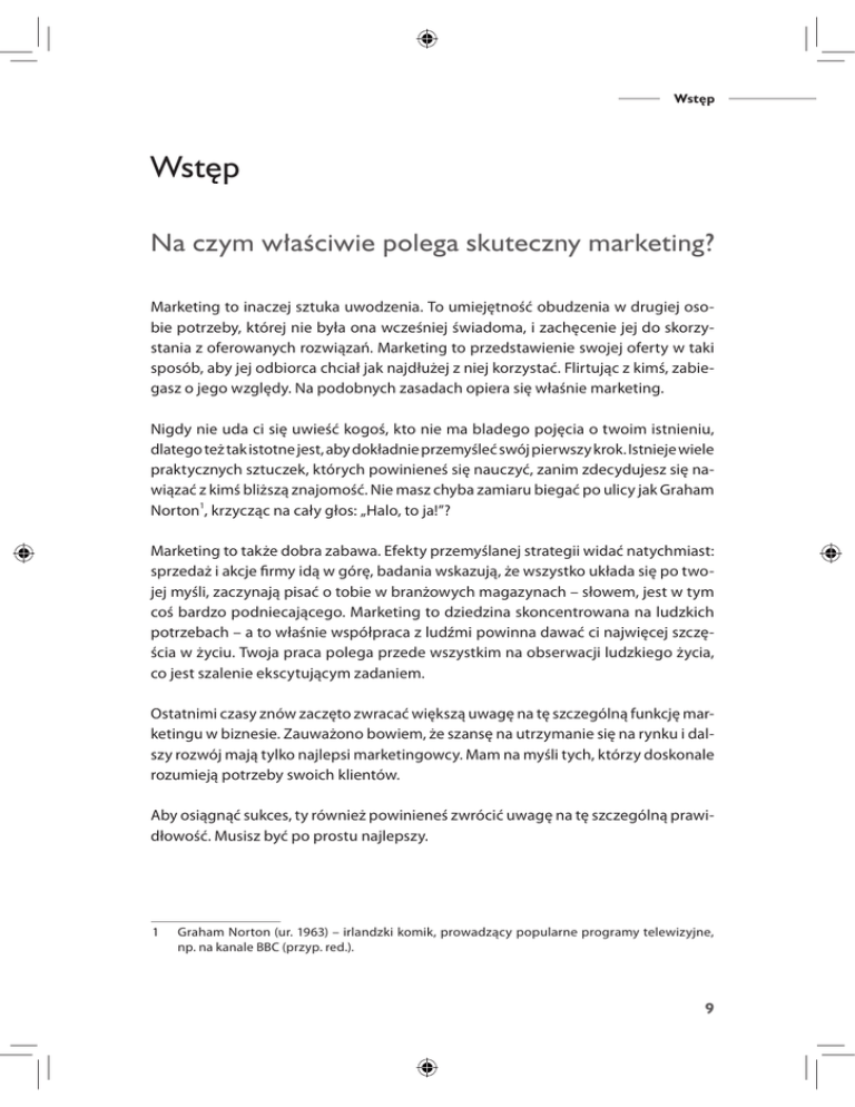 Wstęp Wstęp Na czym właściwie polega skuteczny marketing? Marketing to inaczej sztuka uwodzenia. To umiejętność obudzenia w drugiej osobie potrzeby, której nie była ona wcześniej świadoma, i zachęcenie jej do skorzystania z oferowanych rozwiązań. Marketing to przedstawienie swojej oferty w taki sposób, aby jej odbiorca chciał jak najdłużej z niej korzystać. Flirtując z kimś, zabiegasz o jego względy. Na podobnych zasadach opiera się właśnie marketing. Nigdy nie uda ci się uwieść kogoś, kto nie ma bladego pojęcia o twoim istnieniu, dlatego też tak istotne jest, aby dokładnie przemyśleć swój pierwszy krok. Istnieje wiele praktycznych sztuczek, których powinieneś się nauczyć, zanim zdecydujesz się nawiązać z kimś bliższą znajomość. Nie masz chyba zamiaru biegać po ulicy jak Graham Norton1, krzycząc na cały głos: „Halo, to ja!”? Marketing to także dobra zabawa. Efekty przemyślanej strategii widać natychmiast: sprzedaż i akcje firmy idą w górę, badania wskazują, że wszystko układa się po twojej myśli, zaczynają pisać o tobie w branżowych magazynach – słowem, jest w tym coś bardzo podniecającego. Marketing to dziedzina skoncentrowana na ludzkich potrzebach – a to właśnie współpraca z ludźmi powinna dawać ci najwięcej szczęścia w życiu. Twoja praca polega przede wszystkim na obserwacji ludzkiego życia, co jest szalenie ekscytującym zadaniem. Ostatnimi czasy znów zaczęto zwracać większą uwagę na tę szczególną funkcję marketingu w biznesie. Zauważono bowiem, że szansę na utrzymanie się na rynku i dalszy rozwój mają tylko najlepsi marketingowcy. Mam na myśli tych, którzy doskonale rozumieją potrzeby swoich klientów. Aby osiągnąć sukces, ty również powinieneś zwrócić uwagę na tę szczególną prawidłowość. Musisz być po prostu najlepszy. 1 Graham Norton (ur. 1963) – irlandzki komik, prowadzący popularne programy telewizyjne, np. na kanale BBC (przyp. red.). 9 Marketing bez tabu, czyli jak to robią najlepsi Zakładam, że posiadasz już pewną elementarną wiedzę z dziedziny marketingu lub, w najlepszym wypadku, masz silną motywację do nauki. Same chęci zapewne nie wystarczą, dlatego trzeba jak najszybciej odrobić pracę domową. Poczuj więc smak tego mocnego jak diabli narkotyku o nazwie Skuteczny Marketing; siły, która naprawdę potrafi wiele zmienić. Na początek przeczytaj kilka ciekawych historii o tym, w jaki sposób marketing stał się życiową pasją największych geniuszy w tej dziedzinie. Kto wie, może wkrótce ty również znajdziesz się w tym zacnym gronie? Marketingowe historie – czas na małe rozeznanie Przykład Nike. Po prostu to zrób Na ogół wszystkie reklamy Nike są skazane na sukces. Warto wspomnieć chociażby o dwóch plakatach, które pojawiły się w latach 80. w Wielkiej Brytanii, kiedy firma zaistniała na tamtejszym rynku. Pierwszy to reklama butów sportowych noszonych m.in. przez niezwykle utalentowanego i popularnego wówczas amerykańskiego tenisistę, Johna McEnroe’a. Na plakacie reklamowym umieszczono zdjęcie zwykłego buta i prosty podpis: „McEnroe daje za nie swoją głowę”. Twórcy drugiego plakatu skoncentrowali się na grupie biegaczy biorących udział w odbywającym się wówczas londyńskim maratonie. Ukazał się on mniej więcej w tym samym czasie, kiedy jeden z czołowych brytyjskich polityków, Ken Livingstone, chciał zasłużyć się w jakiś sposób jako burmistrz Londynu. Po raz kolejny zastosowano tutaj tę samą taktykę – wykorzystano zdjęcie zwykłego buta bez żadnych ozdobników i prosty podpis: „Drogi Kenie, tak właśnie się rządzi Londynem” 2. Jak wpada się na tak wyśmienite pomysły? Najpierw musisz się zastanowić, co oznacza marka i do czego służy dany produkt, a następnie reklamujesz go takim, jaki jest. 2 10 „Dear Ken, here’s the way to run London”. W języku angielskim czasownik „run” może mieć dwa różne znaczenia: „biegać” oraz „rządzić”, w zależności od kontekstu (przyp. tłum.). www.samosedno.com.pl Wstęp Przykład Szczęśliwe krowy. Przepyszne lody Ciekawa historia wiąże się również z wejściem na rynek firmy Ben & Jerry’s Ice Cream (obecnie będącej własnością marki Wall’s, oddziału firmy Unilever). Przedsiębiorstwo miało bez wątpienia doskonałych speców od public relations – wszyscy przecież wiedzą, że firmę założyła dwójka hippisów z długimi brodami, wesołym podejściem do życia i wielkim zamiłowaniem do organicznego jedzenia. Ben i Jerry zafundowali swoim klientom zabawnie wyglądający i mile kojarzący się produkt. Ich filozofia została zawarta w krótkim, lecz niezwykle treściwym zdaniu, które znalazło się na plakatach rozwieszonych tu i ówdzie w londyńskim metrze: „Nasza misja: przepyszne lody dla każdego”. Trzeba dodawać coś więcej? Doskonałym posunięciem było żartobliwe potraktowanie poważnie brzmiącego stwierdzenia „nasza misja”. Firma do tej pory lubi stroić sobie różne żarty – wystarczy spojrzeć na jej współczesne slogany, takie jak „Wolność, miłość i lody” czy „Doimy szczęśliwe krowy, a nie naszych klientów”. Po prostu genialne! Uwielbiam logo, które rozśmieszają Istnieją dwa logo, które potrafią rozśmieszyć mnie za każdym razem, kiedy na nie patrzę. Pierwsze z nich to logo firmy Apple – duże, pomalowane na sześć kolorów nadgryzione jabłko (symbolizujące Eden XX i XXI w.) – jest po prostu perfekcyjne i zabawne. Następne w kolejce jest równie kolorowe i w dodatku trójwymiarowe logo Google, dzieło Dennisa Hwanga. Sekret polega na tym, że wygląd logo zmienia się nieco przy różnych większych okazjach, przez co odbiorca odnosi wrażenie, że firma stale się rozwija. Obydwa logo należą do niezwykle wpływowych marek. Nie znajdziesz tutaj ani śladu żadnej korporacyjnej biurokracji. Warto poświęcić trochę czasu,