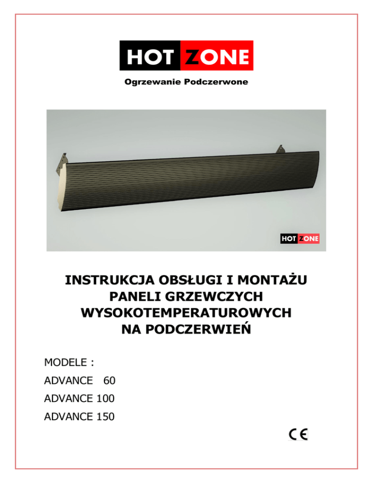 Ogrzewanie Podczerwone INSTRUKCJA OBSŁUGI I MONTAŻU PANELI GRZEWCZYCH WYSOKOTEMPERATUROWYCH NA PODCZERWIEŃ MODELE : ADVANCE 60 ADVANCE 100 ADVANCE 150 Szanowny kliencie, Gratulujemy trafnego wyboru i dziękujemy za zakup wydajnych, niezawodnych i estetycznie wykonanych paneli grzewczych na podczerwień. Panele marki iREDheat® są produktem europejskim, wykonanym według najwyższych standardów i norm, a tym samym produktem bezpiecznym w użytkowaniu. Zapewniamy 100% gwarancji jakości. Wybierając panele grzewcze w technologii podczerwieni, wybrali Państwo zdrowe, komfortowe i ekologiczne ogrzewanie dla siebie i swoich bliskich. Mamy nadzieję, że produkty firmy iREDheat® będą dla Państwa nie tylko źródłem ciepła, ale i satysfakcji z dokonanego zakupu na wiele lat. UWAGA: ZE WZGLĘDÓW BEZPIECZEŃSTWA, W CELU UNIKNIĘCIA USZKODZENIA URZĄDZENIA I INNYCH PRZEDMIOTÓW, ORAZ ABY W PEŁNI WYKORZYSTAĆ ZALETY NASZEGO PRODUKTU, PROSIMY PRZED ROZPOCZĘCIEM INSTALACJI ZAPOZNAĆ SIĘ UWAŻNIE Z PONIŻSZĄ INSTRUKCJĄ. NALEŻY BEZWZGLĘDNIE PRZESTRZEGAĆ ZASAD BEZPIECZEŃSTWA PODCZAS INSTALOWANIA URZĄDZENIA. Generalny dystrybutor firmy iREDheat® Ogrzewanie Podczerwone-Michał Obal OGÓLNE INFORMACJE O PRODUKCIE Panel ADVANCE, to niezwykle skuteczny, wysokotemperaturowy panel grzewczy na podczerwień, wykonany z najwyższej jakości materiałów, zgodnie z wszelkimi wymogami norm europejskich. Panele ADVANCE zostały stworzone z wykorzystaniem najnowszych technologii z uwzględnieniem maksymalnej wydajności cieplnej. Są trwałe, niezawodne i efektywne. Specjalnie zaprojektowany, łukowy i żebrowany element grzewczy, znacznie zwiększa emisje, jak i powierzchnie oddziaływania promieniowania podczerwonego, niż to ma miejsce w przypadku płaskich emisorów promieniowania cieplnego. Efektywność grzewcza paneli ADVANCE jest unikatowa, również dzięki zastosowanej, bazująca na nano technologii powłoce emisyjnej o wytrzymałości cieplnej do 500 stopni Celsjusza, którą pokryty jest żebrowany emitor fali cieplnej. Metalowa obudowa jest kompaktowa i znacznie redukuje wagę całego panelu grzewczego. Urządzenia ADVANCE posiadają znakomitą izolację cieplną tylnej powierzchni grzejnika. Użyte atestowane materiały izolacyjne firmy Knauf, zapobiegają nadmiernemu nagrzewaniu się obudowy i stratom ciepła poprzez tylną część urządzenia. Panel ADVANCE jest nie tylko niezwykle skuteczny i ekonomiczny, ale również elegancki i estetyczny, wykonany z niezwykłą starannością. Dzięki specjalnie zaprojektowanym, ruchomym uchwytom (w zestawie) montowane mogą być zarówno na ścianie jak i suficie, belkach stropowych, a w przypadku wyższych pomieszczeń, podwieszone ma metalowych linkach. Krótsze z nich (Advance 60), moga być montowane na ramionach dużych parasoli ogrodowych. Każdy panel wyposażony jest w dwa przewody zasilające, oraz uziemienie. Urządzenia na podczerwień ADVANCE ze względu na stosunkowo duża moc grzewczą i odporność na wilgoć, zaliczane są do tzw. paneli zewnętrznych lub przemysłowych i stanowią najbardziej ekonomiczną i nowatorską alternatywę ogrzewania obiektów wielko-kubaturowych, takich jak: hale produkcyjne, handlowe, sportowe, magazyny, kościoły, czy obiekty mieszkalne i użytkowe o ponadstandardowej kubaturze. Kolejnym bardzo popularnym zastosowaniem naszych paneli są wszelkiego rodzaju ogródki restauracyjne, namioty gastronomiczne, patia, tarasy, oranżerie, gdzie będzie można znacznie wydłużyć sezon korzystania z nich. Wystarczy osłona przed opadami i wiatrem, a będziemy się mogli rozkoszować przyjemnym uczuciem ciepła nawet w zimowe dni. Panele grzewcze ADVANCE rozgrzewają się do temperatury ok. 360 stopni Celsjusza w zaledwie 10 minut. Panele na ADVANCE, ze względu na ich bardzo wysoką sprawność cieplną i stosunkowo niskie koszty eksploatacji, coraz częściej stosuje się w rolnictwie, zarówno w przypadku upraw jak i hodowli. Znakomicie sprawdzają się w przypadku dostarczenia komfortu cieplnego w warsztatach samochodowych, serwisach wymiany opon itp. gdzie z powodu często otwieranych lub na stale otwartych bram wjazdowych, utrzymanie ciepła jest praktycznie niemożliwe i bardzo kosztowne. W przypadku paneli ADVANCE działających w technologii podczerwieni ogrzewane są przede wszystkim obiekty, a więc i ludzie. Stosując panele ADVANCE nie ma potrzeby nagrzewania powietrza całej kubatury obiektu. Możliwe jest również korzystanie z paneli w łazience i na basenach krytych, jednakże ze względów bezpieczeństwa (np.w przypadku niewłaściwe zainstalowanych paneli) i aby bezwzględnie uniknąć kontaktu urządzenia z wodą, nie powinno się ich montować bezpośrednio nad wanną, kabiną prysznicową, bądź lustrem wody w basenie. Jakiekolwiek, niezgodne z przeznaczeniem użytkowym panelu grzewczego zastosowanie, może prowadzić do uszkodzeń lub powodować straty dla osób, zwierząt bądź przedmiotów. Producent i importer nie ponoszą odpowiedzialności za ewentualne szkody wynikające z niewłaściwego podłączenia, zamontowania i używania urządzenia. SPECYFIKACJA TECHNICZNA Model Wymiar Advance 60 Advance 100 Advance 150 60 x 19 x 6 cm 100 x 19 x 6 cm 150 x 19 x 6 cm Moc Waga 1100 W 2000 W 2400 W 4 kg* 6 kg* 8,5 kg* *wagi produktów podane są wraz z uchwytami mocujacymi Panele grzewcze ADVANCE firmy iREDheat® działają w oparciu o napięcie elektryczne 230V / 50Hz Temperatura powierzchniowa panelu wynosi ok.360°C. Zalecana maksymalna wysokość montażu wynosi 2,8 m. Urządzenie wykonane jest zgodnie z wymaganiami norm Unii Europejskiej CE Zalecane odległości od obiektów w przypadku montowania grzejnika Advance na suficie: Minimalna odległość od sufitu: 15 cm Minimalna Odległość od ściany Minimalna odległość od obiektów Minimalna odległość od podłogi 220 cm W celu wykorzystania maksymalnej efektywności urządzenia, zalecana wysokość montowania panelu na 