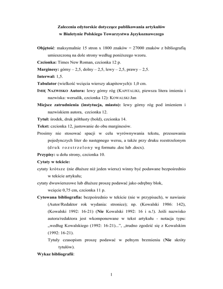 Zalecenia edytorskie dotyczące publikowania artykułów w Biuletynie Polskiego Towarzystwa Językoznawczego Objętość: maksymalnie 15 stron x 1800 znaków = 27000 znaków z bibliografią umieszczoną na dole strony według poniższego wzoru. Czcionka: Times New Roman, czcionka 12 p. Marginesy: górny – 2,5, dolny – 2,5, lewy – 2,5, prawy – 2,5. Interwał: 1,5. Tabulator (wielkość wcięcia wierszy akapitowych): 1,0 cm. IMIĘ NAZWISKO Autora: lewy górny róg (KAPITALIKI, piewsza litera imienia i nazwiska: wersalik, czcionka 12): KOWALSKI Jan Miejsce zatrudnienia (instytucja, miasto): lewy górny róg pod imieniem i nazwiskiem autora, czcionka 12. Tytuł: środek, druk półtłusty (bold), czcionka 14. Tekst: czcionka 12, justowanie do obu marginesów. Prosimy nie stosować spacji w celu wyrównywania tekstu, przesuwania pojedynczych liter do następnego wersu, a także przy druku rozstrzelonym (d r u k r o z s t r z e l o n y wg formatu .doc lub .docx). Przypisy: u dołu strony, czcionka 10. Cytaty w tekście: cytaty krótsze (nie dłuższe niż jeden wiersz) winny być podawane bezpośrednio w tekście artykułu; cytaty dwuwierszowe lub dłuższe proszę podawać jako odrębny blok, wcięcie 0,75 cm, czcionka 11 p. Cytowana bibliografia: bezpośrednio w tekście (nie w przypisach), w nawiasie (Autor/Redaktor rok wydania: stronice); np. (Kowalski 1986: 142), (Kowalski 1992: 16-21) (Nie Kowalski 1992: 16 i n.!). Jeśli nazwisko autora/redaktora jest wkomponowane w tekst artykułu - notacja typu: „według Kowalskiego (1992: 16-21)...”, „trudno zgodzić się z Kowalskim (1992: 16-21). Tytuły czasopism proszę podawać w pełnym brzmieniu (Nie skróty tytułów). Wykaz bibliografii: 1 Na końcu artykułu. W wykazie proszę podawać tylko bibliografię cytowaną w artykule. Pozycje bibliograficzne w alfabetach opartych na cyrylicy proszę podawać w oryginalnej pisowni. Porządek alfabetyczny. Przy kilku publikacjach jednego autora – porządek chronologiczny; jeśli cytowane są dwie (lub więcej) publikacje jednego autora wydane w tym samym roku, należy je rozróżnić literami alfabetu łacińskiego [NOWAK Józef (2003a), NOWAK Józef (2003b). Pozycje pisane cyrylicą (grażdanką) proszę podawać po wszystkich pozycjach w alfabecie łacińskim. Format bibliografii: Autor / Redaktor: NAZWISKO (KAPITALIKI) Imię (oddzielone od nazwiska przecinkiem); po imieniu redaktora: „red.” oddzielone od imienia przecinkiem. Rok wydania: w nawiasie po imieniu autora / redaktora; przed tytułem: dwukropek. Tytuł publikacji książkowej / czasopisma: kursywa Wzór: MAŃCZAK-WOHLFELD, Elżbieta (1995): Tendencje rozwojowe współczesnych zapożyczeń angielskich w języku polskim. – Kraków: Wydawnictwo Uniwersytetu Jagiellońskiego. PELC, Jerzy, KOJ, Leon, red. (1991): Semiotyka dziś i wczoraj. Wybór tekstów. – Wrocław: Ossolineum. ZAREK, Józef, red. (2002): Nadzieje i zagrożenia. Slawistyka i komparatystyka u progu nowego tysiąclecia. – Katowice: Wydawnictwo Uniwersytetu Śląskiego. АПРЕСЯН, Юрий Д., БОГУСЛАВСКАЯ, Ольга Ю. [et al.] (1997): Новый объяснительный словарь синонимов русского языка. – Школа «Языки русской культуры», Москва. 2 Tytuł artykułu: Antykwa. Po tytule artykułu: kropka odstęp myślnik odstęp (. – .) Artykuł opublikowany w czasopiśmie: tytuł czasopisma po myślniku. Artykuł opublikowany w wydawnictwie książkowym: po myślniku, przed tytułem artykułu [w:], a następnie imię i nazwisko redaktora (w tej kolejności) Po tytule czasopisma / tomu: przecinek stronice (. – Tytuł, 72-86.) Drugi (i następne) wiersz pozycji bibliograficznej: wcięcie 0,75 cm. Wzór: ŁUCZYŃSKI, Edward (2002): Fleksja języka polskiego z punktu widzenia ontogenezy mowy. – Biuletyn Polskiego Towarzystwa Językoznawczego LVIII, 157-165. MARTIN, Richard M. (1991): O metaforze i formie logicznej. – [w:] Jerzy PELC i Leon KOJ (red.): Semiotyka dziś i wczoraj. Wybór tekstów, 49-62. RABIEGA-WIŚNIEWSKA, Joanna, RUDOLF, Michał (2003a): AMOR – program automatycznej analizy fleksyjnej tekstu polskiego. – Biuletyn Polskiego Towarzystwa Językoznawczego LXIII, 175-186. WYSOCZAŃSKI, Włodzimierz (2002): Kategoria symilatywności w językach słowiańskich w ujęciu typologicznym. – [w:] Józef ZAREK (red.): Nadzieje i zagrożenia. Slawistyka i komparatystyka u progu nowego tysiąclecia. – Katowice: Wydawnictwo Uniwersytetu Śląskiego, 371-376. ПАДУЧЕВА, Елена В. (1992): О семантическом подходе к синтаксису и генитивном субъекте глагола быть. – Russian Linguistics 16, 53-63. Artykuł, streszczenia, wyrazy klucze i bibliografię należy przesłać we współnym pliku. Streszczenia: maksymalnie 900 znaków (pół strony) w języku angielskim (z przekładem tytułu) i polskim należy zamieścić bezpośrednio pod tytułem artykułu (najpierw angielskie, potem polskie). Wyrazy klucze: w języku angielskim i polskim (nie więcej niż 7 wyrazów) należy zamieścić pod streszczeniami przed treścią artykułu (wyrazy klucze w j. angielskim pod streszczeniem angielskim, wyrazy klucze w j. polskim pod streszczeniem polskim). 3 Wszystkie artykuły są przed złożeniem do druku recenzowane przez dwóch niezależnych recenzentów, którzy pozostają anonimowi. Artykuł należy wysłać pocztą elektroniczną na adres sekretarza Redakcji w dwóch formatach – .doc/.docx oraz .pdf: [email protected] Dodatkowe dokumenty, które należy przesłać na adres sekretarza Redakcji: (1) notka o autorze (wzór dostępny na stronie internetowej czasopisma) (2) skan wypełnionego oświadczenia o prawach autorskich (formularz dostępny na stronie internetowej czasopisma) Uprzejmie prosimy o załączenie wszystkich dokumentów do jednej wiadomości – w sumie 4 załączniki: (1) artyk
