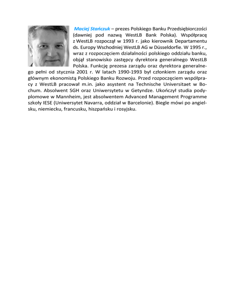 Maciej Stańczuk – prezes Polskiego Banku Przedsiębiorczości (dawniej pod nazwą WestLB Bank Polska). Współpracę z WestLB rozpoczął w 1993 r. jako kierownik Departamentu ds. Europy Wschodniej WestLB AG w Düsseldorfie. W 1995 r., wraz z rozpoczęciem działalności polskiego oddziału banku, objął stanowisko zastępcy dyrektora generalnego WestLB Polska. Funkcję prezesa zarządu oraz dyrektora generalnego pełni od stycznia 2001 r. W latach 1990-1993 był członkiem zarządu oraz głównym ekonomistą Polskiego Banku Rozwoju. Przed rozpoczęciem współpracy z WestLB pracował m.in. jako asystent na Technische Universitaet w Bochum. Absolwent SGH oraz Uniwersytetu w Getyndze. Ukończył studia podyplomowe w Mannheim, jest absolwentem Advanced Management Programme szkoły IESE (Uniwersytet Navarra, oddział w Barcelonie). Biegle mówi po angielsku, niemiecku, francusku, hiszpańsku i rosyjsku.