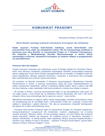K O M U N I K AT P R A S O W Y Warszawa (Polska), 26 lipca 2016 roku Saint-Gobain pomaga budować mieszkania treningowe dla młodzieży Dzięki wsparciu Fundacji Saint-Gobain Initiatives, marek Saint-Gobain oraz pracowników firmy udało się zaadaptować blisko 180 m2 nieużywanego poddasza w kamienicy przy ulicy Brechta na warszawskiej Pradze na 7 mieszkań treningowych. Dla chłopców z Młodzieżowego Ośrodka Wychowawczego w Aninie, którzy zamieszkają na Brechta, mieszkania treningowe są ostatnim etapem w przygotowaniu do samodzielności. Pomocna dłoń dla młodych Projekt tworzenia mieszkań jest realizowany przez Fundację Habitat for Humanity Poland, która chce stworzyć modelowe rozwiązanie wspierające młodzież opuszczającą instytucje pieczy zastępczej. Grupa Saint-Gobain zaangażowała się od początku w trwające ponad rok prace adaptacyjne, oferując wsparcie finansowe i rzeczowe, a pracownicy firmy pomagali jako wolontariusze przy pracach wykończeniowych. Od września na Brechta zamieszka 6 chłopców opuszczających Młodzieżowy Ośrodek Wychowawczy w Aninie. Z pomocą wychowawcy będą się uczyć odpowiedzialności za siebie i powierzone mieszkanie. Jednym z lokatorów będzie Adrian, który w wieku 4 lat trafił do domu dziecka, a jako nastolatek miał liczne problemy w szkole oraz zatargi z prawem. - „W ośrodku w Aninie z pomocą wychowawców udało mi się uporządkować moje życie. Za rok zdaję maturę i chcę dostać się na Akademię Obrony Narodowej. Dla mnie i dla moich kolegów, którzy tutaj zamieszkają, jest to ogromna szansa” - mówi Adrian. Mieszkania treningowe to miejsce, gdzie młodzi opuszczający ośrodek wychowawczy przez rok przygotowują się do dorosłego życia. Jednocześnie ucząc się i pracując, muszą sami zadbać o mieszkanie i opłacić rachunki. Tak, aby po opuszczeniu mieszkań treningowych byli gotowi do w pełni samodzielnego życia. - „Fundacja Saint-Gobain Initiatives dąży do zapewnienie dostępu do mieszkań wygodnych, energooszczędnych i przyjaznych dla środowiska, osobom znajdującym się w trudnej sytuacji życiowej. Wszyscy wiemy, że bez godnego miejsca, do życia ciężko jest budować swoją przyszłość. Bardzo się cieszymy, że mogliśmy pomóc w stworzeniu mieszkań o dobrym standardzie i w dobrej jakości, które zapewnią młodym poczucie bezpieczeństwa i komfortu oraz ułatwią im start w dorosłość” – wyjaśnia François-Xavier Moser, prezes SaintGobain w Polsce, Rumunii, Bułgarii i Turcji. Compagnie de Saint-Gobain General Delegation Poland, Romania, Bulgaria and Turkey IRIS • Cybernetyki 9 • 02-677 Warsaw • Poland• Tel : +48 (22) 653 79 00 Floreasca Park, 43 Pipera Road • Building A • 3rd floor • Bucharest 2 • Romania • Tel: +40 (21) 207 57 00 Zaangażowanie pracowników Fundacja Saint-Gobain Initiatives przyjęła innowacyjną formułę działania, polegającą na aktywnym uczestnictwie pracowników Grupy Saint-Gobain. Pracownicy mogą zgłaszać projekty w ramach wolontariatu, a później dzięki swojej wiedzy i kompetencjom technicznym biorą także udział w ocenie projektów oraz pilotują ich wdrażanie i realizację. Podobnie było w przypadku projektu adaptacji strychu na mieszkania treningowe, w który zaangażował się jako koordynator Andrzej Kruszyński, pracownik Saint-Gobain. Do pomocy w pracach adaptacyjnych na Brechta zgłosili się także inni pracownicy Grupy, którzy w ramach Dnia Wolontariatu pomagali w pracach wykończeniowych, takich jak malowanie, tynkowanie, czy wykańczanie podłogi. - „Ten wolontariat był dla mnie i moich kolegów wyjątkowym doświadczeniem. Pomagaliśmy w pracach wykończeniowych wspólnie z chłopcami, którzy tutaj zamieszkają. Mieliśmy okazję ich poznać, porozmawiać, a dzięki temu doświadczyliśmy osobiście, że nasza pomoc ma sens. To daje ogromną satysfakcję i radość” – mówi Andrzej Kruszyński. Fundacja Saint Gobain Initiatives z siedzibą w Paryżu sfinansowała koszt prac budowlanych związanych z adaptacją strychu przy ulicy Brechta 12 i był to pierwszy projekt Fundacji zrealizowany w Polsce. Jakość i standard Tworząc produkty do wykończenia oraz izolacji mieszkań i domów, grupa Saint-Gobain stara się przede wszystkim o to, aby wspierały oszczędzanie energii i były przyjazne dla środowiska. - „Mieszkania treningowe znajdują się na strychu, który latem bardzo szybko się nagrzewa, a zimą oddaje ciepło, dlatego szczególnie ważne było dla nas zapewnienie jak najlepszej izolacji dachu, podłogi oraz ścian i zapobieżenie utracie energii oraz ciepła. W adaptacji poddasza wykorzystaliśmy materiały izolacyjne najwyższej jakości” - tłumaczy Henryk Kwapisz, ekspert techniczny ze strony Saint-Gobain. Oddział Saint-Gobain w Polsce dostarczył materiały budowlane i izolacyjne trzech Marek: Weber (materiały wykończeniowe, m.in. tynki, posadzki cementowe i kleje do płytek) Isover (materiały do izolacji dachu oraz ścian) oraz Rigips (systemy stelażowe do sufitów i ścian). O SAINT-GOBAIN Saint-Gobain tworzy, produkuje i dystrybuuje materiały i rozwiązania mające ważny wpływ na jakość życia każdego z nas oraz na naszą wspólną przyszłość. Można je znaleźć wszędzie tam, gdzie mieszkamy i żyjemy na co dzień: w budynkach, środkach transportu, inwestycjach infrastrukturalnych oraz w wielu zastosowaniach przemysłowych. Zapewniają one komfort, wytrzymałość i bezpieczeństwo i stanowią odpowiedź na wyzwania naszych czasów, takie jak ekologiczne budownictwo, oszczędne gospodarowanie zasobami oraz przeciwdziałanie zmianom klimatycznym. Światowy lider w dziedzinie zrównoważonego budownictwa. Wartość przychodów ze sprzedaży w 2015 roku: 39,6 mld EUR Działamy w 66 krajach świata. Zatrudniamy ponad 170 000 pracowników. W Polsce Grupa-Saint-Gobain obecna jest od ponad 20 lat. Nad Wisłą mamy 25 zakładów i zatrudniamy 6000 pracowników.
