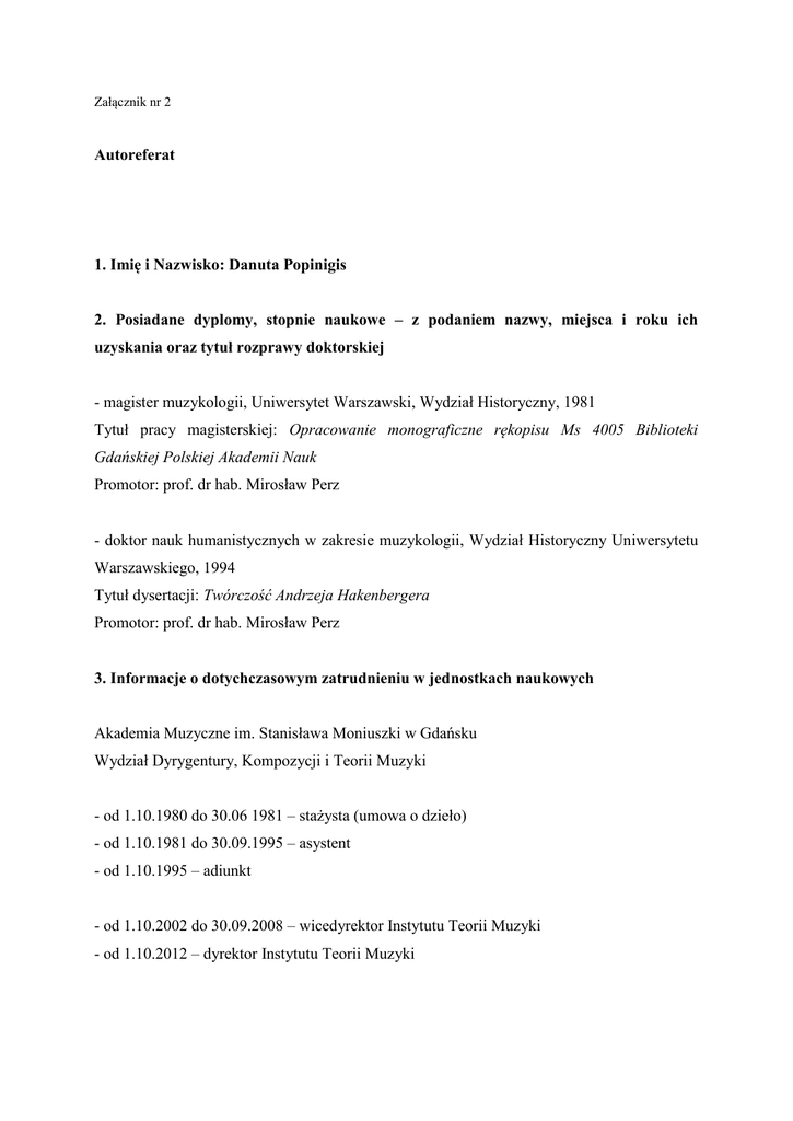 Załącznik nr 2 Autoreferat 1. Imię i Nazwisko: Danuta Popinigis 2. Posiadane dyplomy, stopnie naukowe – z podaniem nazwy, miejsca i roku ich uzyskania oraz tytuł rozprawy doktorskiej - magister muzykologii, Uniwersytet Warszawski, Wydział Historyczny, 1981 Tytuł pracy magisterskiej: Opracowanie monograficzne rękopisu Ms 4005 Biblioteki Gdańskiej Polskiej Akademii Nauk Promotor: prof. dr hab. Mirosław Perz - doktor nauk humanistycznych w zakresie muzykologii, Wydział Historyczny Uniwersytetu Warszawskiego, 1994 Tytuł dysertacji: Twórczość Andrzeja Hakenbergera Promotor: prof. dr hab. Mirosław Perz 3. Informacje o dotychczasowym zatrudnieniu w jednostkach naukowych Akademia Muzyczne im. Stanisława Moniuszki w Gdańsku Wydział Dyrygentury, Kompozycji i Teorii Muzyki - od 1.10.1980 do 30.06 1981 – stażysta (umowa o dzieło) - od 1.10.1981 do 30.09.1995 – asystent - od 1.10.1995 – adiunkt - od 1.10.2002 do 30.09.2008 – wicedyrektor Instytutu Teorii Muzyki - od 1.10.2012 – dyrektor Instytutu Teorii Muzyki 2 4. Wskazane osiągnięcia wynikające z art. 16 ust. 2 ustawy z dnia 14 marca 2003 r. o stopniach naukowych i tytule naukowym oraz o stopniach i tytule w zakresie sztuki (Dz. U. nr 65, poz. 595 ze zm.) a) Danuta Popinigis, Carillony i muzyka carillonowa dawnego Gdańska ISBN 978-83-64615-00-9, s. 479, Wydawnictwo Akademii Muzycznej im. Stanisława Moniuszki w Gdańsku, Pelplin 2014 b) Historia carillonów w Gdańsku sięga 1561 roku, kiedy to w wieży ratusza Głównego Miasta umieszczono pierwszy z nich. Składał się 14 dzwonów i był automatem muzycznym. Drugi znalazł swoje miejsce w wieży kościoła św. Katarzyny na Starym Mieście. Są informacje, że pewien „bijący mechanizm” – prawdopodobnie kilka automatycznie grających dzwonów – zainstalowano tam już w latach 1573–1575, a następny – w 1634 roku, jednak dopiero w 1738 roku udało się zbudować w staromiejskim kościele duży carillon. Instrument o 35 dzwonach posiadał klawiaturę do gry ręcznej i mechanizm do gry automatycznej. Zarówno ratuszowy automat, jak i staromiejski instrument zamilkły w czasie drugiej wojny światowej. Pierwszy uległ zniszczeniu w czasie walk o Gdańsk w marcu 1945 roku, drugi rozmontowano w 1942 roku, a dzwony wywieziono z miasta. Wojnę przetrwał trzeci z gdańskich carillonów, dwudziestodwudzwonny carillon zbudowany w 1939 roku w schronisku młodzieżowym Hitlerjugend na Biskupiej Górce. Przedstawiona jako osiągnięcie naukowe książka prezentuje dzieje gdańskich carillonów i muzykę, którą grały. Istniejące źródła umożliwiły dosyć szczegółowe opisy historii automatu ratusza Głównego Miasta i instrumentu kościoła św. Katarzyny, natomiast nie pozwoliły na obszerniejszą deskrypcję wojennego carillonu na Biskupiej Górce i jego muzyki. Przyjęte założenia badawcze zadecydowały o podziale pracy na dwie części. Pierwsza dotyczy zagadnień związanych z historią gdańskich carillonów, druga – ich repertuaru. Pracę poprzedziłam uwagami wstępnymi, w których podjęłam dyskusję na temat definiowania pojęcia „carillon” i terminologii używanej w polskim piśmiennictwie. W pierwszej części skoncentrowałam się na kilku zagadnieniach: okolicznościach powstania kolejnych automatów i instrumentów, procedurze zamawiania dzwonów oraz na procesie budowy carillonów. Interesowały mnie dzwony, mechanizmy do gry automatycznej i 3 ręcznej (koncertowej) a także ludwisarze i twórcy mechanizmów. Przedstawiłam wyniki badań dotyczących sposobów funkcjonowania gdańskich carillonów w przestrzeni miejskiej. Zrelacjonowałam podstawowe zadanie automatów, jakim było odmierzanie czasu, oraz ich drugą funkcję, polegającą na sygnalizowaniu wydarzeń społeczno-politycznych rozgrywających się w Gdańsku i w innych miastach Rzeczypospolitej. Omówiłam zasady gry dzwonów podczas wyborów do Rad Głównego i Starego Miasta, na rozpoczęcie i zakończenie Jarmarku św. Dominika, z okazji przyjazdu króla, wyboru króla, śmierci monarchy, także reguły podawania komunikatów o wygranych bitwach, zawartych rozejmach oraz o śmierci przedstawicieli władz miasta i członków ich rodzin, jak również o grze podczas ich pogrzebów. Ponieważ na carillonie kościoła św. Katarzyny regularnie i okazjonalnie koncertowano, zatem i to zagadnienie zostało przeze mnie opisane. W dalszej kolejności zaprezentowałam ustawiaczy ratuszowych dzwonów (Glockenstellers) i staromiejskich carillonistów (Glockenists). Do 1945 roku funkcje te pełniło ponad trzydziestu muzyków różnej specjalności. Byli to głównie organiści, ale również kapelmistrz i śpiewacy kapeli miejskiej, członek cechu muzyków, muzyk wojskowy, trębacz i dyrygenci chórów, zdarzali się również zegarmistrzowie. Ustawiacze i carilloniści pracowali zwykle na dwóch posadach, łącząc niekiedy zajęcia muzyczne z niemuzycznymi. Tam, gdzie było to możliwe, próbowałam uszczegółowić ich dane biograficzne i czas zatrudnienia. Spojrzenie na dzieje ratuszowego automatu i staromiejskiego instrumentu przez pryzmat losów ustawiaczy i carillonistów pozwoliło mi na przeanalizowanie zagadnień związanych z zarządzaniem, utrzymywaniem i finansowaniem obu gdańskich carillonów. Drugą część książki poświęciłam muzyce ratuszowego automatu i carillonu kościoła św. Katarzyny. Charakteryzując ją, posłużyłam się przede wszystkim istniejącymi rękopisami muzycznymi. Muzykę automatu ratusza Głównego Miasta rejestruje pięć rękopisów: trzy tabulatury Theodora Friedricha Gülicha, datowane na okres od 1769 do 1776 roku, tabulatura Paula Friedricha Knaacka, powstała w latach 1808–1812 i rękopis Carla Antona Kaschlinskiego z 1861 roku. W zbiorach tych zapisano w sumie 659 utworów. Muzykę na carillon kościoła św. Katarzyny przedstawia tylko jeden rękopis. Jest to manuskrypt z 1784 roku, który zawiera 260 kompozycji Johanna