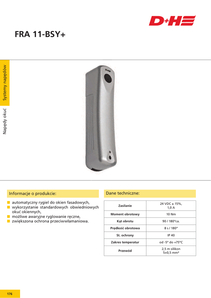 Napędy okuć Systemy napędów FRA 11-BSY+ Informacje o produkcie: automatyczny rygiel do okien fasadowych, wykorzystanie standardowych obwiedniowych okuć okiennych, możliwe awaryjne ryglowanie ręczne, zwiększona ochrona przeciwwłamaniowa. 176 Dane techniczne: Zasilanie 24 VDC ± 15%, 1,0 A Moment obrotowy 10 Nm Kąt obrotu 90 / 180ºca. Prędkość obrotowa 8 s / 180º St. ochrony IP 40 Zakres temperatur od -5º do +75ºC Przewód 2,5 m silikon 5×0,5 mm² Napędy okuć Systemy napędów Przykład zastosowania: Parametry: – do montażu na standardowych mechanizmach okiennych z rozstawem otworów 43 mm i kwadratowym trzpieniem o wymiarach 7 mm, – niskie zużycie prądu, – sygnalizacja położenia mechanizmu blokady, – dioda LED sygnalizująca stan napędu, – zwiększona ochrona przed włamaniami i wpływem warunków atmosferycznych, – mogą współpracować ze wszystkimi napędami firmy D+H, wykonanymi w technologii BSY+, – współpraca z innymi napędami D+H przy użyciu opcji -BRV (nie jest ona konieczna dla napędów VCD 22 lub CDC 200), – w jednym oknie można użyć maksymalnie cztery FRA 11-BSY+, – bezpośrednia transmisja poleceń i informacji poprzez magistralę BSY+, – możliwość ukrycia kabli w skrzydle okiennym, – możliwość zamówienia dowolnego koloru, również spoza palety RAL. Typ Nr art. Waga [kg] Uwagi FRA 11-BSY+ 24.000.11 0,75 Obudowa srebrna (~RAL 9006) 177