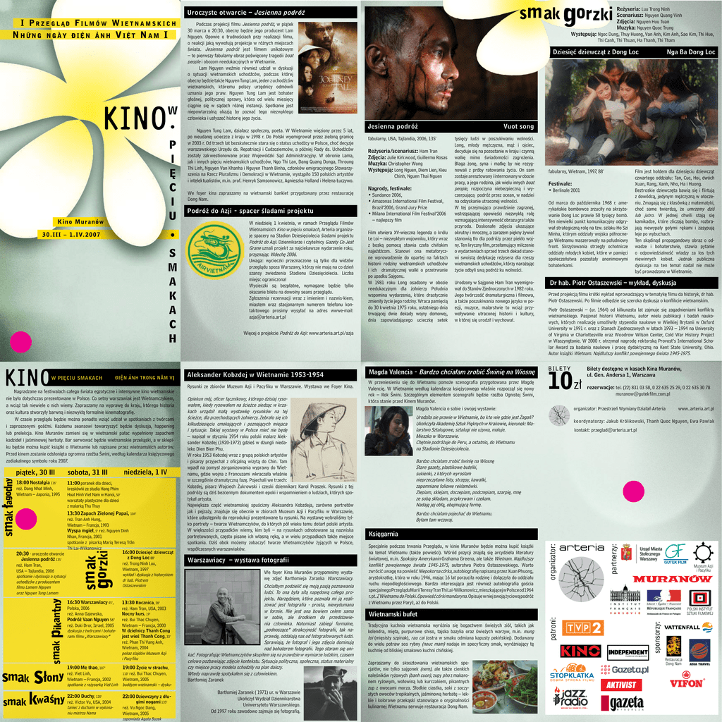 Re˝yseria: Luu Trong Ninh Scenariusz: Nguyen Quang Vinh Zdj´cia: Nguyen Huu Tuan Muzyka: Nguyen Quoc Trung Wyst´pujà: Ngoc Dung, Thuy Huong, Van Anh, Kim Anh, Sao Kim, Thi Hue, Thi Canh, Thi Thuan, Ha Thanh, Thi Tham Uroczyste ot warcie – Jesienna podró˝ Podczas projekcji filmu Jesienna podró˝, w piàtek 30 marca o 20:30, obecny b´dzie jego producent Lam Nguyen. Opowie o trudnoÊciach przy realizacji filmu, o reakcji jakà wywołujà projekcje w ró˝nych miejscach Êwiata. Jesienna podró˝ jest filmem unikatowym – to pierwszy fabularny obraz poÊwi´cony tragedii boat people i obozom reedukacyjnych w Wietnamie. Lam Nguyen weêmie równie˝ udział w dyskusji o sytuacji wietnamskich uchodêców, podczas której obecny b´dzie tak˝e Nguyen Tung Lam, jeden z uchodêców wietnamskich, któremu polscy urz´dnicy odmówili uznania jego praw. Nguyen Tung Lam jest bohater głoÊnej, politycznej sprawy, która od wielu miesi´cy ciàgnie si´ w sàdach ró˝nej instancji. Spotkanie jest niepowtarzalnà okazjà by poznaç tego niezwykłego człowieka i usłyszeç histori´ jego ˝ycia. Kino M u r a n ó w W niedziel´ 1 kwietnia, w ramach Przeglàdu Filmów Wietnamskich Kino w pi´ciu smakach, Arteria organizuje spacery na Stadion Dziesi´ciolecia Êladami projektu Podró˝ do Azji. Dziennikarze i czytelnicy Gazety Co Jest Grane uznali projekt za najciekawsze wydarzenie roku, przyznajàc Wdech´ 2006. Uwaga: wycieczki przeznaczone sà tylko dla widzów przeglàdu spoza Warszawy, którzy nie majà na co dzieƒ szansy zwiedzenia Stadionu Dziesi´ciolecia. Liczba miejsc ograniczona! Wycieczki sà bezpłatne, wymagane b´dzie tylko okazanie biletu na dowolny seans przeglàdu. Zgłoszenia rezerwacji wraz z imieniem i nazwis-kiem, miastem oraz stacjonarnym numerem telefonu kontaktowego prosimy wysyłaç na adres wwwe-mail: [email protected] 3 0 . I I I – 1 . I V. 2 0 0 7 Re˝yseria/scenariusz: Ham Tran Zdj´cia: Julie Kirkwood, Guillermo Rosas Muzyka: Christopher Wong Wyst´pujà: Long Nguen, Diem Lien, Kieu Chinh, Nguen Thai Nguen Nagrody, festiwale: • Sundance 2006, • Amazonas International Film Festival, Brazil’2006, Grand Jury Prize • Milano International Film Festival’2006 – najlepszy film Film otwiera XV-wieczna legenda o królu Le Loi – niezwykłym wojowniku, który wraz z boskà pomocà stawia czoła chiƒskim najeêdêcom. Stanowi ona metaforyczne wprowadzenie do opartej na faktach historii rodziny wietnamskich uchodêców i ich dramatycznej walki o przetrwanie po upadku Sajgonu. W 1981 roku Long osadzony w obozie reedukacyjnym dla ˝ołnierzy Południa wspomina wydarzenia, które drastycznie zmieniły ˝ycie jego rodziny. Wraca pami´cià do 30 kwietnia 1975 roku, ostatniego dnia trwajàcej dwie dekady wojny domowej, dnia zapowiadajàcego ucieczk´ setek Vuot song tysi´cy ludzi w poszukiwaniu wolnoÊci. Long, młody m´˝czyzna, mà˝ i ojciec, decyduje si´ na pozostanie w kraju i czynnà walk´ mimo ÊwiadomoÊci zagro˝enia. Błaga ˝on´, syna i matk´ by nie rezygnowali z próby ratowania ˝ycia. On sam zostaje aresztowany i internowany w obozie pracy, a jego rodzina, jak wielu innych boat people, rozpoczyna niebezpiecznà i wyczerpujàcà podró˝ przez ocean, w nadziei na odzyskanie utraconej wolnoÊci. W tej przejmujàco prawdziwie zagranej, wstrzàsajàcej opowieÊci niezwykłà rol´ wzmagajàcà intensywnoÊç obrazu gra tak˝e przyroda. Doskonałe zdj´cia ukazujàce okrutny i mroczny, a zarazem pi´kny ˝ywioł stanowià tło dla podró˝y przez piekło wojny. Ten liryczny film, przełamujàcy milczenie o wydarzeniach sprzed trzech dekad stanowi swoistà dedykacj´ re˝ysera dla rzeszy wietnamskich uchodêców, którzy nara˝ajàc ˝ycie odbyli swà podró˝ ku wolnoÊci. Urodzony w Sajgonie Ham Tran wyemigrował do Stanów Zjednoczonych w 1982 roku. Jego twórczoÊç dramaturgiczna i filmowa, a tak˝e poszukiwania nowego j´zyka w poezji, muzyce, malarstwie to wcià˝ przywoływanie utraconej historii i kultury, w której si´ urodził i wychował. Wi´cej o projekcie Podró˝ do Azji: www.arteria.art.pl/azja Aleksander Kobzdej w Wietnamie 1953-1954 w pi¢ciu smakach Nagradzane na festiwalach całego Êwiata egzotyczne i intensywne kino wietnamskie nie było dotychczas prezentowane w Polsce. Co setny warszawiak jest Wietnamczykiem, a wcià˝ tak niewiele o nich wiemy. Zapraszamy na wypraw´ do kraju, którego historia oraz kultura stworzyły barwnà i niezwykłà formalnie kinematografi´. W czasie przeglàdu b´dzie mo˝na ponadto wziàç udział w spotkaniach z twórcami i zaproszonymi goÊçmi. Ka˝demu seansowi towarzyszyç b´dzie dyskusja, happening lub prelekcja. Kino Muranów zamieni si´ w wietnamski pałac wypełniony zapachem kadzideł i jaÊminowej herbaty. Bar serwowaç b´dzie wietnamskie przekàski, a w sklepiku b´dzie mo˝na kupiç ksià˝ki o Wietnamie lub napisane przez wietnamskich autorów. Przed kinem zostanie odsłoni´ta ogromna rzeêba Âwini, według kalendarza ksi´˝ycowego zodiakalnego symbolu roku 2007. sobota, 31 III 18:00 Nostalgia 116’ re˝. Dang Nhat Minh, Wietnam – Japonia, 1995 11:00 poranek dla dzieci, kreskówki ze studia Hang Phim Hoat Hinh Viet Nam w Hanoi, 50’ warsztaty plastyczne dla dzieci z malarkà Thu Thuy smak gorzki piàtek, 30 III niedziela, 1 IV smak gorzki 13:30 Z apach Zielonej Papai, 104’ re˝. Tran Anh Hung, Wietnam – Francja, 1993 Wyspa mgieł, 5’ re˝. Nguyen Dinh Nhan, Francja, 2001 spotkanie z pisarkà Marià Teresà Trân Thi Lai-Wilkanowicz 16:00D ziesi´ç dziewczàt 20:30 - uroczyste otwarcie z Dong Loc 88’ Jesienna podró˝ 135’ re˝. Trong Ninh Luu, re˝. Ham Tran, Wietnam, 1997 USA – Tajlandia, 2006 wyk∏ad i dyskusja z historykiem dr hab. Piotrem Ostaszewskim spotkanie i dyskusja o sytuacji uchodêców z producentem filmu Lamem Nguyen oraz Nguyen Tung Lamem 16:30 Warszawiacy 45’, Polska, 2006 re˝. Anna Gajewska, Podró˝ Vaan Nguyen 56’ re˝. Duki Dror, Izrae