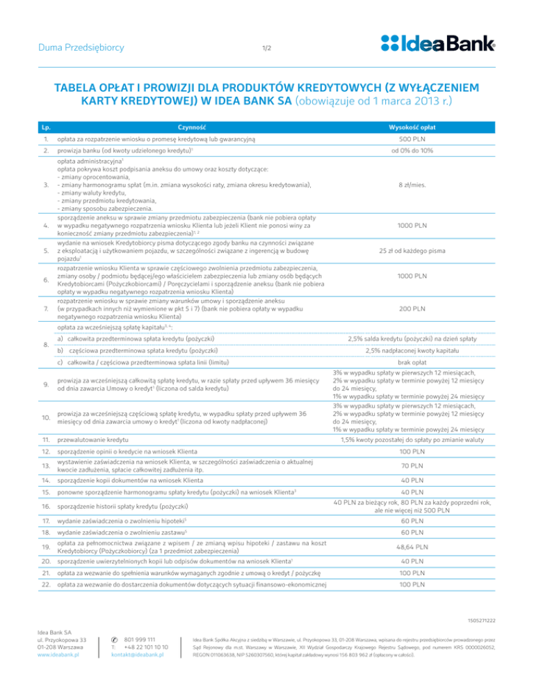 Duma Przedsiębiorcy 1/2 TABELA OPŁAT I PROWIZJI DLA PRODUKTÓW KREDYTOWYCH (Z WYŁĄCZENIEM KARTY KREDYTOWEJ) W IDEA BANK SA (obowiązuje od 1 marca 2013 r.) Lp. Czynność 1. opłata za rozpatrzenie wniosku o promesę kredytową lub gwarancyjną 2. prowizja banku (od kwoty udzielonego kredytu) 3. 4. 5. 6. 7. Wysokość opłat 500 PLN od 0% do 10% 1 opłata administracyjna1 opłata pokrywa koszt podpisania aneksu do umowy oraz koszty dotyczące: - zmiany oprocentowania, - zmiany harmonogramu spłat (m.in. zmiana wysokości raty, zmiana okresu kredytowania), - zmiany waluty kredytu, - zmiany przedmiotu kredytowania, - zmiany sposobu zabezpieczenia. sporządzenie aneksu w sprawie zmiany przedmiotu zabezpieczenia (bank nie pobiera opłaty w wypadku negatywnego rozpatrzenia wniosku Klienta lub jeżeli Klient nie ponosi winy za konieczność zmiany przedmiotu zabezpieczenia)1, 2 wydanie na wniosek Kredytobiorcy pisma dotyczącego zgody banku na czynności związane z eksploatacją i użytkowaniem pojazdu, w szczególności związane z ingerencją w budowę pojazdu1 rozpatrzenie wniosku Klienta w sprawie częściowego zwolnienia przedmiotu zabezpieczenia, zmiany osoby / podmiotu będącej/ego właścicielem zabezpieczenia lub zmiany osób będących Kredytobiorcami (Pożyczkobiorcami) / Poręczycielami i sporządzenie aneksu (bank nie pobiera opłaty w wypadku negatywnego rozpatrzenia wniosku Klienta) rozpatrzenie wniosku w sprawie zmiany warunków umowy i sporządzenie aneksu (w przypadkach innych niż wymienione w pkt 5 i 7) (bank nie pobiera opłaty w wypadku negatywnego rozpatrzenia wniosku Klienta) 8 zł/mies. 1000 PLN 25 zł od każdego pisma 1000 PLN 200 PLN opłata za wcześniejszą spłatę kapitału3, 4: 8. a) całkowita przedterminowa spłata kredytu (pożyczki) 2,5% salda kredytu (pożyczki) na dzień spłaty b) częściowa przedterminowa spłata kredytu (pożyczki) 2,5% nadpłaconej kwoty kapitału c) całkowita / częściowa przedterminowa spłata linii (limitu) brak opłat 9. prowizja za wcześniejszą całkowitą spłatę kredytu, w razie spłaty przed upływem 36 miesięcy od dnia zawarcia Umowy o kredyt1 (liczona od salda kredytu) 10. prowizja za wcześniejszą częściową spłatę kredytu, w wypadku spłaty przed upływem 36 miesięcy od dnia zawarcia umowy o kredyt1 (liczona od kwoty nadpłaconej) 11. przewalutowanie kredytu 1,5% kwoty pozostałej do spłaty po zmianie waluty 12. sporządzenie opinii o kredycie na wniosek Klienta 13. 100 PLN wystawienie zaświadczenia na wniosek Klienta, w szczególności zaświadczenia o aktualnej kwocie zadłużenia, spłacie całkowitej zadłużenia itp. 14. sporządzenie kopii dokumentów na wniosek Klienta 15. 70 PLN 40 PLN ponowne sporządzenie harmonogramu spłaty kredytu (pożyczki) na wniosek Klienta 3 40 PLN 40 PLN za bieżący rok, 80 PLN za każdy poprzedni rok, ale nie więcej niż 500 PLN 16. sporządzenie historii spłaty kredytu (pożyczki) 17. 3% w wypadku spłaty w pierwszych 12 miesiącach, 2% w wypadku spłaty w terminie powyżej 12 miesięcy do 24 miesięcy, 1% w wypadku spłaty w terminie powyżej 24 miesięcy 3% w wypadku spłaty w pierwszych 12 miesiącach, 2% w wypadku spłaty w terminie powyżej 12 miesięcy do 24 miesięcy, 1% w wypadku spłaty w terminie powyżej 24 miesięcy wydanie zaświadczenia o zwolnieniu hipoteki5 60 PLN 18. wydanie zaświadczenia o zwolnieniu zastawu5 60 PLN opłata za pełnomocnictwa związane z wpisem / ze zmianą wpisu hipoteki / zastawu na koszt 19. Kredytobiorcy (Pożyczkobiorcy) (za 1 przedmiot zabezpieczenia) 48,64 PLN 20. sporządzenie uwierzytelnionych kopii lub odpisów dokumentów na wniosek Klienta 40 PLN 21. 100 PLN 1 opłata za wezwanie do spełnienia warunków wymaganych zgodnie z umową o kredyt / pożyczkę 22. opłata za wezwanie do dostarczenia dokumentów dotyczących sytuacji finansowo-ekonomicznej 100 PLN 1505271222 Idea Bank SA ul. Przyokopowa 33 01-208 Warszawa www.ideabank.pl 801 999 111 +48 22 101 10 10 [email protected] T: Idea Bank Spółka Akcyjna z siedzibą w Warszawie, ul. Przyokopowa 33, 01-208 Warszawa, wpisana do rejestru przedsiębiorców prowadzonego przez Sąd Rejonowy dla m.st. Warszawy w Warszawie, XII Wydział Gospodarczy Krajowego Rejestru Sądowego, pod numerem KRS 0000026052, REGON 011063638, NIP 5260307560, której kapitał zakładowy wynosi 156 803 962 zł (opłacony w całości). Duma Przedsiębiorcy 2/2 23. opłata za zmianę waluty, w której spłacany jest kredyt / pożyczka 24. inspekcja nieruchomości przed wypłatą transzy kredytu 300 PLN 25. opłata za monitoring, inspekcja realizacji inwestycji deweloperskiej3 26. opłata za monitoring zabezpieczeń kredytu / pożyczki 27. 0,8% salda kredytu (pożyczki) z dnia sporządzenia aneksu dot. ww. zmiany (pobierane w PLN po przeliczeniu salda wg średniego kursu NBP z dnia sporządzenia aneksu) nie więcej niż 4000,00 PLN nie więcej niż 500,00 PLN opłata za monitoring Kredytobiorcy nie więcej niż 500,00 PLN 28. opłaty za podwyższone ryzyko z tytułu udzielenia kredytu z niskim wkładem własnym 29. opłata z tytułu podwyższonego ryzyka do czasu ustanowienia hipoteki 1,99% podstawy wyliczenia opłaty (podstawa wyliczenia opłaty = = kwota kredytu w PLN – 80% wartości nieruchomości stanowiącej przedmiot zabezpieczenia kredytu) 0,166% miesięcznie od salda kredytu (pożyczki) z ostatniego dnia miesiąca Czynności restrukturyzacyjne i windykacyjne: opłata za: 30. 31. a) monit telefoniczny 4, 5 4,99 PLN b) monit e-mailem 4, 5 4,99 PLN c) monit SMS-em 1,99 PLN 4, 5 wezwanie do zapłaty 5 30 PLN 32. ostateczne wezwanie do zapłaty 70 PLN porozumienie się stron w zakresie kontynuacji umowy (odwołanie wypowiedzenia umowy) na 33. wniosek Klienta 50 PLN 34. rozpatrzenie wniosku o restrukturyzację 200 zł 35. sporządzenie umowy o ugodę, porozumienia spłaty zadłużenia 36. sporządzenie aneksu do umowy ugody 37. 6 1,5% wartości należności 1,5% wartości należności 6 opłat