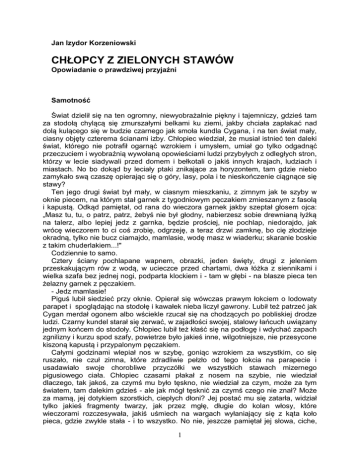 Jan Izydor Korzeniowski CHŁOPCY Z ZIELONYCH STAWÓW Opowiadanie o prawdziwej przyjaźni Samotność Świat dzielił się na ten ogromny, niewyobrażalnie piękny i tajemniczy, gdzieś tam za stodołą chylącą się zmurszałymi belkami ku ziemi, jakby chciała zapłakać nad dolą kulącego się w budzie czarnego jak smoła kundla Cygana, i na ten świat mały, ciasny objęty czterema ścianami izby. Chłopiec wiedział, że musiał istnieć ten daleki świat, którego nie potrafił ogarnąć wzrokiem i umysłem, umiał go tylko odgadnąć przeczuciem i wyobraźnią wywołaną opowieściami ludzi przybyłych z odległych stron, którzy w lecie siadywali przed domem i bełkotali o jakiś innych krajach, ludziach i miastach. No bo dokąd by leciały ptaki znikające za horyzontem, tam gdzie niebo zamykało swą czaszę opierając się o góry, lasy, pola i te nieskończenie ciągnące się stawy? Ten jego drugi świat był mały, w ciasnym mieszkaniu, z zimnym jak te szyby w oknie piecem, na którym stał garnek z tygodniowym pęczakiem zmieszanym z fasolą i kapustą. Odkąd pamiętał, od rana do wieczora garnek jakby szeptał głosem ojca: „Masz tu, tu, o patrz, patrz, żebyś nie był głodny, nabierzesz sobie drewnianą łyżką na talerz, albo lepiej jedz z garnka, będzie prościej, nie pochlap, niedorajdo, jak wrócę wieczorem to ci coś zrobię, odgrzeję, a teraz drzwi zamknę, bo cię złodzieje okradną, tylko nie bucz ciamajdo, mamlasie, wodę masz w wiaderku; skaranie boskie z takim chuderlakiem...!" Codziennie to samo. Cztery ściany pochlapane wapnem, obrazki, jeden święty, drugi z jeleniem przeskakującym rów z wodą, w ucieczce przed chartami, dwa łóżka z siennikami i wielka szafa bez jednej nogi, podparta klockiem i - tam w głębi - na blasze pieca ten żelazny garnek z pęczakiem. - Jedz mamlasie! Piguś lubił siedzieć przy oknie. Opierał się wówczas prawym łokciem o lodowaty parapet i spoglądając na stodołę i kawałek nieba liczył gawrony. Lubił też patrzeć jak Cygan merdał ogonem albo wściekle rzucał się na chodzących po pobliskiej drodze ludzi. Czarny kundel starał się zerwać, w zajadłości swojej, stalowy łańcuch uwiązany jednym końcem do stodoły. Chłopiec lubił też kłaść się na podłogę i wdychać zapach zgnilizny i kurzu spod szafy, powietrze było jakieś inne, wilgotniejsze, nie przesycone kiszoną kapustą i przypalonym pęczakiem. Całymi godzinami wlepiał nos w szybę, goniąc wzrokiem za wszystkim, co się ruszało, nie czuł zimna, które zdradliwie pełzło od tego łokcia na parapecie i usadawiało swoje chorobliwe przyczółki we wszystkich stawach mizernego pigusiowego ciała. Chłopiec czasami płakał z nosem na szybie, nie wiedział dlaczego, tak jakoś, za czymś mu było tęskno, nie wiedział za czym, może za tym światem, tam dalekim gdzieś - ale jak mógł tęsknić za czymś czego nie znał? Może za mamą, jej dotykiem szorstkich, ciepłych dłoni? Jej postać mu się zatarła, widział tylko jakieś fragmenty twarzy, jak przez mgłę, długie do kolan włosy, które wieczorami rozczesywała, jakiś uśmiech na wargach wyłaniający się z kąta koło pieca, gdzie zwykle stała - i to wszystko. No nie, jeszcze pamiętał jej słowa, ciche, 1 łagodne, żałosne, jakby, ułożone z tych łez kapiących z jej rzęs: -„Synku mój, jak biedne jest nasze życie...” W takich chwilach kreślił na szybie jej twarz, nie taką jaką była, lecz wyszukaną ze swojej zagubionej pamięci, z wyobraźni, z myśli. Rysował też różne wzory, zwierzęta, domy i ludzi, a czasem i kwiaty; zamazywał je dłonią i rysował znów nowe chuchając na szyby. Kiedy nic się nie działo na tym świecie za oknem, lub kiedy znużony wpatrywaniem się w belki stodoły, którą opuściły nawet wróble - schodził z zydla i kuśtykał do żelaznego garnka, który - jak wydawało się chłopcu - wołał: - „Zjedz mamlasie, ciamajdo, nie widzisz drewnianej łyżki? To co, że zimne, ale zdrowe, bierz się do roboty chuderlaku, chuderlaku..." Więc Piguś łapał się za łyżkę, nabierał duże porcje gęstej potrawy i wkładał do ust, popijając wodą. Wkrótce brzuch mu spęczniał, jak nadymany balon. Od czasu, kiedy mama umarła życie Pigusia zamknęło się w tych czterech ścianach przesiąkniętych zapachem kapusty i pęczaku. Ojciec wychodził wcześnie rano do pracy mówiąc to swoje niezmienne: „Masz tu, tu, żebyś nie był głodny, jedz z garnka, nie bucz! Wyjdziesz na pole, jak wrócę..." Bywało, że nie wracał prędko, więc Piguś kładł się do spania i tak zastawał go ojciec. Siedząc przy oknie, z tym łokciem wetkniętym w parapet, patrzył na skrawek zmieniającego się w barwach i kształcie - w zależności od pogody i wyzierającego (lub nie) słońca - nieba, i marzył. Wydawało mu się, że umie latać i ściga się z ptakami śmigającymi przez widoczny skrawek nieba, chwytał je za ogony i krzyczał: „Macie tu, jedzcie, to dobry pęczak, bierzcie wszystko, mnie się już przejadło, jedzcie darmozjady, mamlasy, niedorajdy!” W takich chwilach śmiał się i krzyczał do siebie i czuł się szczęśliwy. Czasem opierał głowę o framugę okna i zasypiał. Oczy miał zapadnięte głęboko, wokół sine cienie, w płucach coś świszczało, rzęziło, a mimo to uśmiechał się radośnie, zwłaszcza kiedy wydawało mu się, że jest wśród śmigających letnich jaskółek, lub zimowych gawronów, i unosił się nad drzewami, domami; lotem swoim dotykał lustra wody pobliskich stawów. Było mu wtedy tak dobrze, lekko, że nie czuł swojego obolałego ciała. Długo jeszcze po przebudzeniu szczeknięciem Cygana, lub krzykiem gospodyni, właścicielki domu, w którym wynajmowali izbę, przeżywał te chwile chcąc wywołać znów ten stan lewitacji, lecz próżne były jego wysiłki. Ani sen nie wracał, ani nie potrafił wznieść się nawet nad ten zimny parapet. Były chwile,