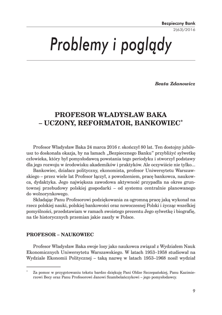 Bezpieczny Bank 2(63)/2016 Problemy i poglÈdy Beata Zdanowicz PROFESOR WADYSAW BAKA – UCZONY, REFORMATOR, BANKOWIEC* Profesor Wïadysïaw Baka 24 marca 2016 r. skoñczyï 80 lat. Ten dostojny jubileusz to doskonaïa okazja, by na ïamach „Bezpiecznego Banku” przybliĝyÊ sylwetkÚ czïowieka, który byï pomysïodawcÈ powstania tego periodyku i stworzyï podstawy dla jego rozwoju w Ărodowisku akademików i praktyków. Ale oczywiĂcie nie tylko... Bankowiec, dziaïacz polityczny, ekonomista, profesor Uniwersytetu Warszawskiego – przez wiele lat Profesor ïÈczyï, z powodzeniem, pracÚ bankowca, naukowca, dydaktyka. Jego najwiÚksza zawodowa aktywnoĂÊ przypadïa na okres gruntownej przebudowy polskiej gospodarki – od systemu centralnie planowanego dobwolnorynkowego. SkïadajÈc Panu Profesorowi podziÚkowania za ogromnÈ pracÚ jakÈ wykonaï na rzecz polskiej nauki, polskiej bankowoĂci oraz nowoczesnej Polski i ĝyczÈc wszelkiej pomyĂlnoĂci, przedstawiam w ramach swoistego prezentu Jego sylwetkÚ i biografiÚ, na tle historycznych przemian jakie zaszïy w Polsce. PROFESOR – NAUKOWIEC Profesor Wïadysïaw Baka swoje losy jako naukowca zwiÈzaï z Wydziaïem Nauk Ekonomicznych Uniwersytetu Warszawskiego. W latach 1953–1958 studiowaï na Wydziale Ekonomii Politycznej – takÈ nazwÚ w latach 1953–1968 nosiï wydziaï * Za pomoc w przygotowaniu tekstu bardzo dziÚkujÚ Pani Oldze Szczepañskiej, Panu Kazimierzowi Becy oraz Panu Profesorowi Janowi Szambelañczykowi – jego pomysïodawcy. 9 Bezpieczny Bank 2(63)/2016 Uniwersytetu ksztaïcÈcy w dziedzinie ekonomii. W czerwcu 1958 roku Profesor Baka uzyskaï tytuï magistra ekonomii i zostaï zatrudniony jako pracownik naukowy – najpierw na stanowisku asystenta, potem starszego asystenta. Wb1966broku zostaï doktorem nauk ekonomicznych po obronie rozprawy przygotowanej pod kierunkiem wybitnego polskiego ekonomisty prof. dr. Czesïawa Bobrowskiego ibawansowaï na stanowisko adiunkta. Wydziaï Ekonomii Politycznej zostaï w 1968 roku przeksztaïcony w Instytut Nauk Spoïecznych i wïÈczony do nowo utworzonego Wydziaïu Nauk Spoïecznych UW. Tak funkcjonowaï do wrzeĂnia 1977 roku. W tym czasie – w 1971 roku – Profesor Baka uzyskaï tytuï doktora habilitowanego nauk ekonomicznych i objÈï stanowisko docenta. W 1977 roku zostaï mianowany profesorem nadzwyczajnym. W 1977 roku w miejsce Instytutu utworzony zostaï, funkcjonujÈcy do dziĂ, Wydziaï Nauk Ekonomicznych. PoczÈtkowo Profesor Baka pracowaï w Zakïadzie Planowania i Polityki Gospodarczej. Póěniej zwiÈzany byï przez wiele lat z KatedrÈ BankowoĂci i Finansów (kierowaï niÈ prof. dr hab. Witold Koziñski), która powstaïa w 1992 roku. Ukoronowaniem kariery naukowej Jubilata byïo nadanie mu w lutym 1989 roku tytuïu profesora zwyczajnego. Warto wspomnieÊ, ĝe praca na Uniwersytecie Warszawskim to nie jedyna aktywnoĂÊ dydaktyczna Jubilata. Od stycznia 2000 roku pracowaï równieĝ jako Profesor Akademii Leona Koěmiñskiego. Profesor Baka uczestniczyï takĝe w wielu radach naukowych. Przykïadowo, od 1992 roku byï PrzewodniczÈcym Rady Naukowo-Programowej MiÚdzynarodowej Szkoïy BankowoĂci i Finansów w Katowicach. Ksztaïcenie kadr byïo dla Pana Profesora zawsze niezwykle istotne. Jeszcze jako Prezes NBP zabiegaï, by czÚĂÊ majÈtku PZPR przeznaczyÊ na utworzenie tej wïaĂnie szkoïy w Katowicach. Byïa ona wspólnym przedsiÚwziÚciem NBP, kilku najwiÚkszych polskich banków oraz bankowców z Francji, z którymi Pan Profesor – bardzo dobrze zresztÈ mówiÈcy po francusku – miaï dobre kontakty. Od 2001 roku byï Czïonkiem Rady Strategii Spoïeczno-Gospodarczej przy Prezesie Rady Ministrów, a od 2001 roku byï czïonkiem Komitetu Nauk Ekonomicznych Polskiej Akademii Nauk. PROFESOR – REFORMATOR DziaïalnoĂÊ publiczna Profesora Baki przypadïa na czas przemian ustrojowych i transformacji gospodarczej Polski. W latach 1980–1990 Profesor byï bezpoĂrednio zaangaĝowany w przygotowanie koncepcji, a nastÚpnie realizacjÚ reformy gospodarczej oraz rynkowej przebudowy polskiej bankowoĂci. Uczestniczyï w rozmowach OkrÈgïego Stoïu jako specjalista polityki spoïeczno-gospodarczej i reform systemowych. Naleĝy zauwaĝyÊ, ĝe Polska byïa w procesie tych zmian prekursorem i nie 10 Problemy i poglÈdy moĝna byïo – jak to jest obecnie powszechne – powoïywaÊ siÚ na doĂwiadczenia innych krajów. Dlatego waĝna byïa kreatywnoĂÊ w tworzeniu i wdraĝaniu nowatorskich reform. Pomysïy musiaïy byÊ oryginalne, a ich skutecznoĂci nie daïo siÚ przetestowaÊ w teoretycznych modelach gospodarki. Tym wiÚkszy szacunek i uznanie naleĝy siÚ za ówczesnÈ odwagÚ w ich formuïowaniu i konsekwencjÚ w dziaïaniu. Przemiany zapoczÈtkowane w latach 80. podzieliïy polskich ekonomistów na trzy gïówne nurty: zachowawczy, reformistyczny i negujÈcy zasadnoĂÊ systemu centralnego planowania. W tym okresie na Wydziale Nauk Ekonomicznych przewaĝaï nurt reformistyczny, do którego bez wÈtpienia naleĝaï Wïadysïaw Baka – obok Aleksandra ukaszewicza czy Zdzisïawa Sadowskiego. Byï nie tylko inicjatorem, ale takĝe dziaïaï aktywnie na rzecz przygotowania reform polskiego systemu gospodarczego. Jak wspomina Profesor Jacek Kochanowicz – wieloletni pracownik Wydziaïu Nauk Ekonomicznych UW – Profesor Baka to jedna z tych osób, które potrafiïy odgrywaÊ pozytywnÈ rolÚ przed, jak i po transformacji ustrojowej. Co wiÚcej, to czïowiek, który w ramach politycznych ograniczeñ kierowaï siÚ ekonomicznÈ racjonalnoĂciÈ1 i dla którego interes publiczny byï nadrzÚdny2. Proces przemian w gospodarce i w bankowoĂci polskiej nie byïby moĝliwy bez zaangaĝowania i twórczego wkïadu Profesora Baki, który na dïugo przed zainicjowaniem znanego na Ăwiecie Planu Balcerowicza dziaïaï w kierunku urynkowienia polskiej gospodarki. Juĝ na poczÈtku lat 80. Profesor wspóïtworzyï koncepcjÚ reformy gospodarczej. Je