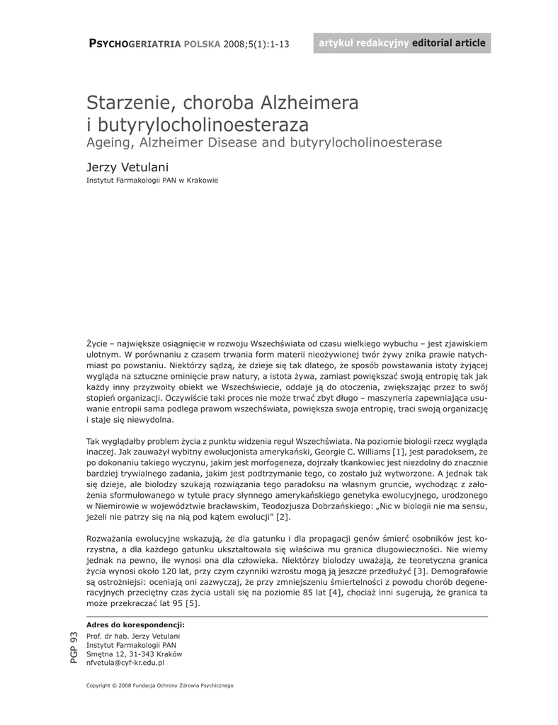 PSYCHOGERIATRIA POLSKA 2008;5(1):1-13 artykuł redakcyjny editorial article Starzenie, choroba Alzheimera i butyrylocholinoesteraza Ageing, Alzheimer Disease and butyrylocholinoesterase Jerzy Vetulani Instytut Farmakologii PAN w Krakowie Życie – największe osiągnięcie w rozwoju Wszechświata od czasu wielkiego wybuchu – jest zjawiskiem ulotnym. W porównaniu z czasem trwania form materii nieożywionej twór żywy znika prawie natychmiast po powstaniu. Niektórzy sądzą, że dzieje się tak dlatego, że sposób powstawania istoty żyjącej wygląda na sztuczne ominięcie praw natury, a istota żywa, zamiast powiększać swoją entropię tak jak każdy inny przyzwoity obiekt we Wszechświecie, oddaje ją do otoczenia, zwiększając przez to swój stopień organizacji. Oczywiście taki proces nie może trwać zbyt długo – maszyneria zapewniająca usuwanie entropii sama podlega prawom wszechświata, powiększa swoja entropię, traci swoją organizację i staje się niewydolna. Tak wyglądałby problem życia z punktu widzenia reguł Wszechświata. Na poziomie biologii rzecz wygląda inaczej. Jak zauważył wybitny ewolucjonista amerykański, Georgie C. Williams [1], jest paradoksem, że po dokonaniu takiego wyczynu, jakim jest morfogeneza, dojrzały tkankowiec jest niezdolny do znacznie bardziej trywialnego zadania, jakim jest podtrzymanie tego, co zostało już wytworzone. A jednak tak się dzieje, ale biolodzy szukają rozwiązania tego paradoksu na własnym gruncie, wychodząc z założenia sformułowanego w tytule pracy słynnego amerykańskiego genetyka ewolucyjnego, urodzonego w Niemirowie w województwie bracławskim, Teodozjusza Dobrzańskiego: „Nic w biologii nie ma sensu, jeżeli nie patrzy się na nią pod kątem ewolucji” [2]. Rozważania ewolucyjne wskazują, że dla gatunku i dla propagacji genów śmierć osobników jest korzystna, a dla każdego gatunku ukształtowała się właściwa mu granica długowieczności. Nie wiemy jednak na pewno, ile wynosi ona dla człowieka. Niektórzy biolodzy uważają, że teoretyczna granica życia wynosi około 120 lat, przy czym czynniki wzrostu mogą ją jeszcze przedłużyć [3]. Demografowie są ostrożniejsi: oceniają oni zazwyczaj, że przy zmniejszeniu śmiertelności z powodu chorób degeneracyjnych przeciętny czas życia ustali się na poziomie 85 lat [4], chociaż inni sugerują, że granica ta może przekraczać lat 95 [5]. PGP 93 Adres do korespondencji: Prof. dr hab. Jerzy Vetulani Instytut Farmakologii PAN Smętna 12, 31-343 Kraków [email protected] Copyright © 2008 Fundacja Ochrony Zdrowia Psychicznego 2 Jerzy Vetulani: Starzenie, choroba Alzheimera i butyrylocholinoesteraza Te rozbieżności wskazują, że długość życia jest skracana przez zjawisko starości. Starość, postępujące uszkodzenie funkcjonowania organizmu, kończące się ogólną niesprawnością i niezdolnością do życia, nie jest zjawiskiem uniwersalnym: nie starzeją się fizycznie płazy, takie jak kumaki [6,7], gady, jak żółwie [8], czy wielkie ptaki, jak kondory [9]. Natomiast starzenie, z niewiadomych powodów, zaczęło wykształcać się u prymitywnych ssaków [9]. W dalszym biegu ewolucji trend ten nieco się odwrócił i duże ssaki, takie jak słonie, żyją długo. Również długo żyją ludzie. Jednak po osiągnięciu szczytu naszych możliwości reprodukcyjnych natura zaczyna programować nas dla śmierci. Przejawia się to jasno w znacznym spadku funkcji odpornościowych [11, 12] i zwiększonej produkcji glikokortykoidów i cytokin, wpływających negatywnie na metabolizm, gęstość kości, siłę mięśni, wytrzymałość na wysiłek, funkcje poznawcze i nastrój [11-17]. Starość w przyrodzie nie uwidacznia się, ponieważ osłabienie funkcji życiowych powoduje, że łatwiej stajemy się ofiarą drapieżników, pasożytów lub nieszczęśliwych wypadków, ale starzenie występuje, gdyż jego postęp wyznacza spadek sprawności zwiększający szanse na skrócenie życia do optymalnej – z punktu widzenia ewolucji – długości [18]. Człowiek z dużym powodzeniem potrafi się chronić przed śmiercią powodowaną przez bakterie i wirusy, drapieżniki, klęski żywiołowe, nieszczęśliwe wypadki, a w wyniku rozwoju medycyny żyje często do późnej starości. Ten rozwój medycyny i higieny spowodował wzrost średniej długości życia. W ciągu ostatnich dwóch wieków średni czas życia ludzkiego wydłużył się trzykrotnie, a średnia długość życia w krajach kultury Zachodu, takich jak USA, wzrosła z około 50 do 73 (mężczyźni) i 78 (kobiety) lat w ciągu ostatniego stulecia [19]. Nowoczesna medycyna znacznie poprawiła nam większość okresu życia, ale skomplikowała jego zakończenie [20]. Znaczne zwiększenie długowieczności niesie za sobą poważne skutki negatywne: starość, która nie musi koniecznie być złą, oraz zgrzybiałość i otępienie, które są okropne. Starość uderza przede wszystkim w nasz układ motoryczny (artretyzm, osteoporoza), sprawność naszych zmysłów (ślepota, głuchota) oraz w nasz mózg. Starzenie się mózgu Wiele narządów obwodowych starzeje się i funkcjonuje coraz mniej sprawnie, ale szczególnie istotne są konsekwencje starzenia się mózgu, narządu kierującego całym organizmem. Związane z wiekiem zmiany mózgu widać w szeregu aspektach. Ogólny obraz starego mózgu charakteryzuje się zwężonymi zakrętami i poszerzonymi rowkami, zmniejszeniem masy, poszerzeniem komór i zanikami istoty białej. Zmniejsza się waga i objętość mózgu [21]. Zmiany morfologii neuronów polegają na spadku rozgałęzień dendrytów i zmniejszeniu liczby kolców synaptycznych, co prowadzi do zmniejszenia komunikacji miedzy neuronami. Zmiany biochemiczne są rozliczne: spada poziom istotnych dla funkcji neuronów białek, takich jak CREB, DARP-32,STAT3, HSC70, NeuroD, spada poziom neurohormonów, takich jak GH/IGF1, estradiol, testosteron, GR, neurosterydy, 