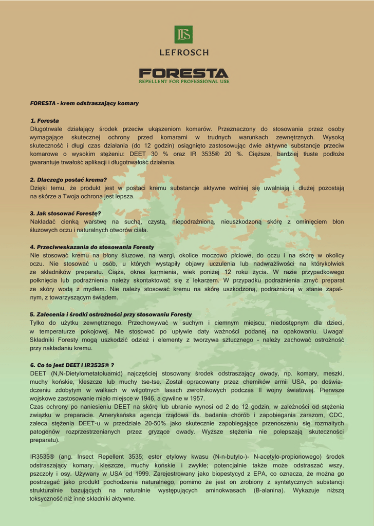 FORESTA - krem odstraszający komary 1. Foresta Długotrwale działający środek przeciw ukąszeniom komarów. Przeznaczony do stosowania przez osoby wymagające skutecznej ochrony przed komarami w trudnych warunkach zewnętrznych. Wysoką skuteczność i długi czas działania (do 12 godzin) osiągnięto zastosowując dwie aktywne substancje przeciw komarowe o wysokim stężeniu: DEET 30 % oraz IR 3535® 20 %. Cięższe, bardziej tłuste podłoże gwarantuje trwałość aplikacji i długotrwałość działania. 2. Dlaczego postać kremu? Dzięki temu, że produkt jest w postaci kremu substancje aktywne wolniej się uwalniają i dłużej pozostają na skórze a Twoja ochrona jest lepsza. 3. Jak stosować Forestę? Nakładać cienką warstwę na suchą, czystą, niepodrażnioną, nieuszkodzoną skórę z ominięciem błon śluzowych oczu i naturalnych otworów ciała. 4. Przeciwwskazania do stosowania Foresty Nie stosować kremu na błony śluzowe, na wargi, okolice moczowo płciowe, do oczu i na skórę w okolicy oczu. Nie stosować u osób, u których wystąpiły objawy uczulenia lub nadwrażliwości na którykolwiek ze składników preparatu. Ciąża, okres karmienia, wiek poniżej 12 roku życia. W razie przypadkowego połknięcia lub podrażnienia należy skontaktować się z lekarzem. W przypadku podrażnienia zmyć preparat ze skóry wodą z mydłem. Nie należy stosować kremu na skórę uszkodzoną, podrażnioną w stanie zapal nym, z towarzyszącym świądem. 5. Zalecenia i środki ostrożności przy stosowaniu Foresty Tylko do użytku zewnętrznego. Przechowywać w suchym i ciemnym miejscu, niedostępnym dla dzieci, w temperaturze pokojowej. Nie stosować po upływie daty ważności podanej na opakowaniu. Uwaga! Składniki Foresty mogą uszkodzić odzież i elementy z tworzywa sztucznego - należy zachować ostrożność przy nakładaniu kremu. 6. Co to jest DEET i IR3535® ? DEET (N,N-Dietylometatoluamid) najczęściej stosowany środek odstraszający owady, np. komary, meszki, muchy końskie, kleszcze lub muchy tse-tse. Został opracowany przez chemików armii USA, po doświa dczeniu zdobytym w walkach w wilgotnych lasach zwrotnikowych podczas II wojny światowej. Pierwsze wojskowe zastosowanie miało miejsce w 1946, a cywilne w 1957. Czas ochrony po naniesieniu DEET na skórę lub ubranie wynosi od 2 do 12 godzin, w zależności od stężenia związku w preparacie. Amerykańska agencja rządowa ds. badania chorób i zapobiegania zarazom, CDC, zaleca stężenia DEET-u w przedziale 20-50% jako skutecznie zapobiegające przenoszeniu się rozmaitych patogenów rozprzestrzenianych przez gryzące owady. Wyższe stężenia nie polepszają skuteczności preparatu). IR3535® (ang. Insect Repellent 3535; ester etylowy kwasu (N-n-butylo-)- N-acetylo-propionowego) środek odstraszający komary, kleszcze, muchy końskie i zwykłe; potencjalnie także może odstraszać wszy, pszczoły i osy. Używany w USA od 1999. Zarejestrowany jako biopestycyd z EPA, co oznacza, że można go postrzegać jako produkt pochodzenia naturalnego, pomimo że jest on zrobiony z syntetycznych substancji strukturalnie bazujących na naturalnie występujących aminokwasach (B-alanina). Wykazuje niższą toksyczność niż inne składniki aktywne. 7. Dlaczego połączyliśmy dwie substancje aktywne? Połączenie dwóch najczęściej stosowanych substancji odstraszających komary, stanowi o wyższej skute czności w porównaniu do produktów zawierających tylko jeden składnik aktywny. Postać produktu: krem. Stosowanie: Preparat odstraszający komary. Nakładać cienką warstwę na suchą, czystą skórę w miejsca, które są narażone na ukąszenie. W celu naniesienia na twarz należy najpierw rozsmarować krem w dłoniach a następnie lekko natrzeć skórę twarzy. W razie potrzeby czynność należy powtórzyć. Tylko do użytku zewnętrznego. Nie stosować u dzieci poniżej 12 roku życia. Nie nanosić na uszkodzoną lub podrażnioną skórę. Nie stosować kremu na błony śluzowe, na wargi, okolice moczowo płciowe, do oczu i na skórę w okolicy oczu. Nie stosować u osób, u których wystąpiły objawy uczulenia lub nadwrażliwości na którykolwiek ze składników preparatu. Xi - drażniący R36/38 Działa drażniąco na oczy i skórę S2 - chronić przed dziećmi, S25 - unikać zanieczyszczenia oczu, S26 - zanieczyszczone oczy przemyć natychmiast dużą ilością wody i zasięgnąć porady lekarza, S46 - w razie połknięcia natychmiast zasięgnij porady lekarza - pokaż opakowanie lub etykietę. Możliwe skutki uboczne dla zdrowia człowieka, wynikające z narażenia na działanie preparatu poprzez: Drogi oddechowe: Może wystąpić podrażnienie błony śluzowej dróg oddechowych. Kontakt ze skórą: Może powodować podrażnienie skóry. Kontakt z oczami: Może wystąpić podrażnienie i łzawienie. Drogi pokarmowe: Może wystąpić podrażnienie ust, przełyku i błon śluzowych przewodu pokarmowego. Pierwsza pomoc: W przypadku kontaktu ze skórą: Zdjąć zanieczyszczoną odzież. Umyć skórę wodą z mydłem. W przypadku trwałego podrażnienia skóry zwrócić się do lekarza. W przypadku kontaktu z oczami: Płukać oczy z otwartą powieką przez kilka minut dużą ilością wody. W przypadku trwałego podrażnienia zwrócić się do lekarza. W przypadku połknięcia: Nie powodować wymiotów. Natychmiast przepłukać jamę ustną i wypić dużą ilość wody. W przypadku wystąpienia dolegliwości zwrócić się do lekarza. Postępowanie z opakowaniem i odpadami opakowaniowymi po produkcie: Unikać zanieczyszczenia wody i gleby stężonym preparatem. Nie wylewać pozostałości do wód gruntowych, jezior, stawów, kolektorów kanalizacyjnych itp. Nie mieszać z odpadami komunalnymi. Utylizować zgodniez przepisami, konieczna jest obróbka fizyko-chemiczna. Opróżnić opakowanie z pozostałości preparatu. Opakowanie z LDPE, opróżnione należy poddać recyklingowi. Podmiot odpowiedzialny: