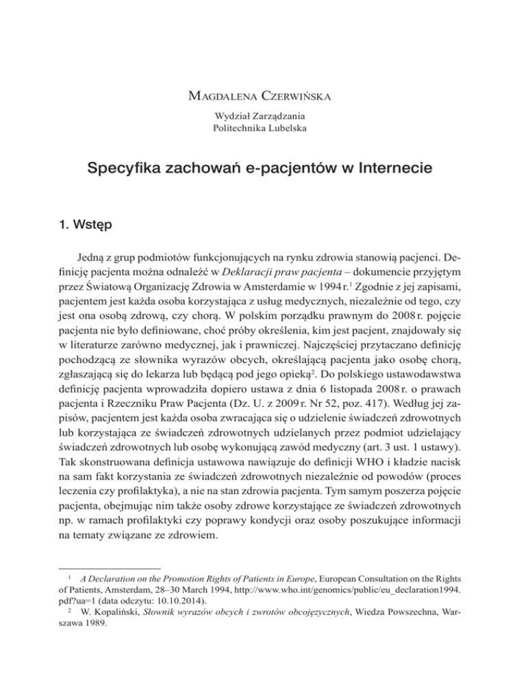 Magdalena Czerwińska Wydział Zarządzania Politechnika Lubelska Specyfika zachowań e-pacjentów w Internecie 1. Wstęp Jedną z grup podmiotów funkcjonujących na rynku zdrowia stanowią pacjenci. Definicję pacjenta można odnaleźć w Deklaracji praw pacjenta – dokumencie przyjętym przez Światową Organizację Zdrowia w Amsterdamie w 1994 r.1 Zgodnie z jej zapisami, pacjentem jest każda osoba korzystająca z usług medycznych, niezależnie od tego, czy jest ona osobą zdrową, czy chorą. W polskim porządku prawnym do 2008 r. pojęcie pacjenta nie było definiowane, choć próby określenia, kim jest pacjent, znajdowały się w literaturze zarówno medycznej, jak i prawniczej. Najczęściej przytaczano definicję pochodzącą ze słownika wyrazów obcych, określającą pacjenta jako osobę chorą, zgłaszającą się do lekarza lub będącą pod jego opieką2. Do polskiego ustawodawstwa definicję pacjenta wprowadziła dopiero ustawa z dnia 6 listopada 2008 r. o prawach pacjenta i Rzeczniku Praw Pacjenta (Dz. U. z 2009 r. Nr 52, poz. 417). Według jej zapisów, pacjentem jest każda osoba zwracająca się o udzielenie świadczeń zdrowotnych lub korzystająca ze świadczeń zdrowotnych udzielanych przez podmiot udzielający świadczeń zdrowotnych lub osobę wykonującą zawód medyczny (art. 3 ust. 1 ustawy). Tak skonstruowana definicja ustawowa nawiązuje do definicji WHO i kładzie nacisk na sam fakt korzystania ze świadczeń zdrowotnych niezależnie od powodów (proces leczenia czy profilaktyka), a nie na stan zdrowia pacjenta. Tym samym poszerza pojęcie pacjenta, obejmując nim także osoby zdrowe korzystające ze świadczeń zdrowotnych np. w ramach profilaktyki czy poprawy kondycji oraz osoby poszukujące informacji na tematy związane ze zdrowiem. A Declaration on the Promotion Rights of Patients in Europe, European Consultation on the Rights of Patients, Amsterdam, 28–30 March 1994, http://www.who.int/genomics/public/eu_declaration1994. pdf?ua=1 (data odczytu: 10.10.2014). 2 W. Kopaliński, Słownik wyrazów obcych i zwrotów obcojęzycznych, Wiedza Powszechna, Warszawa 1989. 1 344 Magdalena Czerwińska Współcześnie, w dobie społeczeństwa informacyjnego i ekspansji Internetu we wszystkich dziedzinach ludzkiej aktywności, klasyczne rozumienie pacjenta ewoluuje w kierunku wykształcenia się nowych specyficznych grup podmiotów rynku zdrowia, do których należą e-pacjenci, m-pacjenci i smart-pacjenci. Przedmiotem niniejszych rozważań są zagadnienia dotyczące charakterystyki e-pacjentów oraz identyfikacji zachowań pacjentów korzystających z Internetu. Celem artykułu jest zbadanie roli e-pacjenta oraz określenie specyfiki jego zachowań w procesie pozyskiwania, wykorzystywania oraz generowania informacji zdrowotnych. 2. E-zdrowie jako „produkt” społeczeństwa informacyjnego Koniec XX oraz początek XXI w. to okres dynamicznego rozwoju społeczeństwa informacyjnego. Pierwsze wzmianki na jego temat pojawiły się w Japonii3. Na gruncie europejskim określenie to pojawiło się pod koniec lat 70. XX w. w pracach francuskich socjologów A. Minca i S. Nora4. Natomiast do jego rozpowszechnienia na szerszą skalę przyczynił się komisarz UE ds. rozwoju telekomunikacji i technologii informacyjnych M. Bangemann, który w 1994 r. opublikował raport5 poświęcony zmianom zachodzącym pod wpływem nowoczesnych technologii teleinformatycznych (od jego nazwiska zwany „raportem Bangemanna”). W Polsce pierwszym dokumentem poświęconym idei społeczeństwa informacyjnego była uchwała Sejmu RP z dnia 14 lipca 2000 r. w sprawie budowania podstaw społeczeństwa informacyjnego w Polsce (M. P. z 2000 r. Nr 22, poz. 448). Natomiast w grudniu 2008 r. Rząd Rzeczypospolitej Polskiej przyjął Strategię rozwoju społeczeństwa informacyjnego w Polsce do roku 20136, w której szczegółowo określono cele mające służyć realizacji koncepcji społeczeństwa informacyjnego w naszym kraju. W dokumencie tym społeczeństwo informacyjne zdefiniowano jako społeczeństwo, w którym przetwarzanie informacji z wykorzystaniem technologii informacyjnych i komunikacyjnych stanowi znaczącą wartość ekonomiczną, społeczną i kulturową7. 3 Po raz pierwszy określenia „społeczeństwo informacyjne” użył T. Umesao w 1963 r. w artykule Information industry, poświęconym ewolucyjnej teorii społeczeństwa opartego na przetwarzaniu informacji. 4 A. Minc, S. Nora, L’ informatisation de la société, La Documentation française, Paris 1978. 5 Europe and the Global Information Society: Recommendations of the Bangemann Group to the European Council, 26 may 1994. 6 Strategia rozwoju społeczeństwa informacyjnego w Polsce do roku 2013, Ministerstwo Spraw Wewnętrznych i Administracji, grudzień 2008. 7 Ibidem, s. 2. Specyfika zachowań e-pacjentów w Internecie 345 Według innej definicji, społeczeństwo informacyjne to społeczeństwo znajdujące się na takim etapie rozwoju techniczno-organizacyjnego, że osiągnięty poziom zaawansowania technologii informacyjno-telekomunikacyjnych stwarza warunki techniczne, ekonomiczne, edukacyjne i inne do powszechnego wykorzystania informacji w produkcji wyrobów i świadczeniu usług. Społeczeństwo takie zapewnia obywatelom powszechny dostęp do technologii teleinformatycznych i umiejętność korzystania z nich w ich działalności zawodowej i społecznej w celu podnoszenia i aktualizacji wiedzy, ochrony zdrowia oraz spędzania wolnego czasu i korzystania ze zdobyczy kultury oraz innych usług mających wpływ na wyższą jakość życia8. We współczesnym świecie dynamiczny rozwój technologii informacyjnych i komunikacyjnych pozwala doskonalić umiejętność pozyskiwania, przetwarzania, gromadzenia i wykorzystywania informacji. Jest to bardzo istotne ze względu na wzrastającą rangę informacji jako jednej z determinant wzrostu gospodarczego. Doskonale wpisuje się to w ideę społeczeństwa informacyjnego, kt