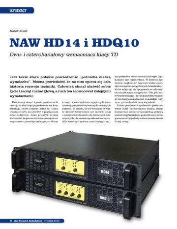 SPRZĘT Marek Kozik NAW HD14 i HDQ10 Dwu- i czterokanałowy wzmacniacz klasy TD Jest takie stare polskie powiedzenie „potrzeba matką wynalazku”. Można powiedzieć, że na nim opiera się cała historia rozwoju techniki. Człowiek chciał ułatwić sobie życie i zaczął ruszać głową, a ruch ten zaowocował kolejnymi wynalazkami. Dziś mamy dosyć wysoki poziom techniczny, co skutkuje pojawianiem się konstrukcji, które jeszcze kilka lat temu uważane były za obiekty z pogranicza science-fiction. Jako praktyk muszę stwierdzić, że proces tworzenia czegoś nowego często przestaje być czystym aktem 36 Live Sound & Installation wrzesień 2015 kreacji, a jest zlepkiem czyjejś myśli technicznej, przystosowywanej do własnych potrzeb. W sumie, po co wyważać otwarte drzwi? Oczywiście nie mówię tutaj o unowocześnieniach czy badaniach rozwojowych – te zawsze są aktem twórczym. Aby stworzyć system monitoringu np., nie potrzeba konstruować nowego typu kamery czy rejestratora. W świecie systemów nagłośnień również widać zjawisko korzystania z gotowych konstrukcji, które adaptuje się i poprawia w celu uzyskania jak najlepszej jakości. Tak, jakości, bowiem uważam, że rynek profesjonalnego scenicznego audio jest w zasadzie jedynym, gdzie do dziś liczy się jakość. Polski producent systemów głośnikowych NAW Performance Audio, chcąc dostarczać odbiorcy kompletny gotowy zestaw nagłaśniający, pokusił się o wzbogacenie swojej oferty o dwa wzmacniacze dużej mocy. NAW HD14 i HDQ10 HD14 ORAZ HDQ10 Wzmacniacze zewnętrznie są bliźniaczo podobne. Zmieszczono je w obudowie wykonanej z blachy stalowej, polakierowanej na kolor czarny, o wysokości 2U. To naprawdę niewielkie rozmiary, biorąc pod uwagę, że konstrukcja HD14 jest wzmacniaczem dwukanałowym, mogącym dostarczyć 7.000 W mocy na kanał przy 2 omach impedancji obciążenia, zaś HDQ10 jest wzmacniaczem czterokanałowym o mocy 2.500 W na kanał, również przy 2 omach. Przednia płyta wzmacniacza wykonana jest z galwanicznie pokrytego stopu lekkiego. Po jej lewej i prawej stronie wykonano szereg otworów zapewniających swobodny przepływ powietrza chłodzącego wnętrze, zaś skrajnie po bokach zamontowano uchwyty transportowe. Oczywiście obudowy obydwu konstrukcji przystosowane są do montażu w skrzyni rack. W centralnej części przedniej płyty umieszczono potencjometry głośności kanałów oraz diody świecące, sygnalizujące stan pracy oraz zabezpieczeń wzmacniacza. W przypadku konstrukcji HD14 potencjometry są dwa, zaś diody sygnalizują doprowadzenie sygnału do wejść, przesterowanie wejść, wyciszenie kanału, konfigurację pracy, zadziałanie zabezpieczenia W centralnej części przedniej płyty umieszczono potencjometry głośności kanałów oraz diody świecące, sygnalizujące stan pracy oraz zabezpieczeń wzmacniacza. termicznego, zabezpieczenia przed pojawieniem się napięcia stałego na wyjściu oraz zadziałania limitera. W przypadku wzmacniacza HDQ10 wskaźniki są takie same, jednak – z uwagi że jest to wzmacniacza czterokanałowy – są cztery takie komplety diod oraz cztery potencjometry. Panel, na którym umieszczono potencjometry i diody, wykonany jest z żółtego laminatu grawerskiego. Grawerowane opisy na panelu są czytelne i bardzo kontrastowe. TYŁ Na tylnej płycie wzmacniacza znajdziemy wylot powietrza chłodzącego wnętrze. Zajmuje on górną część tegoż panelu. W dolnej części umieszczono gniazda wejściowe oraz wyjściowe. I tak na tylnej płycie wzmacniacza HD14 umieszczono dwie pary gniazd XLR – żeńskich (wejścia) i męskich (wyjścia link) XLR. Wyjścia mocy zaś stanowią dwie pary zacisków kolumnowych oraz dwa gniazda Speakon. Z tyłu HD14 umieszczono dwie pary gniazd XLR – żeńskich (wejścia) i męskich (wyjścia link) XLR, wyjścia mocy zaś zrealizowano na dwóch parach zacisków kolumnowych oraz dwóch gniazdach Speakon. Jako że HDQ10 jest wzmacniaczem czterokanałowym, na jego tylnym panelu znajdziemy więcej gniazd – 4 wejściowe i 2 wyjściowe sygnału audio oraz 4 gniazda Speakon. wrzesień 2015 Live Sound & Installation 37 SPRZĘT Na tylnej płycie wzmacniacza HDQ10 znajdują się cztery gniazda wejściowe poszczególnych kanałów, w formie XLR, oraz dwa gniazda wyjściowe LINK dla kanału A oraz C. Wzmacniacze HD14 oraz HDQ10 mogą pracować w trybie parallel – wtedy sygnały z wejść A i B oraz C i D są zlinkowane. Prawdopodobnie dla producenta takie podwójne, biampowe połączenie jest priorytetowe, stąd brak wyjść LINK wejścia B i D. Wyjścia mocy HDQ10 zrealizowano za pomocą czterech 4-polowych gniazd Speakon, przy czym pierwsze gniazdo „wypuszcza” na parze +1/-1 wyjście kanału A, zaś na parze +2/-2 wyjście kanału B. Wyjście kanału B wyprowadzone jest również osobno na drugim Speakonie, na pierwszej parze złączy. Tak samo wygląda organizacja sygnałów na drugiej parze gniazd Speakon, czyli tych, za pomocą których wyprowadzone są sygnały mocy kanałów C i D. Wszystkie gniazda wejściowe oraz wyjściowe są firmy NEUTRIK. Na tylnej płycie znajdują się przełączniki DIP SWITCH, służące do konfiguracji urządzeń. Trzy sekcje DIP SWITCH służą do wyboru czułości wejściowej wzmacniaczy, następne sekcje służą do wyboru sposobu połączenia końcówek. Do wyboru mamy normalną pracę dwukanałową (HD14) czy czterokanałową (HDQ10), pracę przy zrównoleglonych wejściach (parallel) lub mostkową. Oczywiście w przypadku HD14 w konfiguracji Na tylnej płycie znajdują się przełączniki DIP SWICH, służące do konfiguracji urządzeń. parallel otrzymujemy jeden wzmacniacz biampowy lub – jeśli wybierzemy tryb bridge – jeden kanał mostkowy, zaś w przypadku HDQ10 dwa wzmacniacze biamp lub dwa mostkowe. Obydwie konstrukcje wyposażone są w limitery sygnału typu Voltage Peak Limiter, które dają możliwość ustawiania wartości napięcia limitera. I tak na